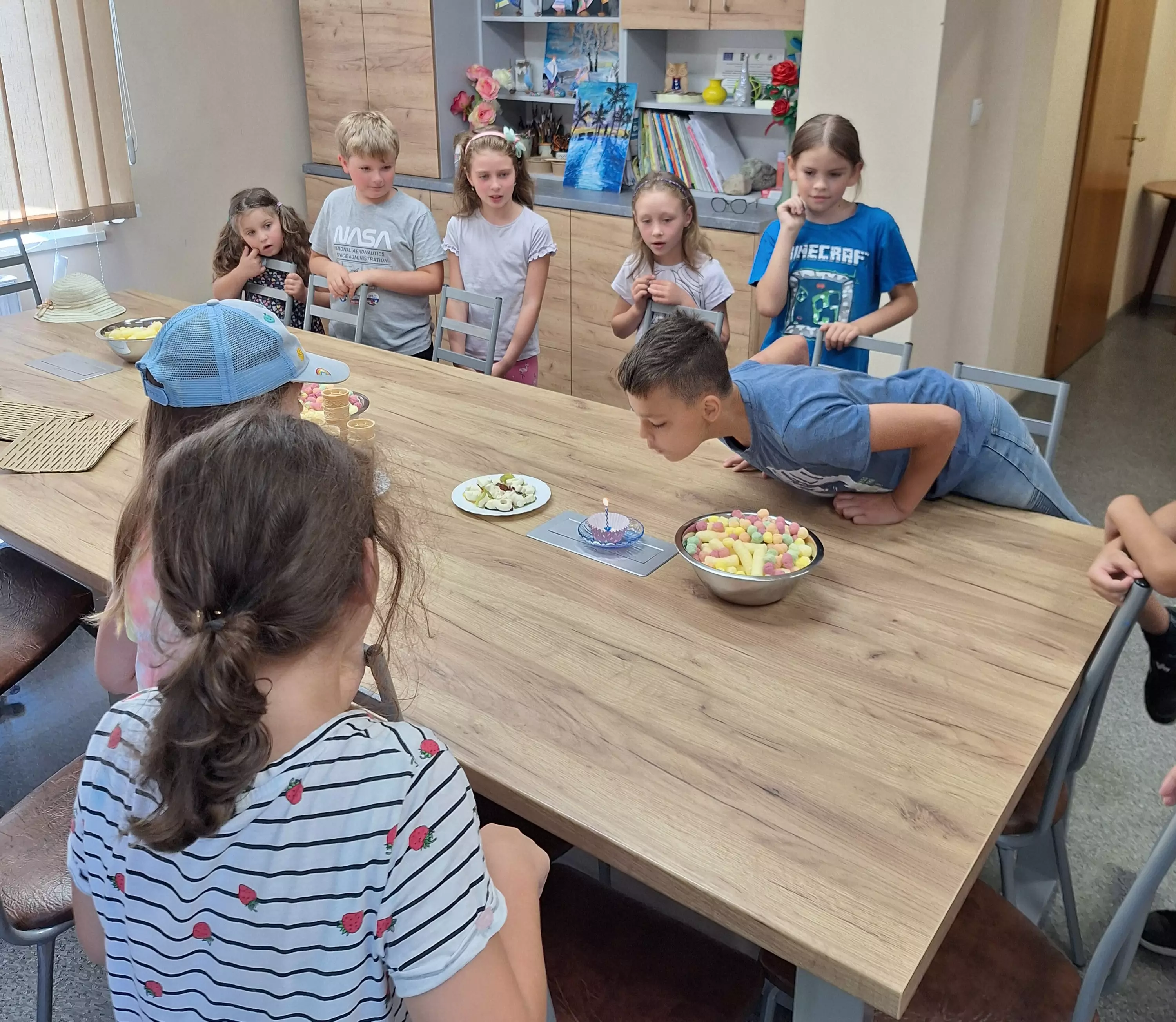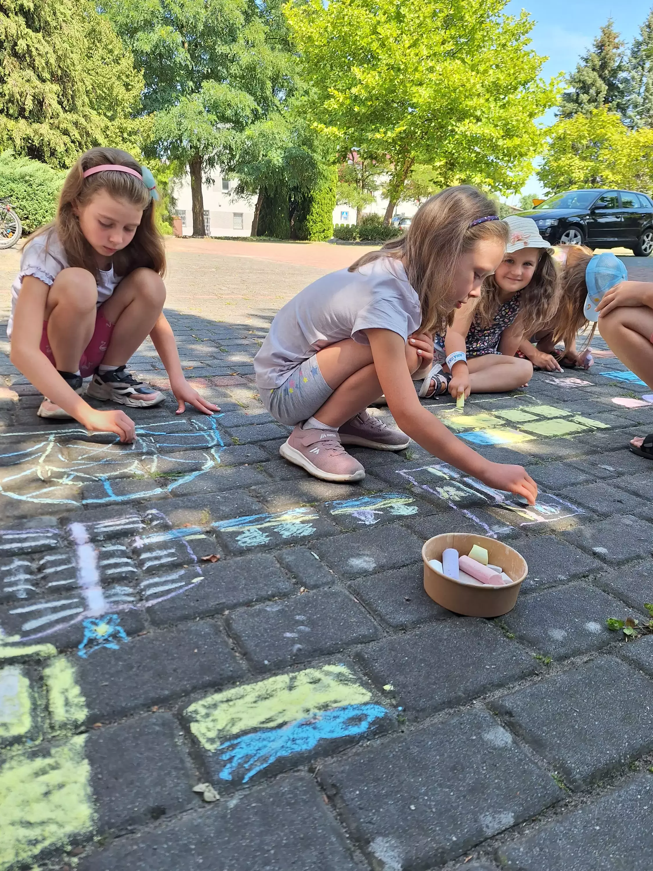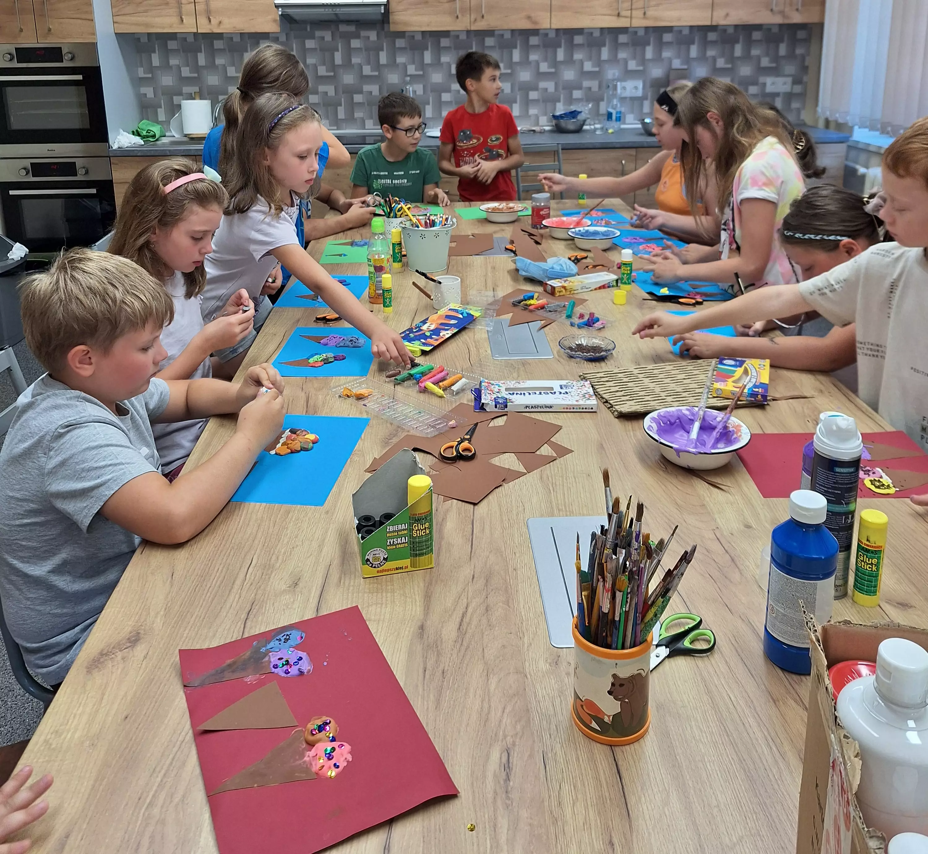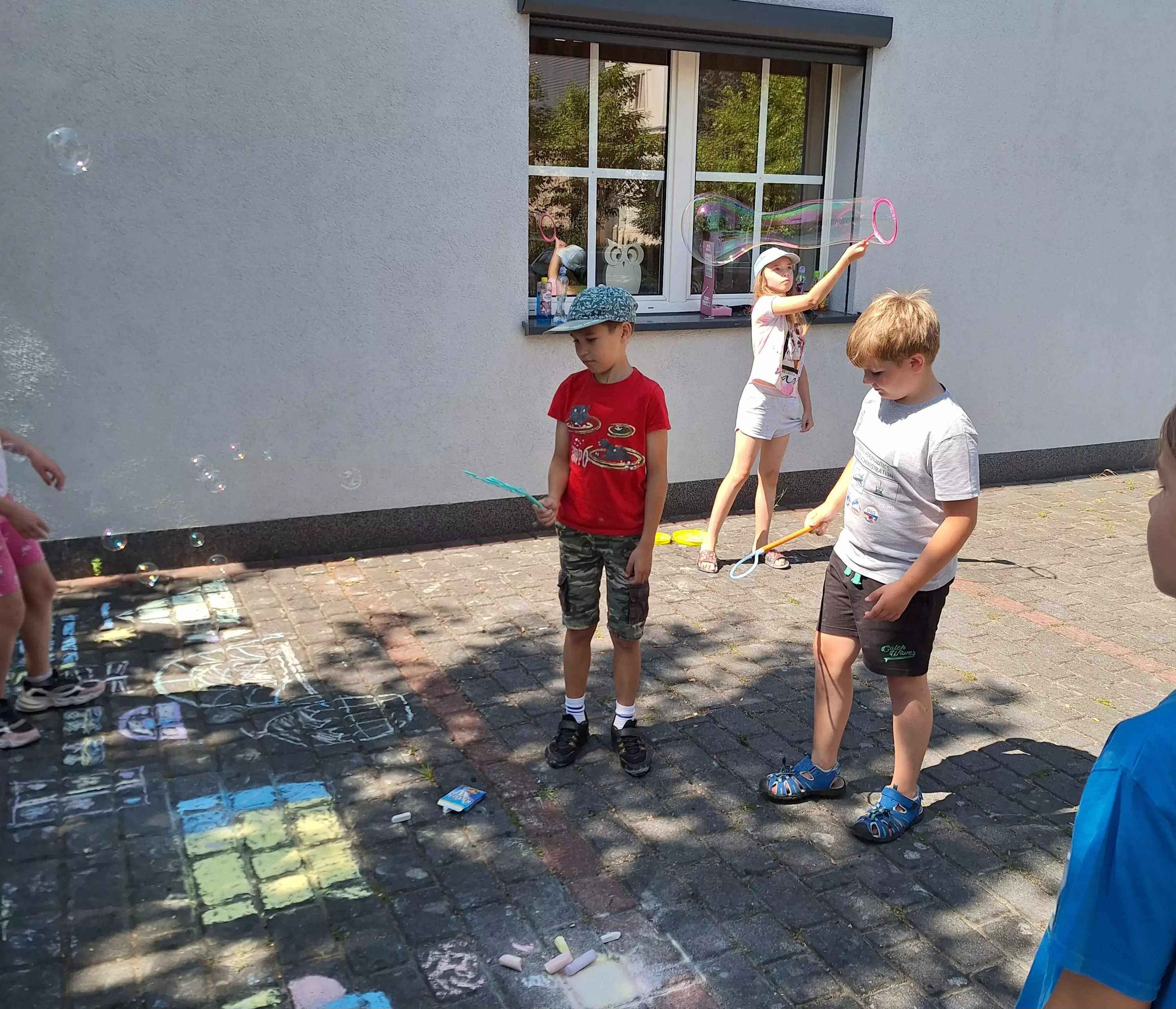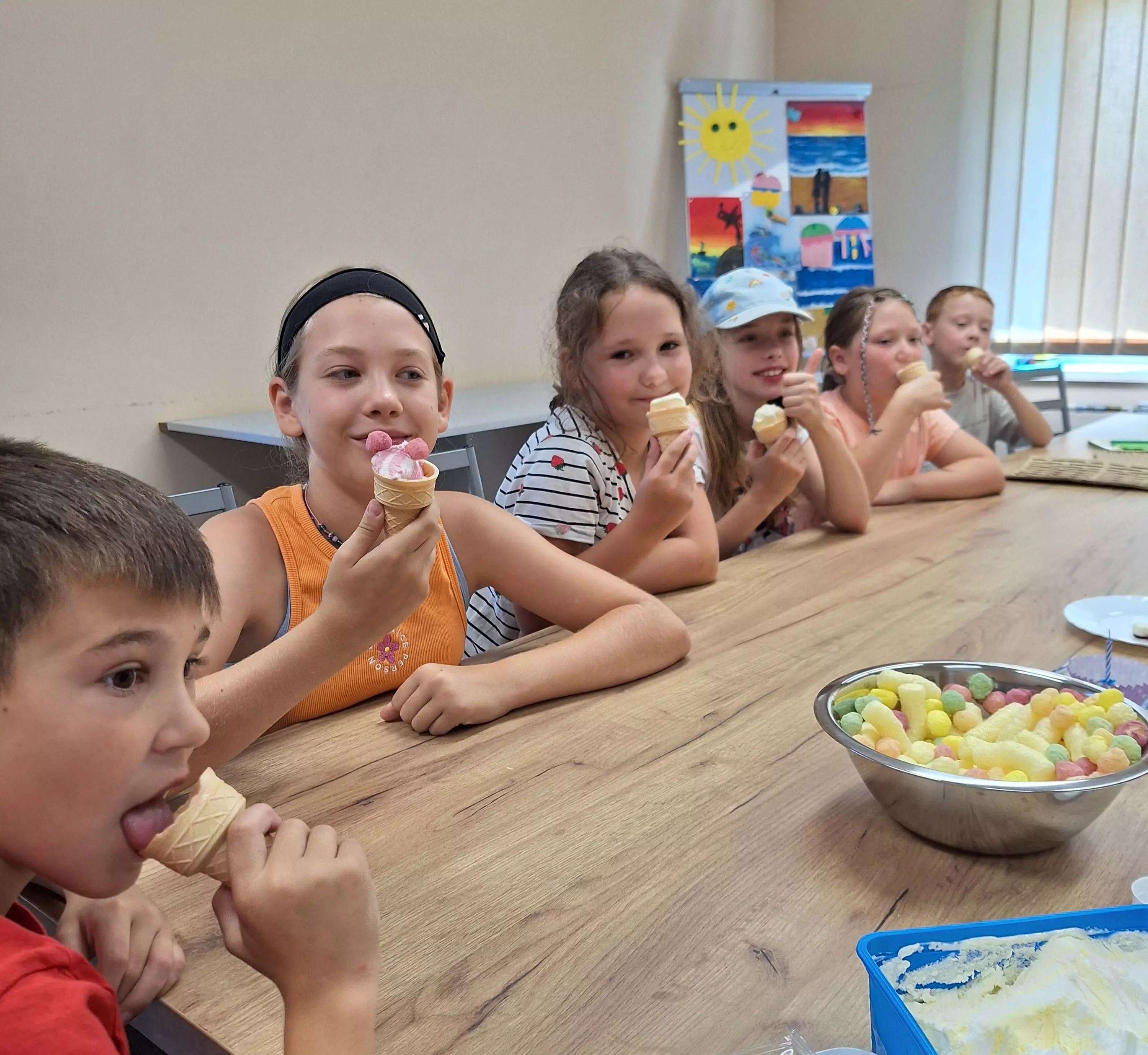 Wczoraj na zajęciach literacko-plastycznych obchodziliśmy półmetek wakacji! Nasze spotkanie rozpoczęliśmy od wspólnego czytania książki o przyjaźni Janosch „Idziemy po skarb” – opowieści o tym, jak Miś z Tygryskiem szukali szczęścia na ziemi. Potem przenieśliśmy się na świeże powietrze, gdzie malowaliśmy kolorowe obrazki kredą na chodniku oraz puszczaliśmy bańki mydlane. Mieliśmy również specjalną okazję – urodziny Mateusza! Zaśpiewaliśmy mu gromkie "Sto lat" i wszyscy cieszyliśmy się z jego święta. Nie mogło zabraknąć pysznych lodów w wafelku, które były idealnym ochłodzeniem w ten ciepły dzień. A na koniec wykonaliśmy lodowe kreacje w ramach pracy plastycznej, używając pianki puffy paint i plasteliny. To był niesamowity dzień pełen zabawy i radości! Dziękujemy wszystkim za udział i już nie możemy doczekać się kolejnych wspólnych przygód!