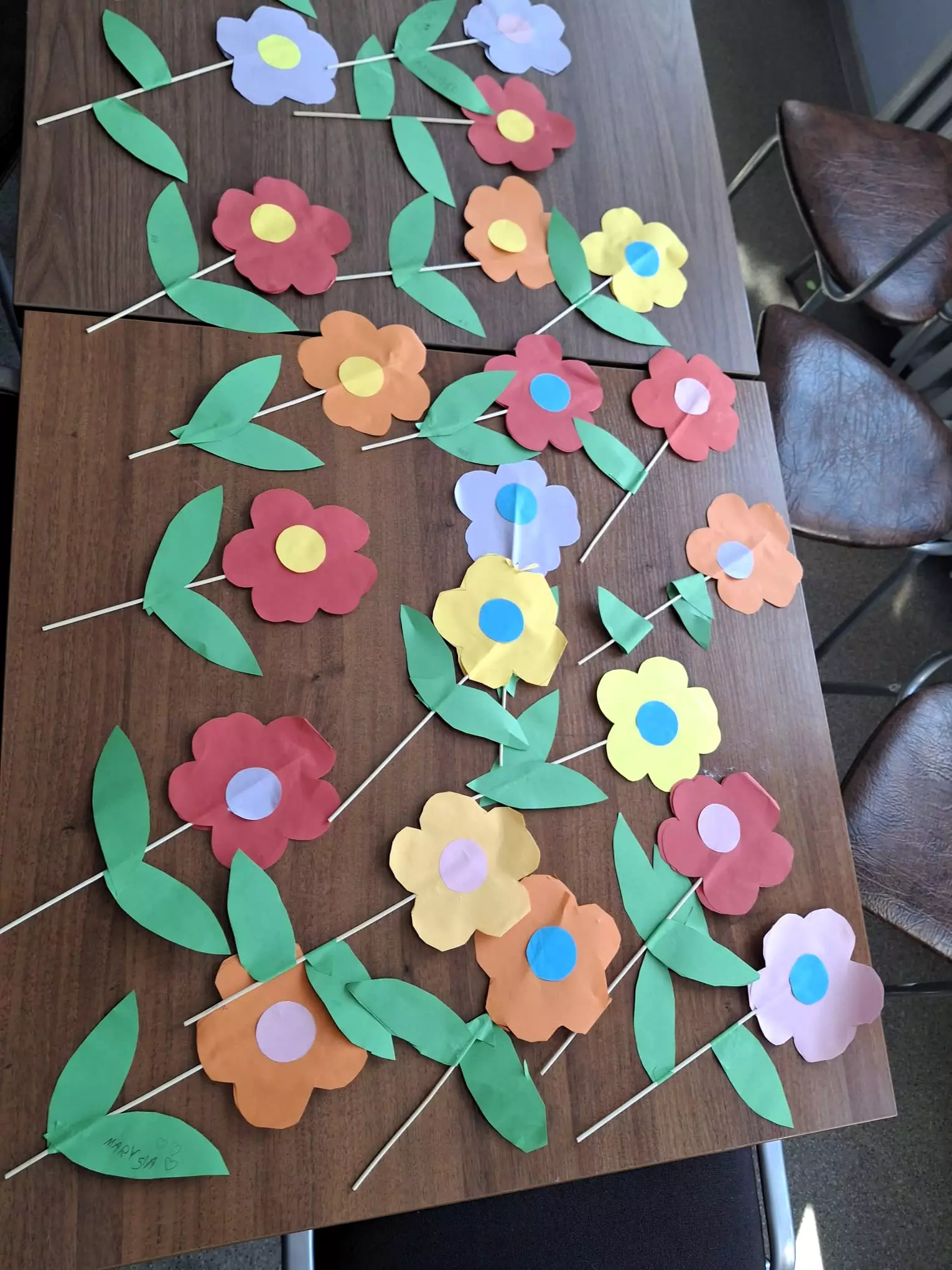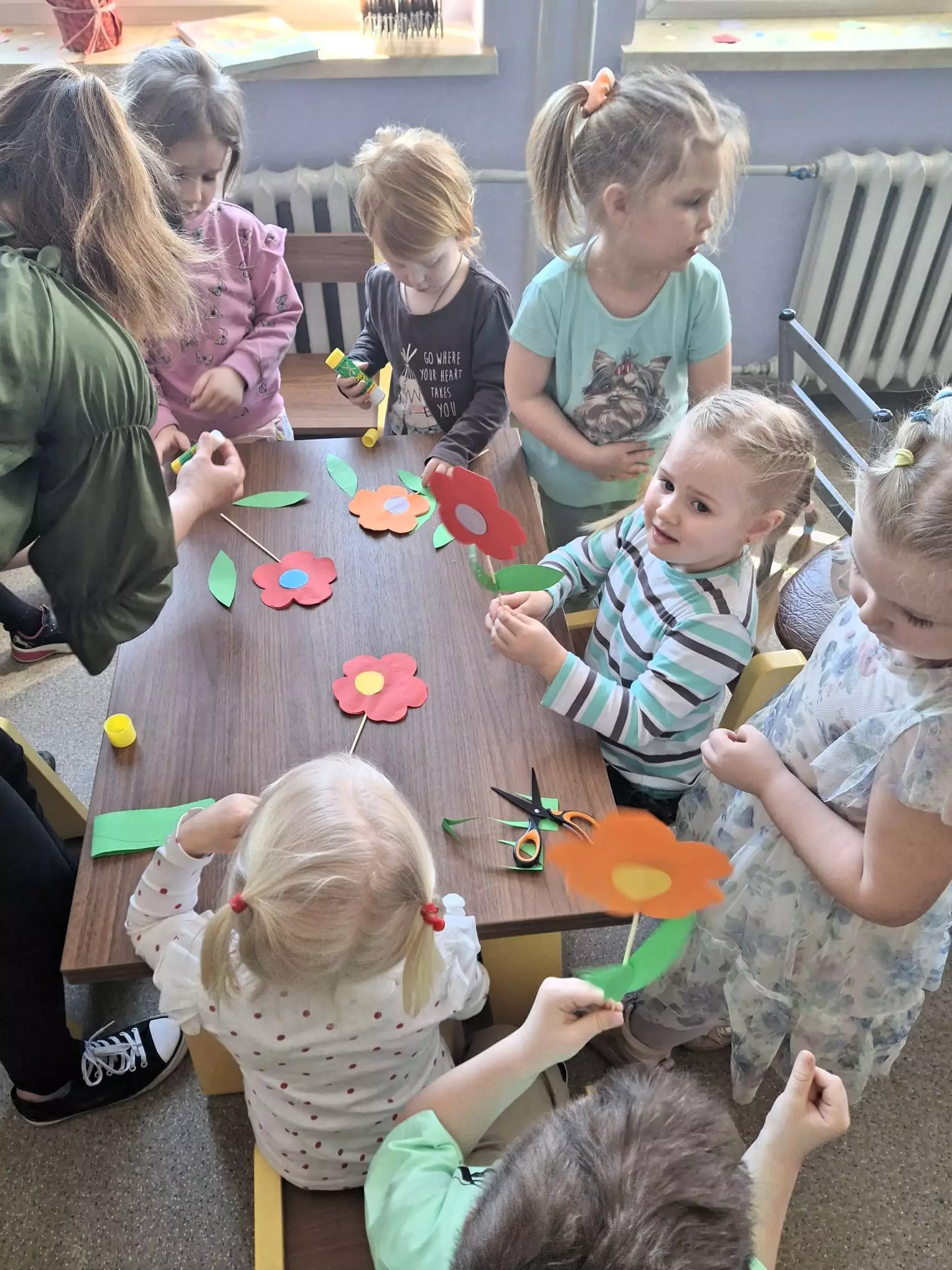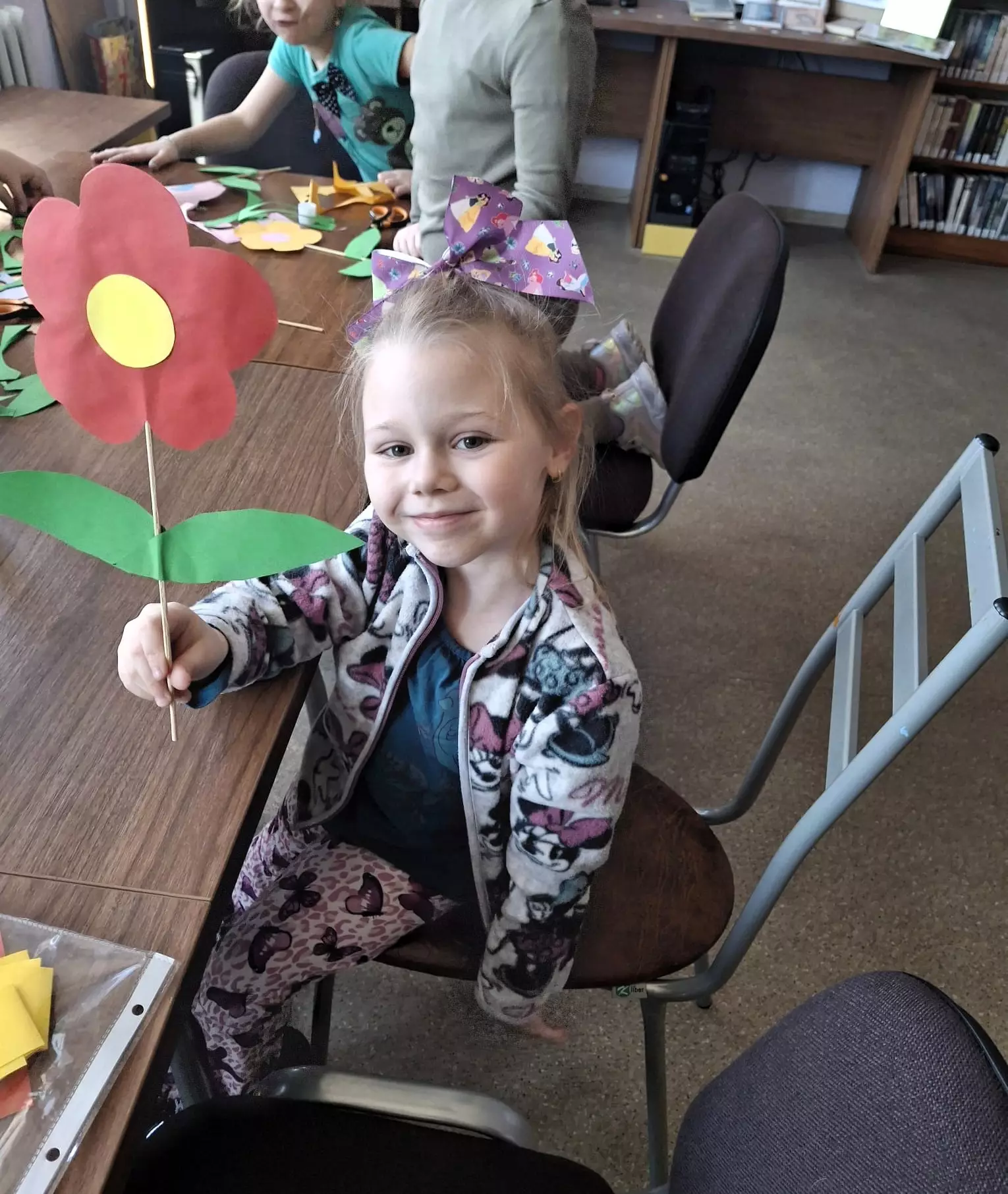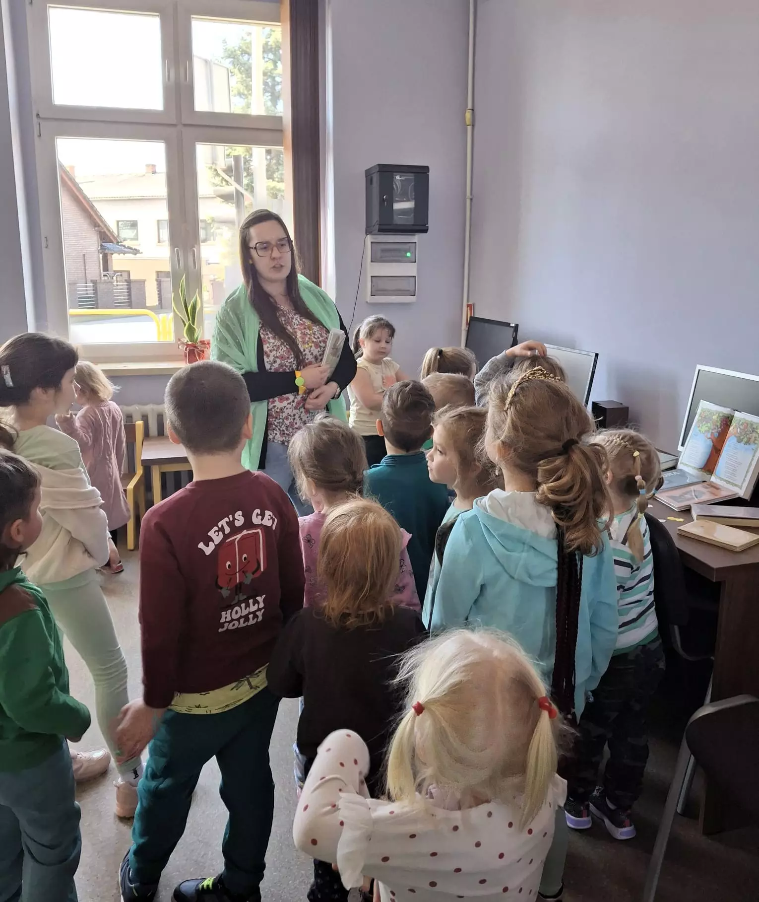 Zdjęcie grupowe po zajęciach w bibliotece.Przedszkolaki chowają Panią Zimę do pudełka.Dzieciaki biorą udział w zabawie.Kwiatki wykonane przez dzieci.Dziewczynki w trakcie wykonywania kwiatków.Dziewczynka ze swoim kwiatkiem na patyku.Chłopaki z kwiatkami.Dziewczynki z kwiatkami.Młodsze dzieci robią kwiatki.Dzieci w trakcie zgadywanek i zabawy ruchowej.Pani bibliotekarka wita dzieci w bibliotece.Dzieci poszukują oznak wiosny.