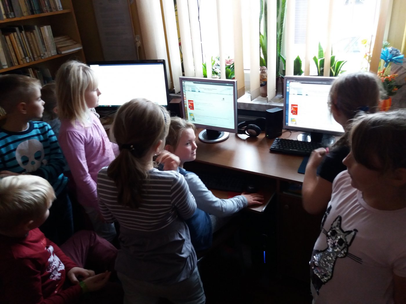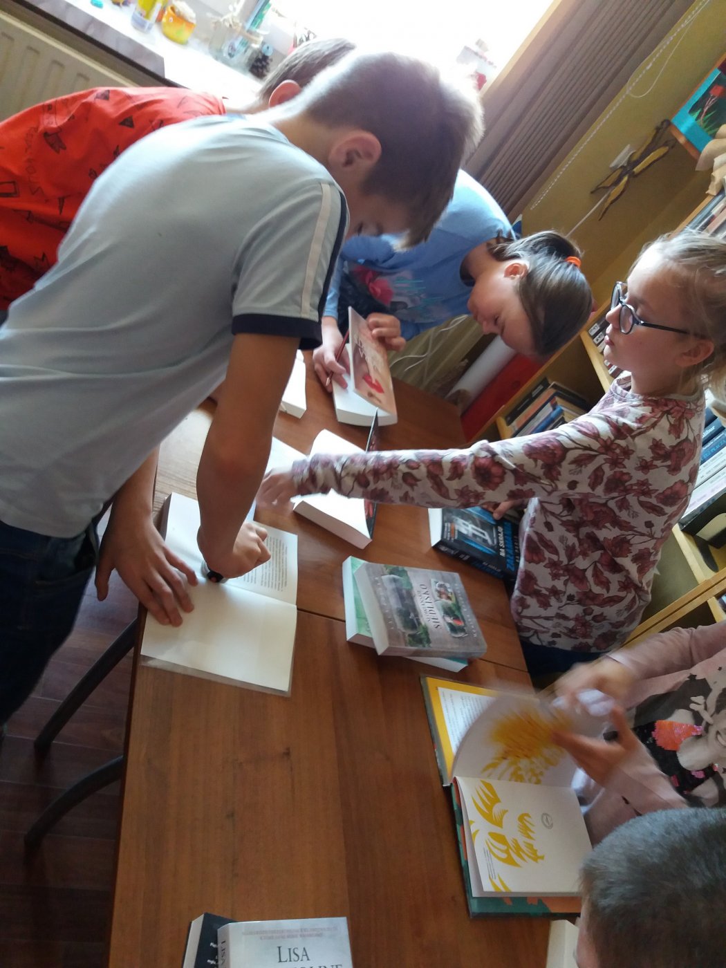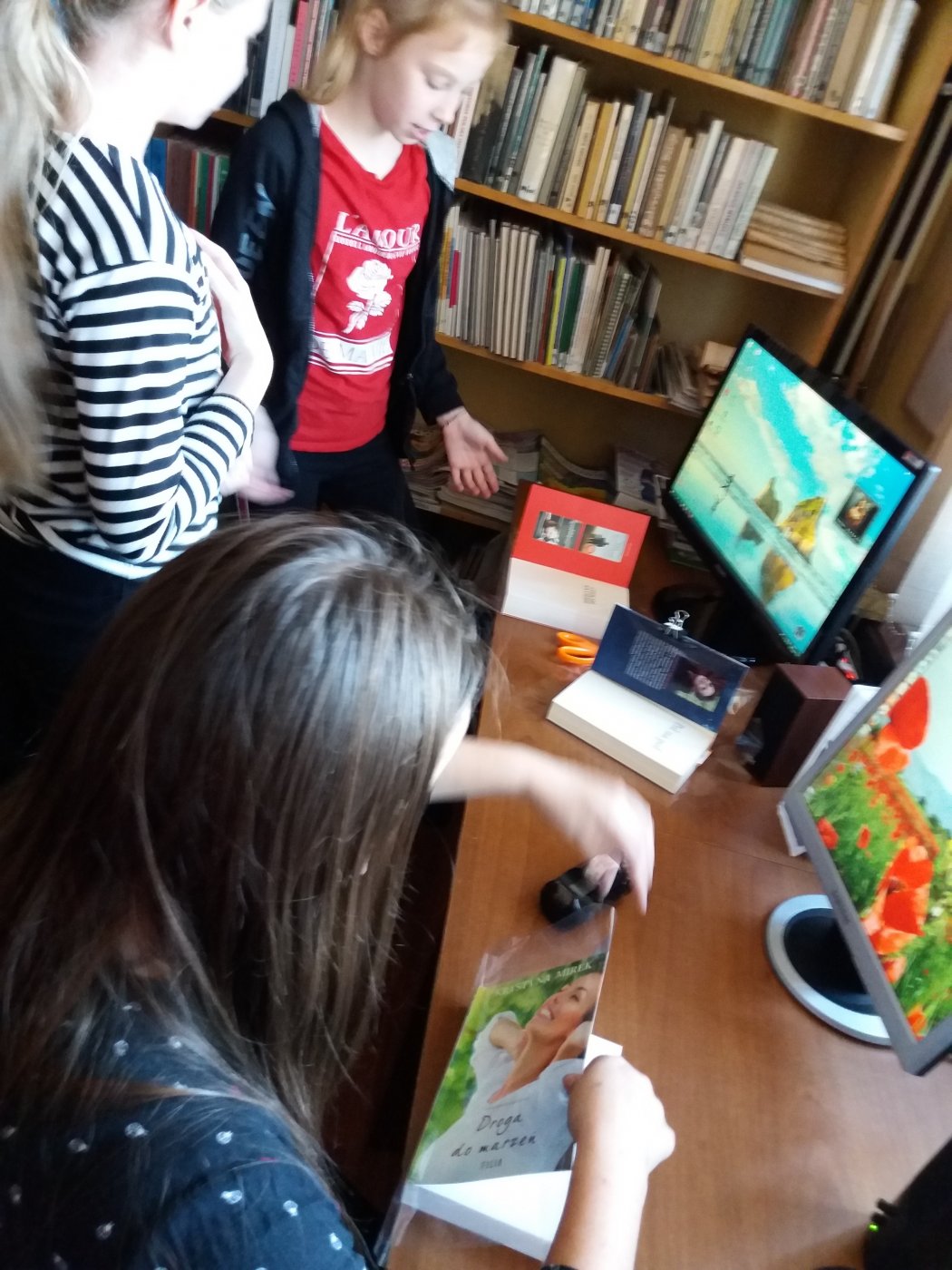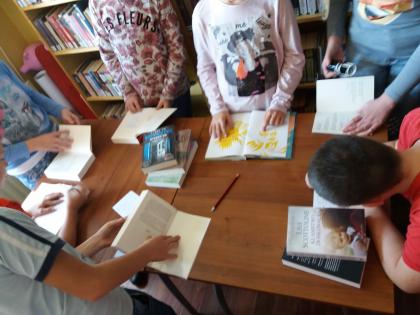 Podczas spotkania w bibliotece Pani Jadwiga opowiedziała uczniom klas I, V, VI o wykonywanym przez siebie zawodzie. Młodzież spróbowała wypisywać karty czytelnika i książki oraz dowiedziała się, które strony publikacji należy pieczętować. Najtrudniejsze okazało się oprawianie folią książek. Uczniowie zapoznali się także z katalogiem elektronicznym, a następnie stosując różne kryteria wyszukiwali w nim lektury.