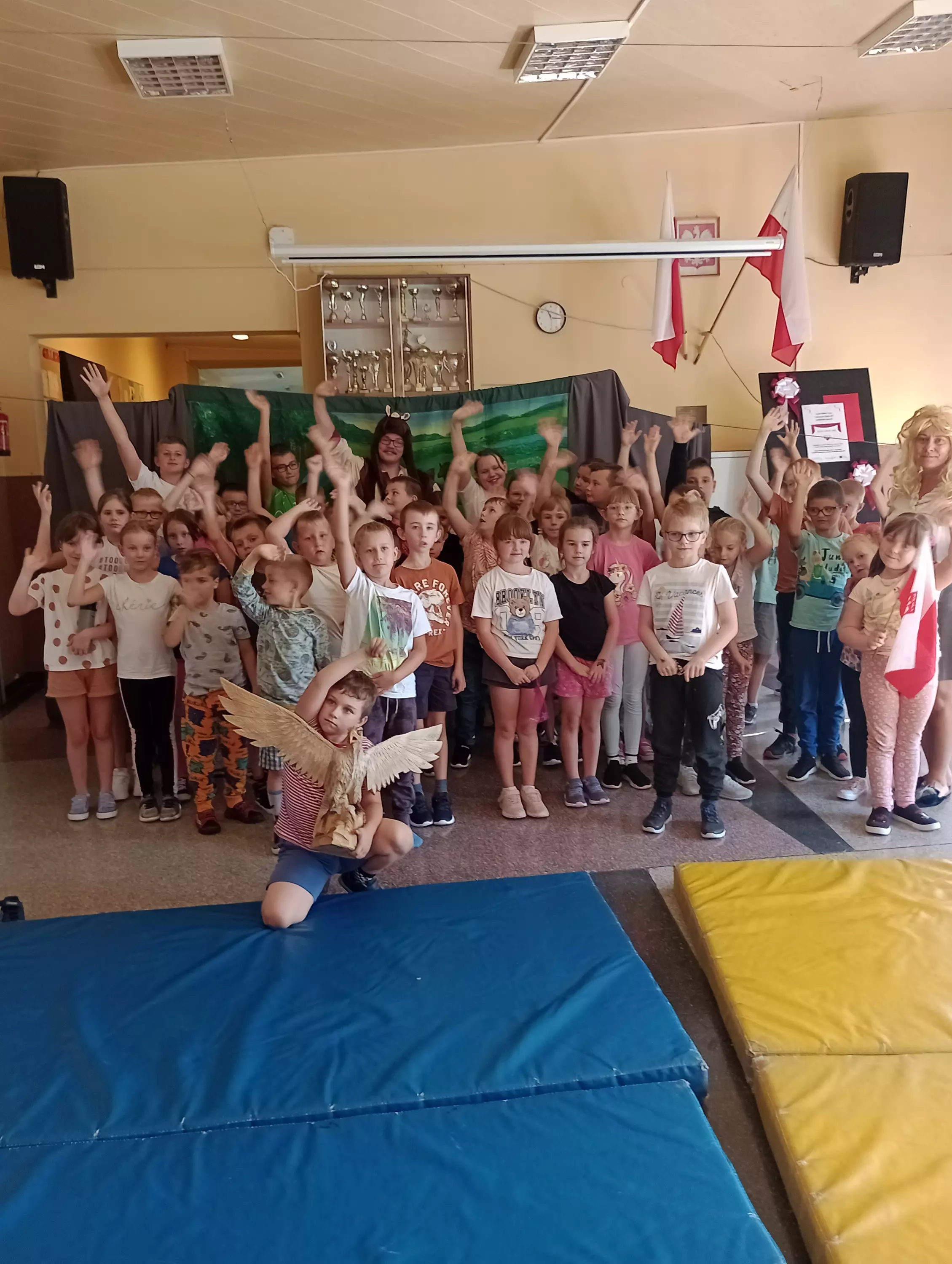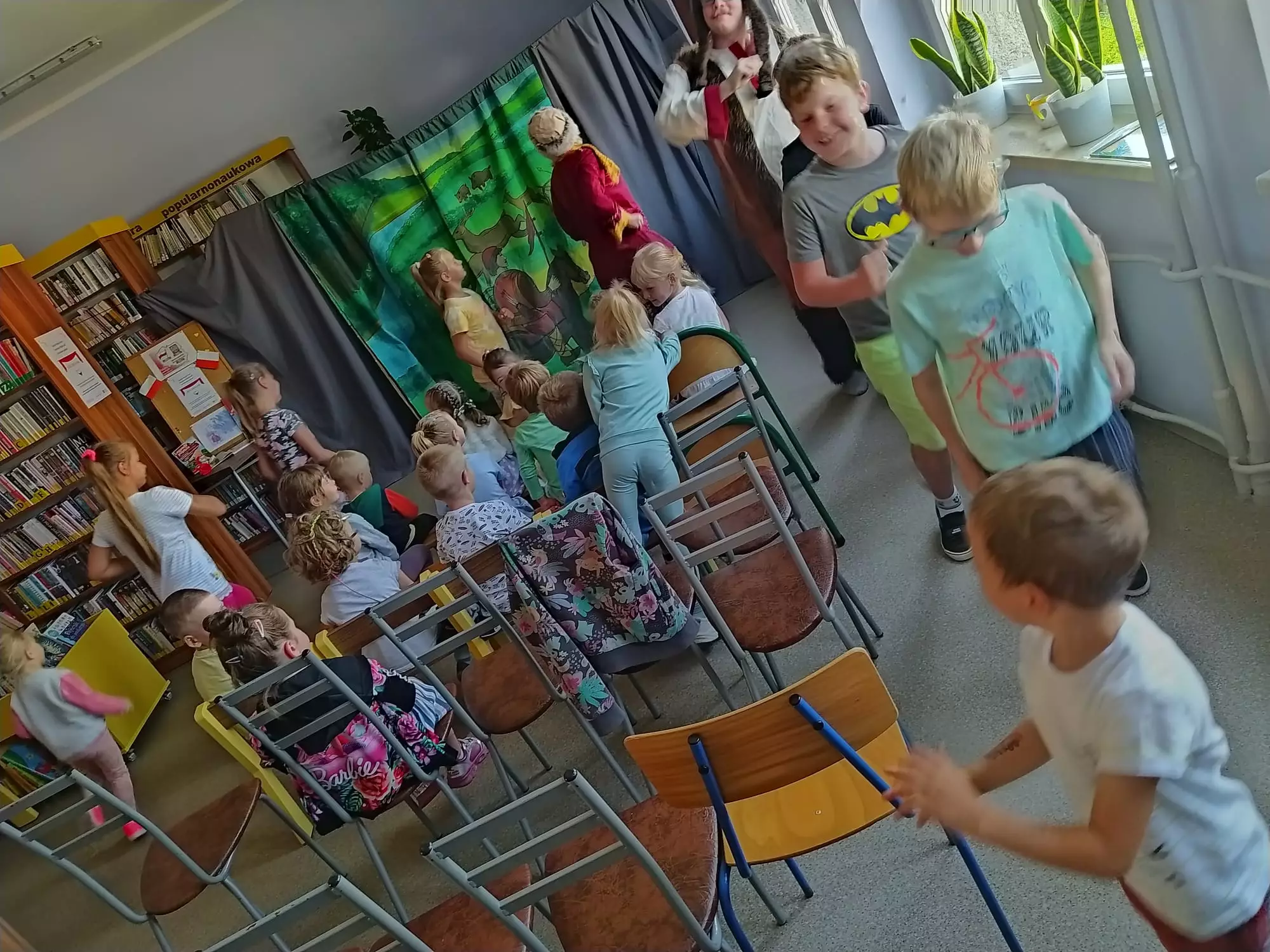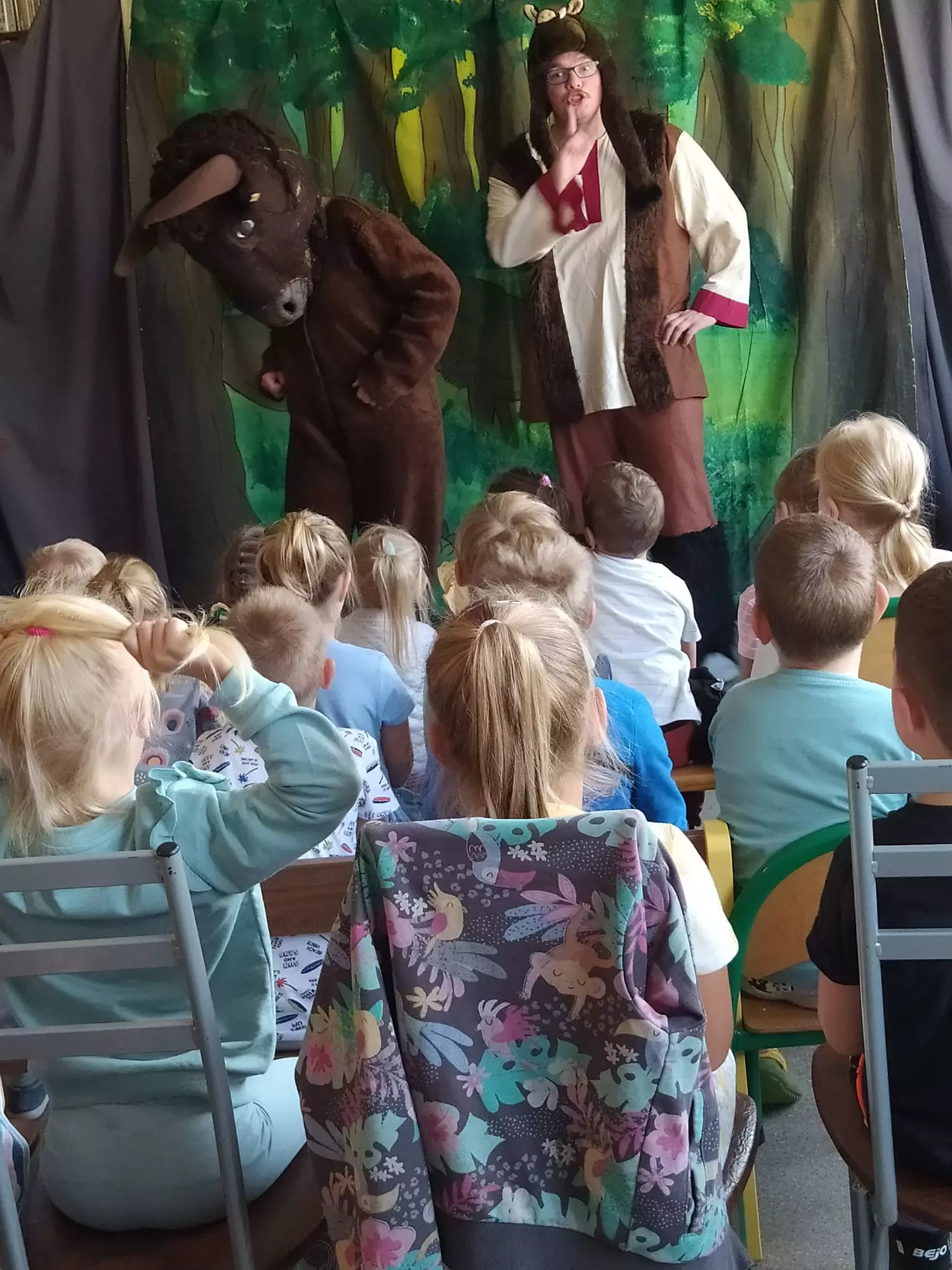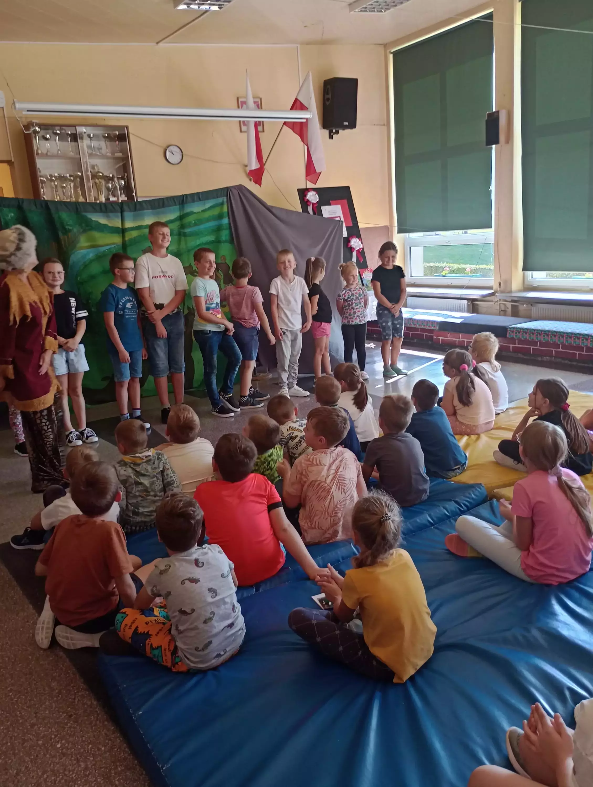 Uczniowie w szkole oglądają przedstawienie teatralne.