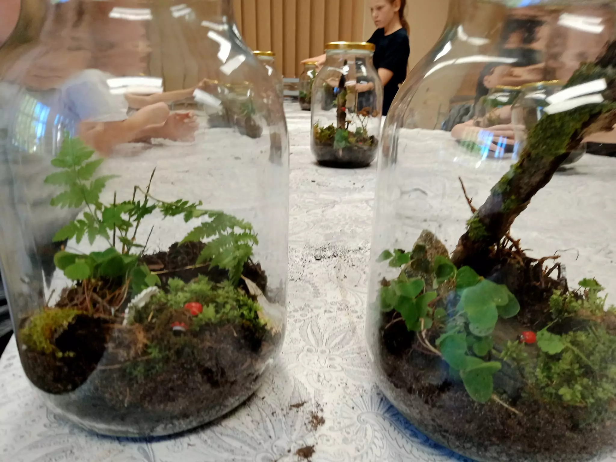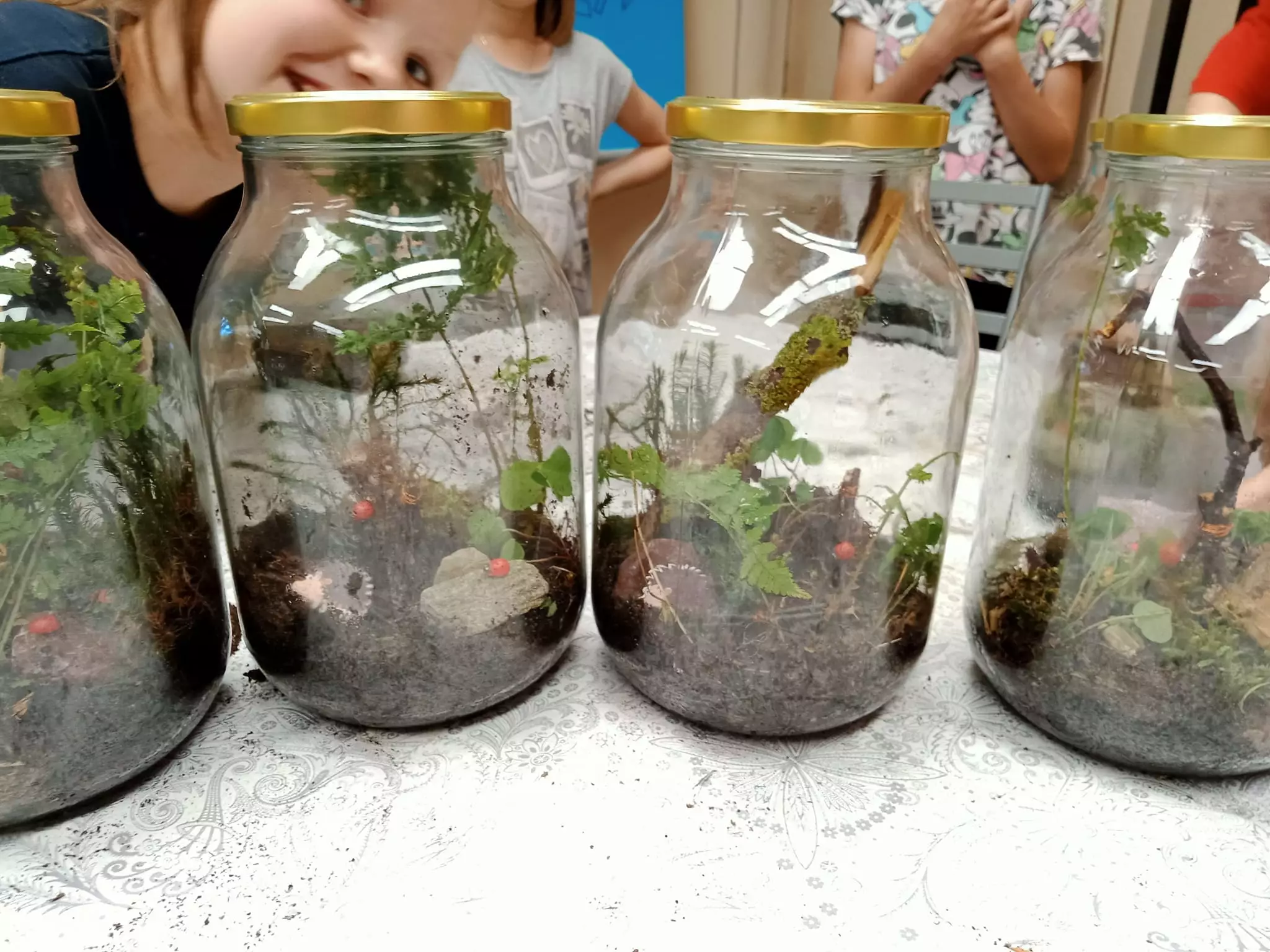 Odbyły się również zajęcia zatytułowane „Las w słoju”, na których uczestnicy wykonali piękne kompozycje z ziemi, roślinek oraz gałązek. Dzięki instrukcjom Pani przyrodnik można było nauczyć jak dbać i pielęgnować takie sadzonki, aby wspaniale rosły w słojach.