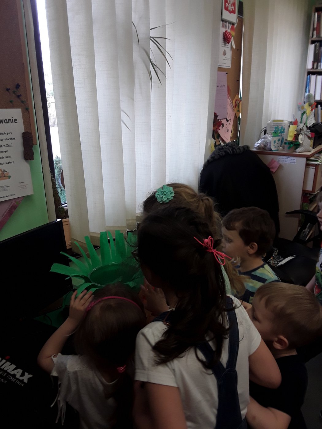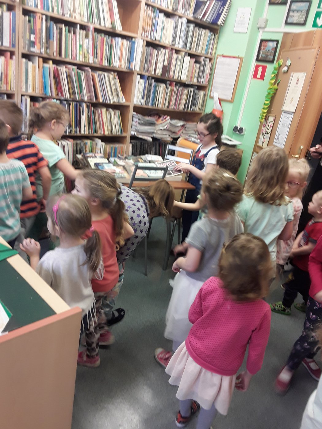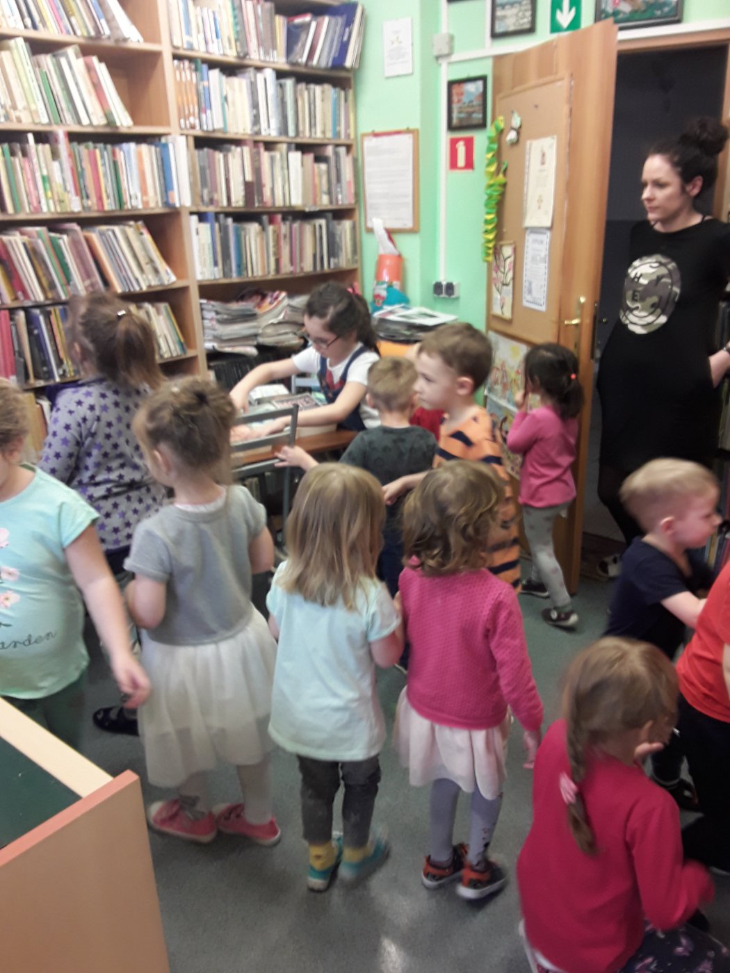 Natomiast 28 marca przedszkolacy przyszli złożyć Pani Bibliotekarce życzenia świąteczne, a następnie szukali między regałami z książkami słodkich niespodzianek od Zajączka.