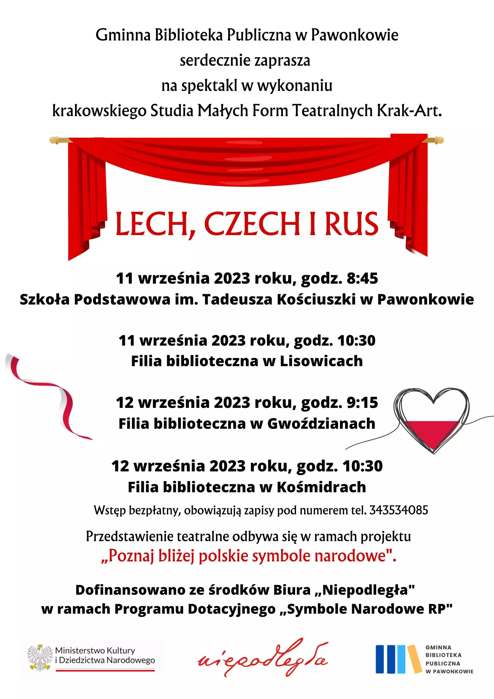W ramach projektu „Poznaj bliżej polskie symbole narodowe" serdecznie zapraszamy na spektakl teatralny „Lech, Czech i Rus”, który odbędzie się: