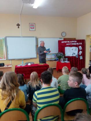 W Tygodniu Bibliotek Pan Andrzej Żak odwiedził również Bibliotekę i Szkołę Podstawową w Gwoździanach. Podczas spotkania z uczniami Pisarz ciekawie opowiadał o swoim życiu i twórczości. Zaprezentował kilka swoich książek oraz przeczytał fragmenty opowieści pirackiej „Kapelusz kapitana Draka”.