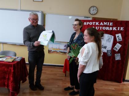 Był też czas na zadawanie pisarzowi pytań, na które starał się wyczerpująco odpowiedzieć. Na zakończenie uczniowie podziękowali za miłe spotkanie, wręczyli kwiaty oraz album z wykonanymi przez nich rysunkami do książek. Piękne ilustracje bardzo się podobały Panu Żakowi, który również podziękował wszystkim za uczestnictwo i sympatyczną atmosferę. Później, już w Bibliotece Pisarz wpisywał dedykacje do swoich utworów.