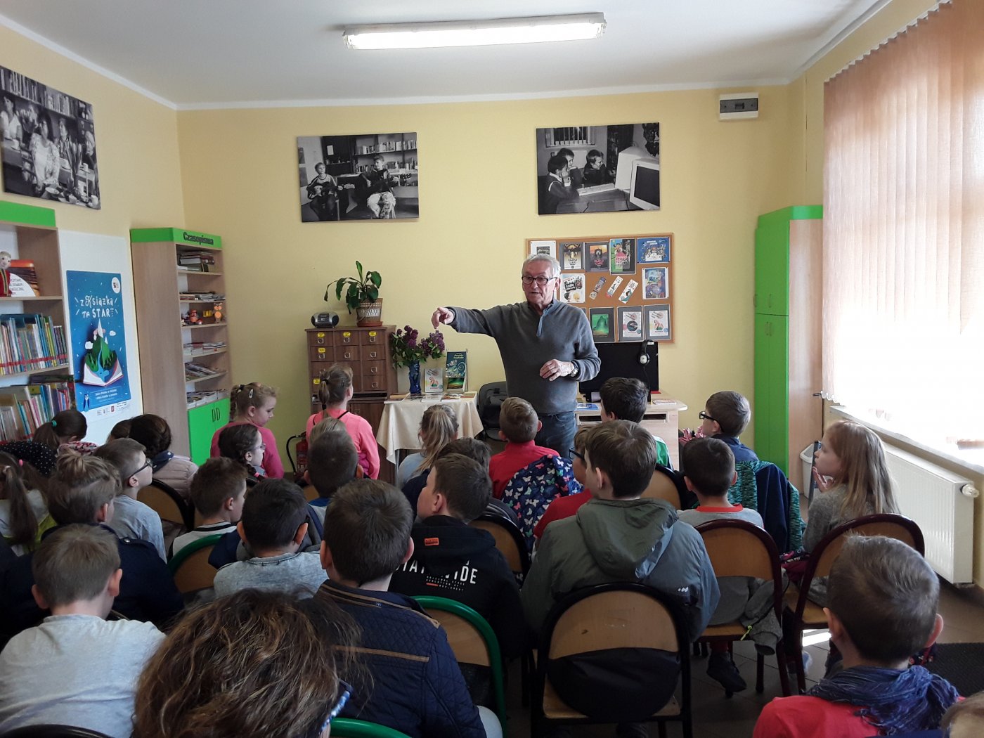 8 maja w Bibliotece w Kośmidrach gościliśmy Pana Andrzeja Żaka, autora publikacji dla dzieci i młodzieży oraz poradników o zdrowiu dla dorosłych. W spotkaniu wzięli udział uczniowie Szkoły Podstawowej w Kośmidrach wraz z nauczycielami. Pisarz opowiedział o sobie i wykonywanym przez siebie zawodzie oraz o całym procesie tworzenia. Podkreślił jak ważną rolę w publikacjach dla najmłodszych czytelników, obok tekstu, spełnia ilustracja, która często zachęca do sięgnięcia po daną książkę. Mówił o tym skąd czerpie pomysły i inspiracje. Autor zaprezentował swoje książki, przedstawił okoliczności ich powstania, ich bohaterów i miejsce akcji. Miło było wysłuchać fragmentów czytanych przez naszego gościa. Uczniowie zainteresowali się publikacjami, zadawali ich autorowi mnóstwo pytań, na które Pan Andrzej chętnie odpowiadał. Zachęcał również wszystkich do czytania książek, które są źródłem wiedzy o ludziach i o świecie oraz które pobudzają i rozwijają wyobraźnię. Spotkanie upłynęło w sympatycznej i wesołej atmosferze. Na zakończenie serdecznie podziękowano i wręczono Panu Żakowi kwiaty. Natomiast Panie z okazji Dnia Bibliotekarza otrzymały od uczniów przepiękne laurki z życzeniami i kwiatki. Za miłe spotkanie serdecznie wszystkim uczestnikom dziękujemy.