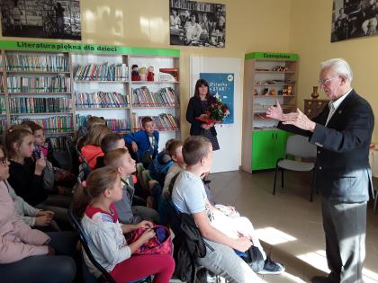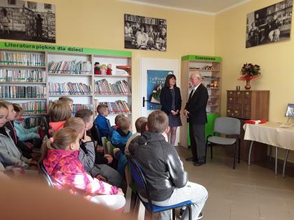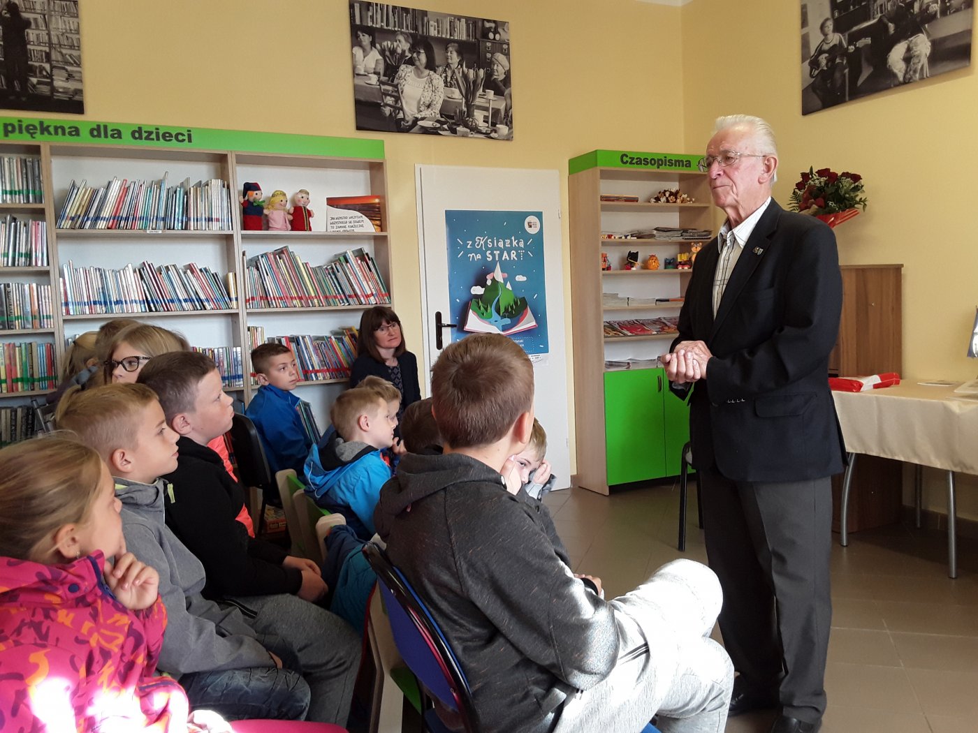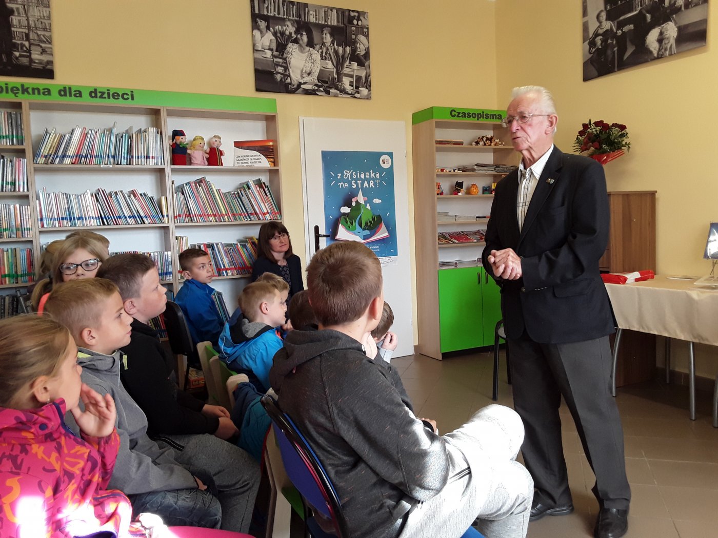 Na spotkanie przybyli uczniowie klas IV -VII Szkoły Podstawowej i ich nauczyciele. Pan Jan Myrcik bardzo interesująco i barwnie opowiadał zebranym o dziejach Śląska, a szczególnie naszego regionu w świetle przypadającej w tym roku 100 rocznicy niepodległości Polski. Opowiadał o swoim dzieciństwie, nauce w szkole niemieckiej i polskiej, o swojej rodzinie i przyjaciołach. Podkreślił to, iż należy być dumnym ze swojej małej ojczyzny, regionu z którego się pochodzi, kochać go i szanować. Zapraszał wszystkich do Koszęcina, do założonego przez siebie Ośrodka Kultury i Edukacji Regionalnej z Śląską Izbą Regionalną, galerią stroju ludowego, stałą ekspozycją starej śląskiej książki, kartografii, podręczników, eksponatami starośląskiego kuźnictwa, a także minilapidarium Krzyża.
