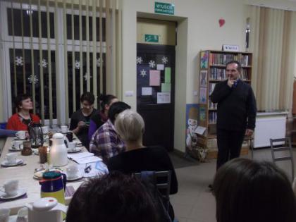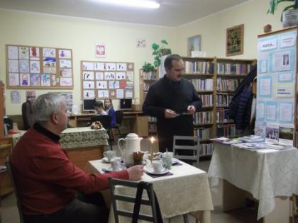 Następnie poeta opowiedział zebranym o swojej twórczości literackiej, a także o pracy w wydawnictwie, którego jest dyrektorem. Przedstawił kilka swoich utworów oraz zaprezentował książki wydane ostatnio w Wydawnictwie Św. Macieja Apostoła w Lublińcu.