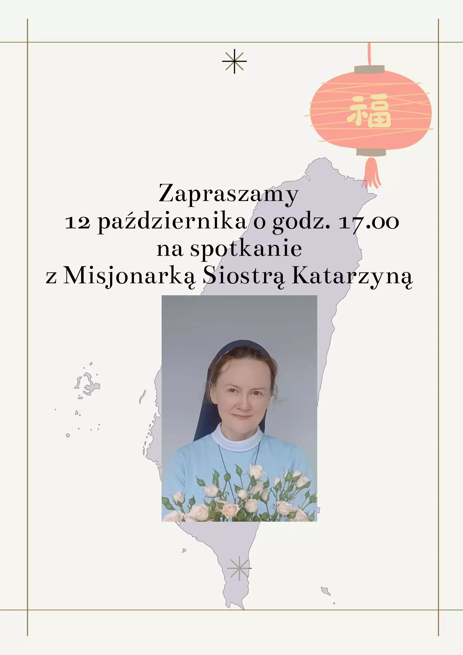 Serdecznie zapraszamy na spotkanie z Siostrą Katarzyną Kubica w GBP w Pawonkowie 12 października o godz. 17.00. Siostra na co dzień żyje i pracuje na Tajwanie.