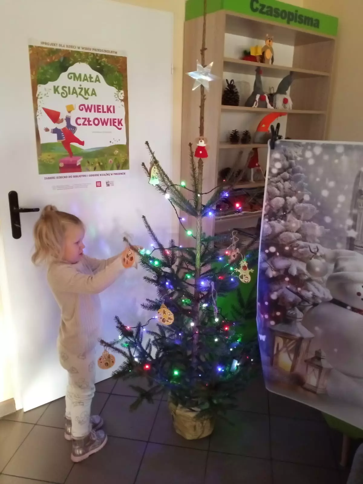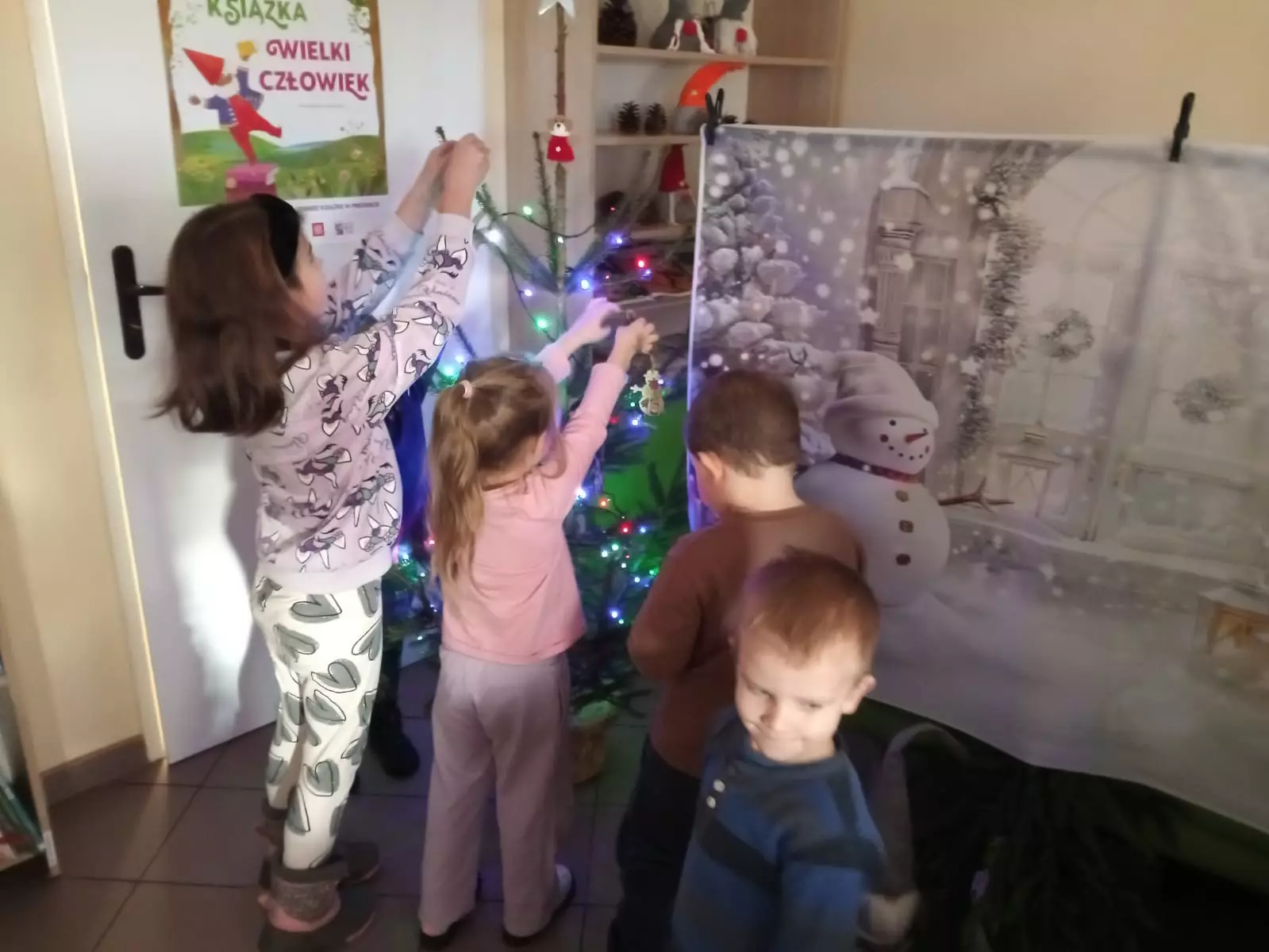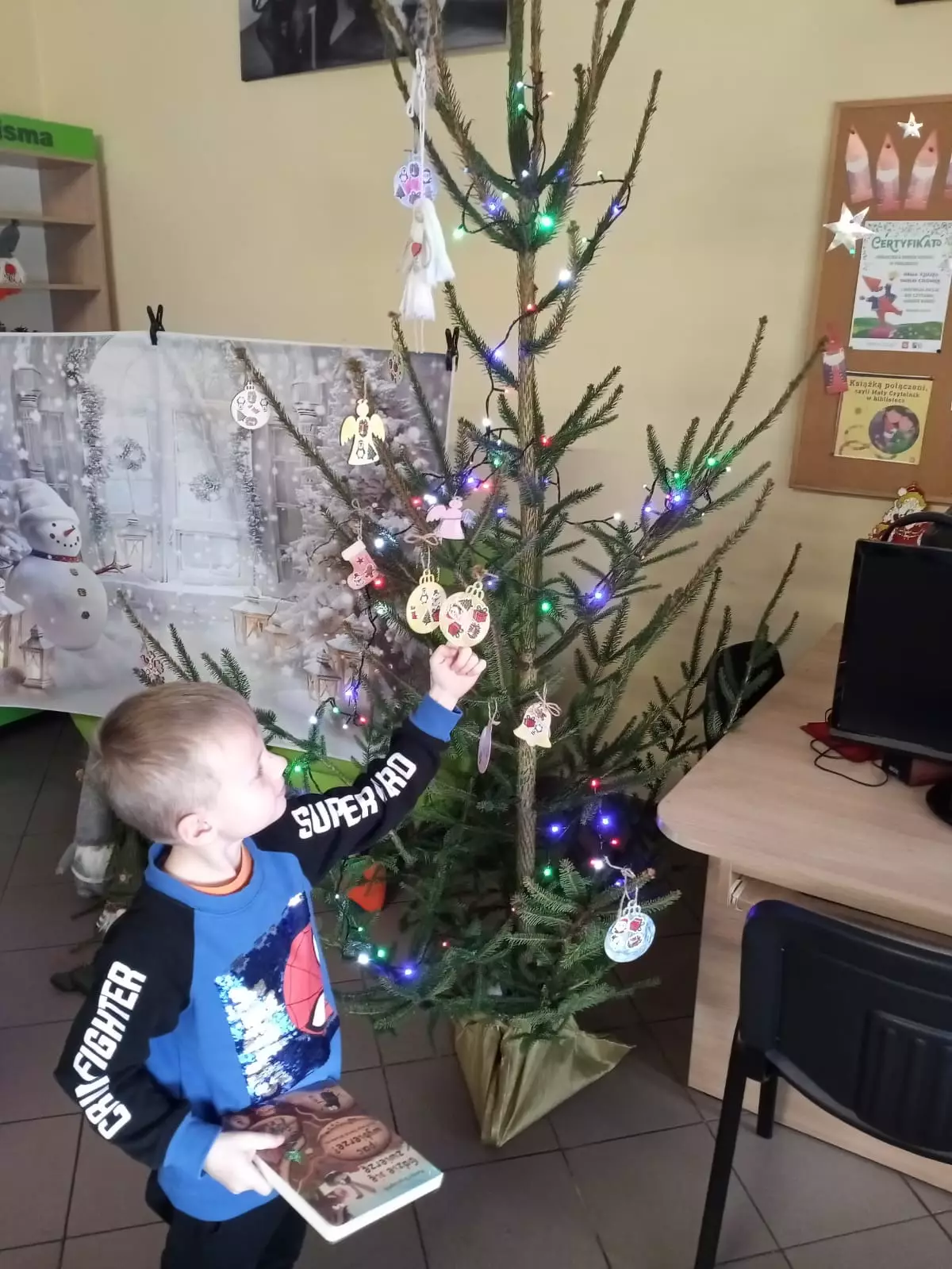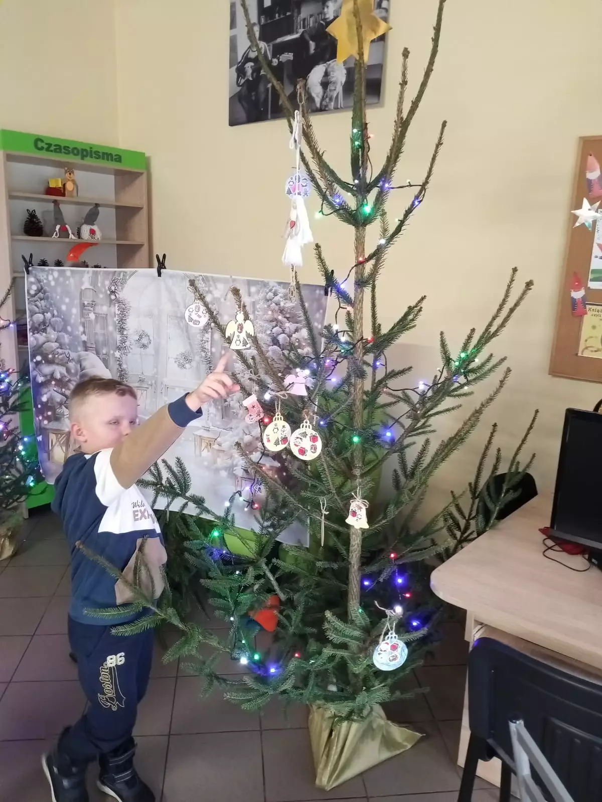 Przy dźwiękach świątecznych piosenek dzieci z wielkim zaangażowaniem zawieszały wykonane przez siebie ozdoby.