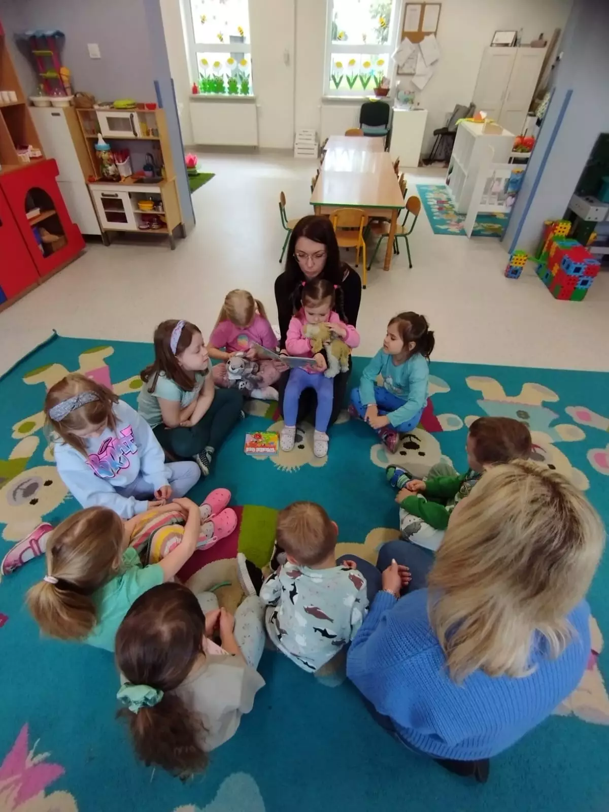 Pani bibliotekarka czyta na dywanie w przedszkolu książeczkę dzieciom.