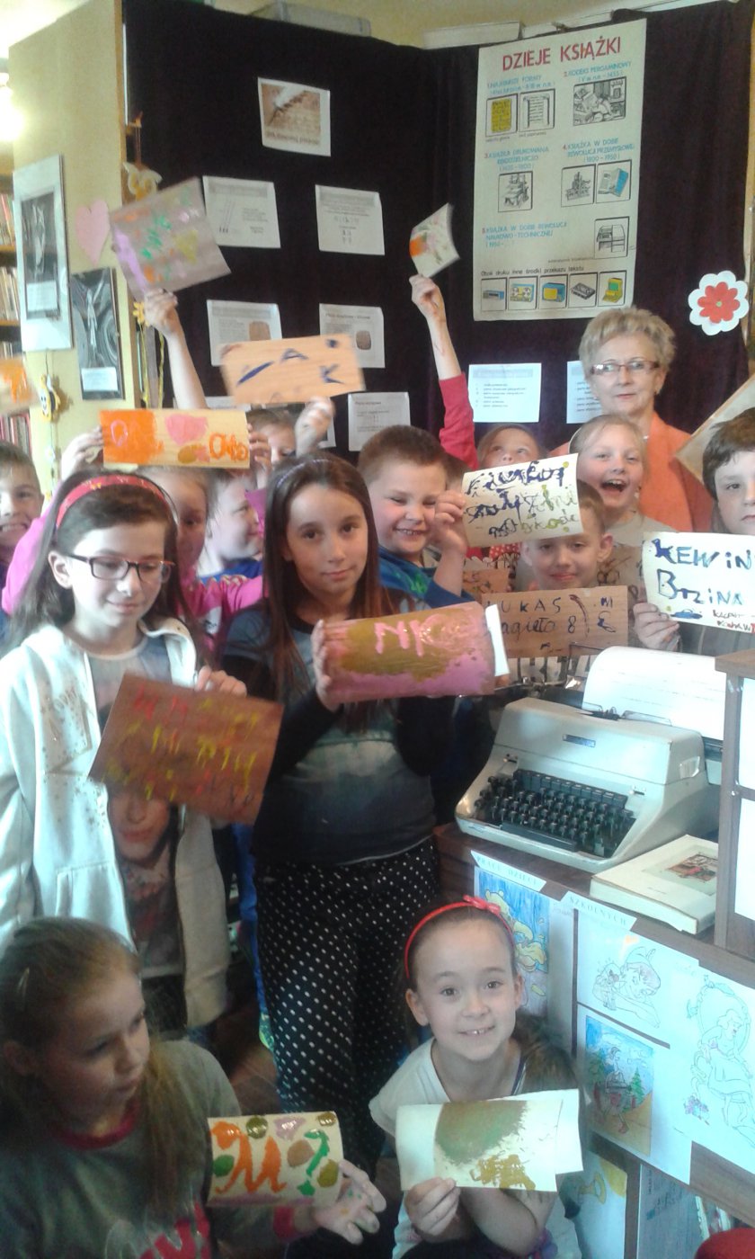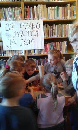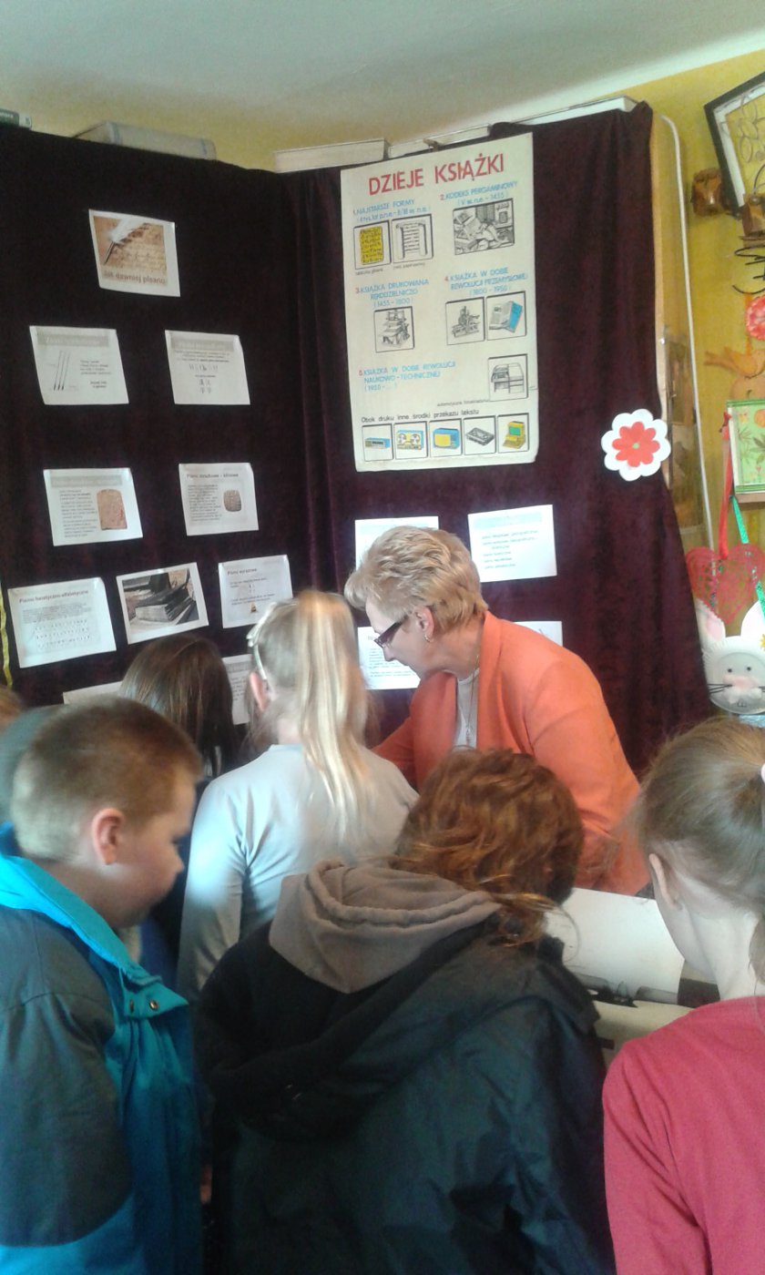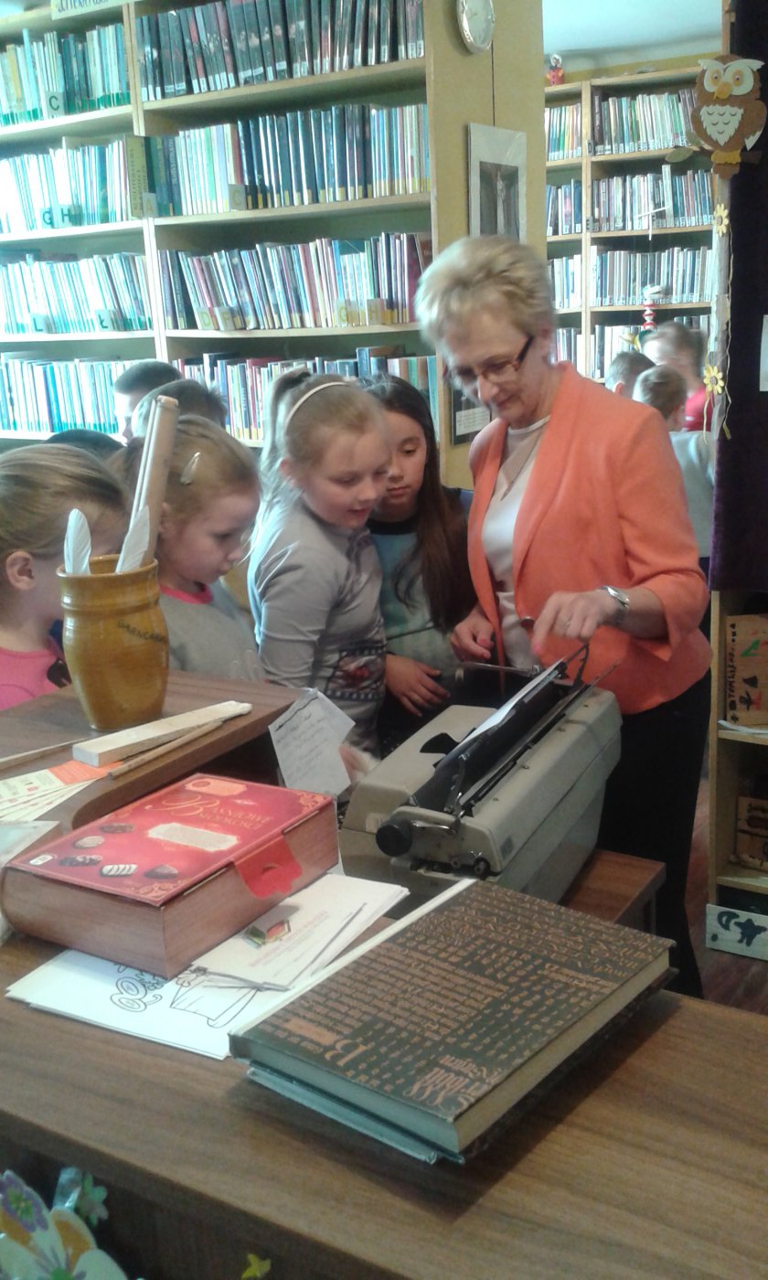 Z okazji Światowego Dnia Książki i Praw Autorskich w dniach 22.04 oraz 25.04.2016r. w bibliotece w Gwoździanach bibliotekarka Jadwiga Kukowka przeprowadziła pogadankę z uczniami klasy I oraz klasy II i III Szkoły Podstawowej na temat "Dziejów Książki" oraz dawnych technik i materiałów pisarskich.