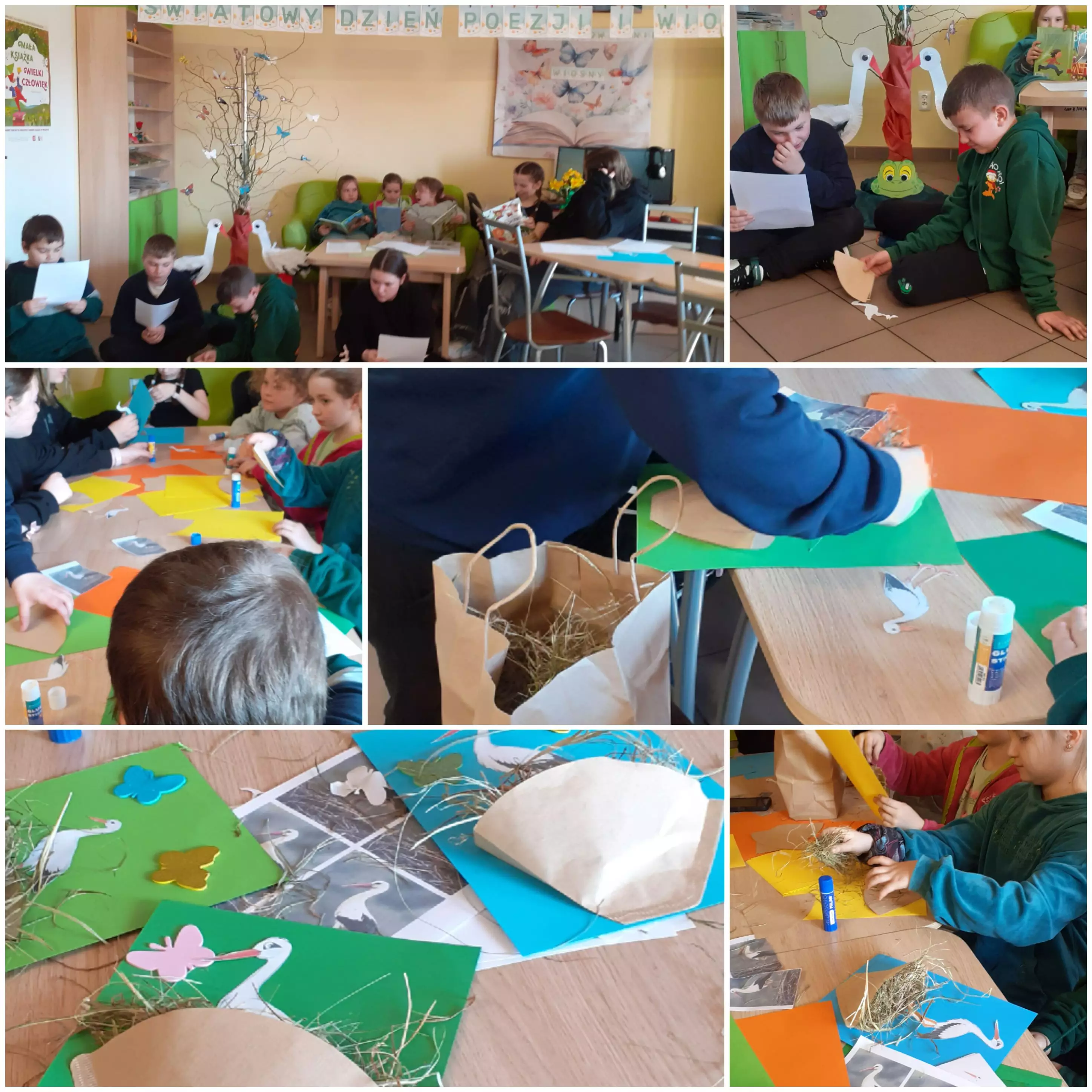 Kolaż zdjęć z zajęć bibliotecznych.