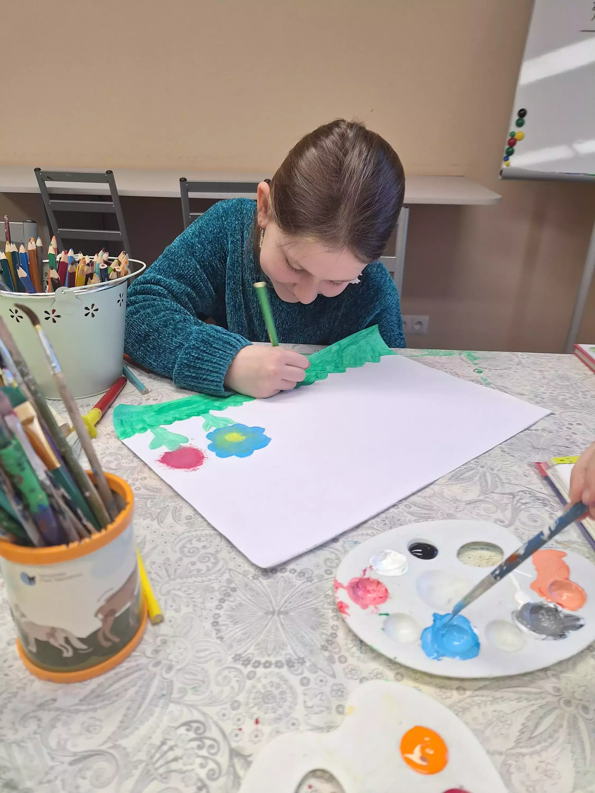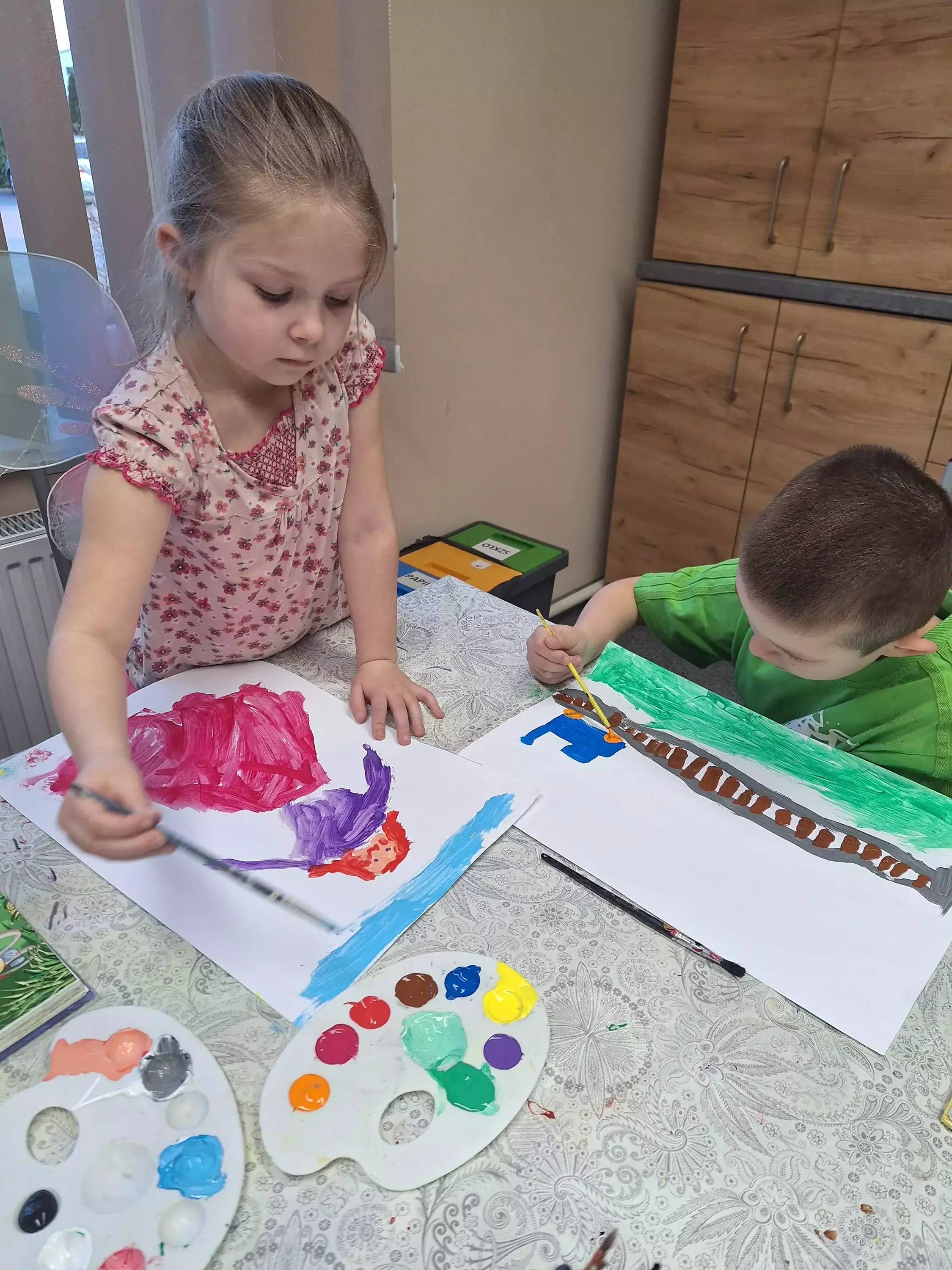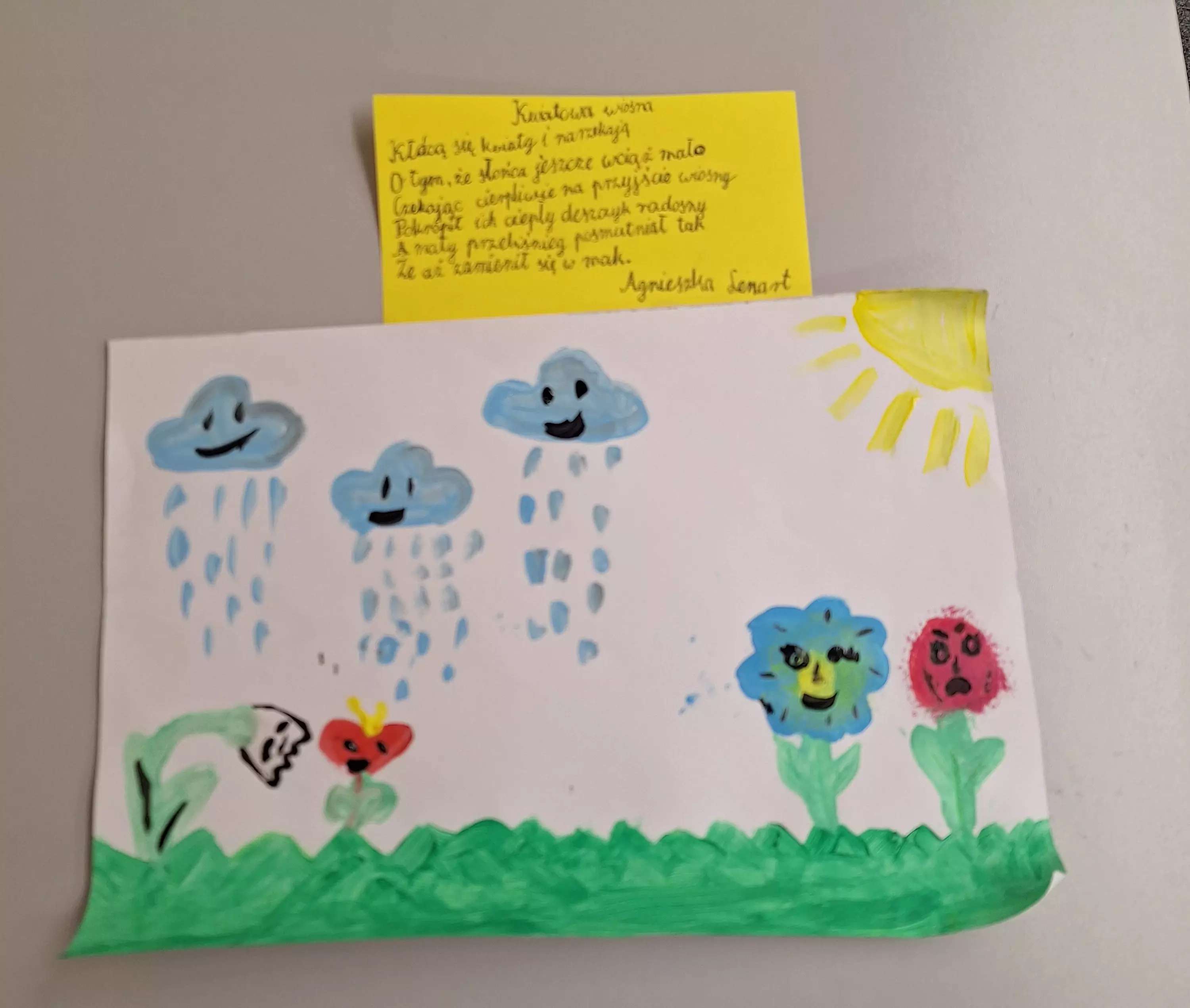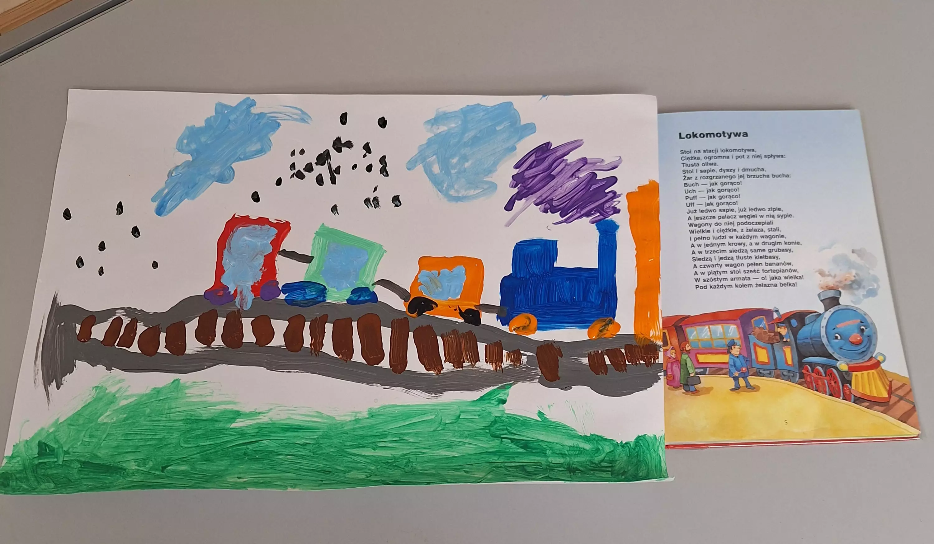 W czwartek obchodziliśmy Światowy Dzień Poezji. Dzieci uzbrojone w pędzle, farby i inne materiały zanurzyły się w procesie tworzenia i malowały prace, które odzwierciedlały interpretację treści czytanych wierszy. Dzieło Szymona powstało na podstawie wiersza Juliana Tuwima „Lokomotywa”, Olka narysowała Panią Wiosnę bazując na wierszu Jana Brzechwy „Przyjście wiosny”. A Agnieszka najpierw stworzyła swoje dzieło a następnie napisała wiersz, który odzwierciedlał historię przedstawioną na obrazku. Brawo