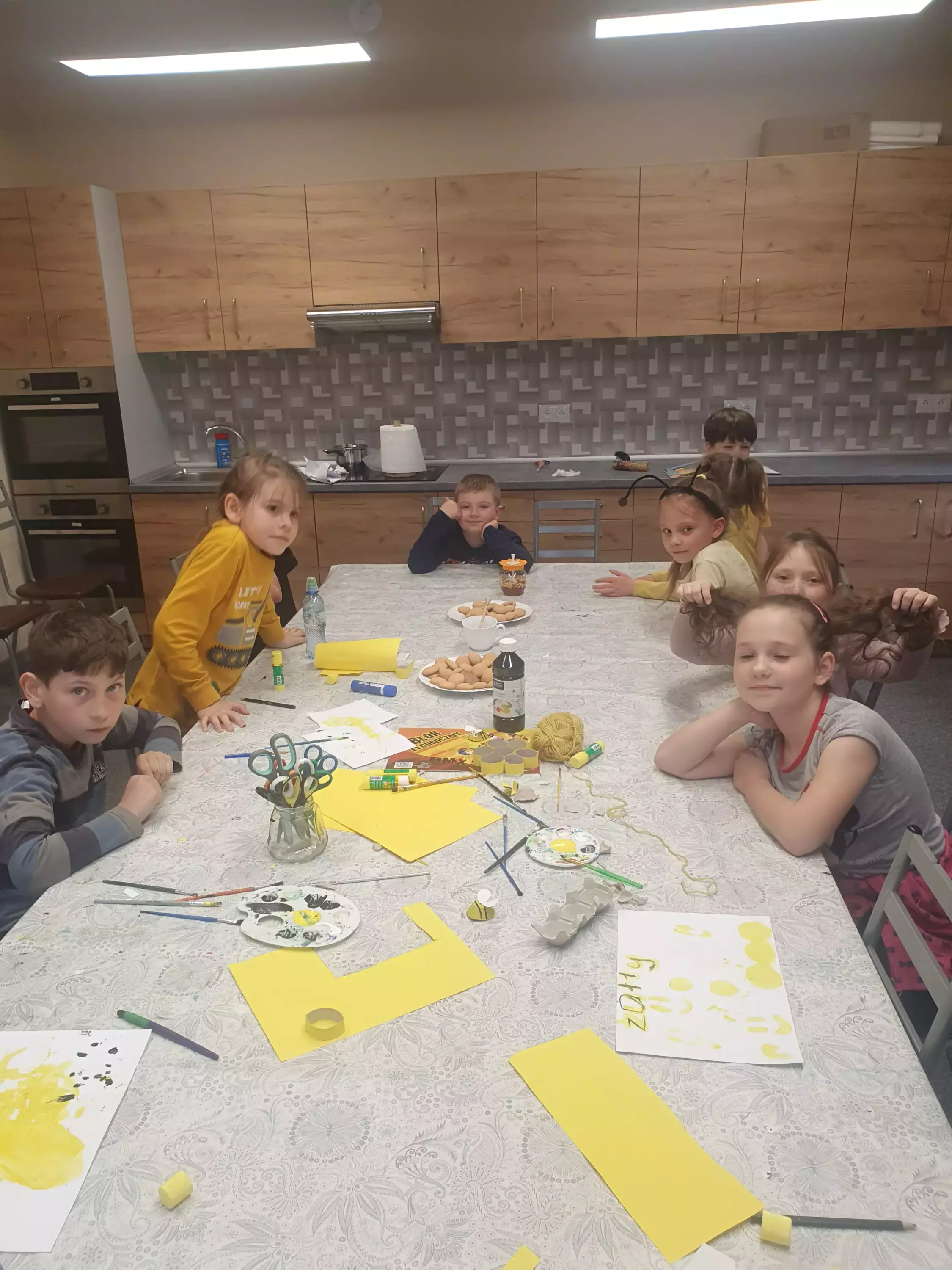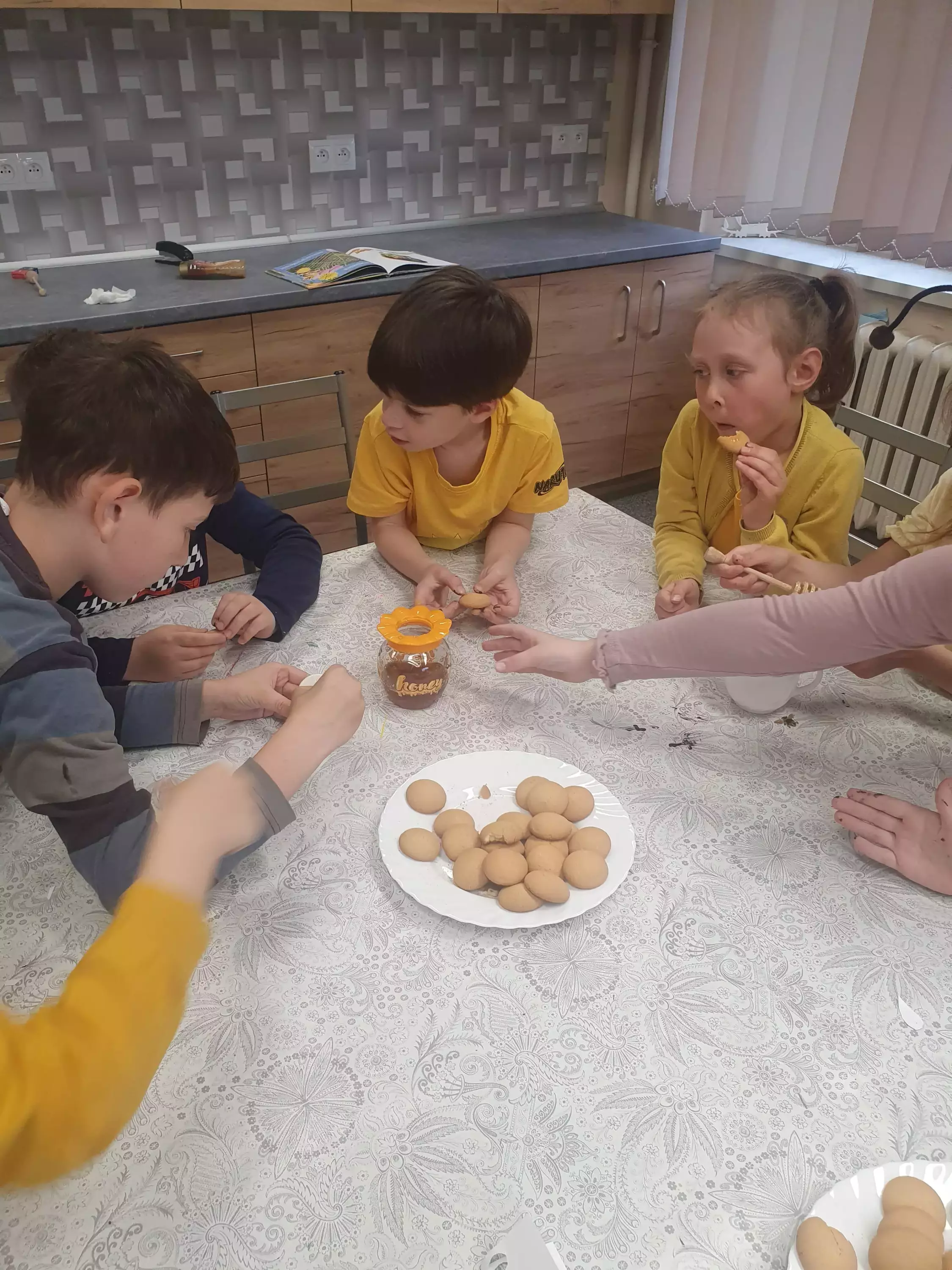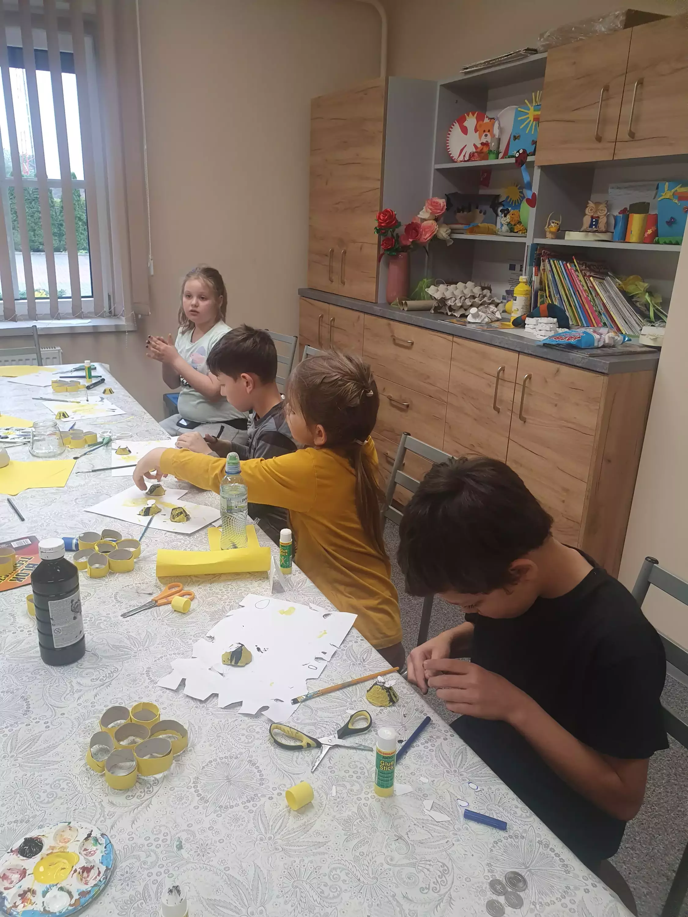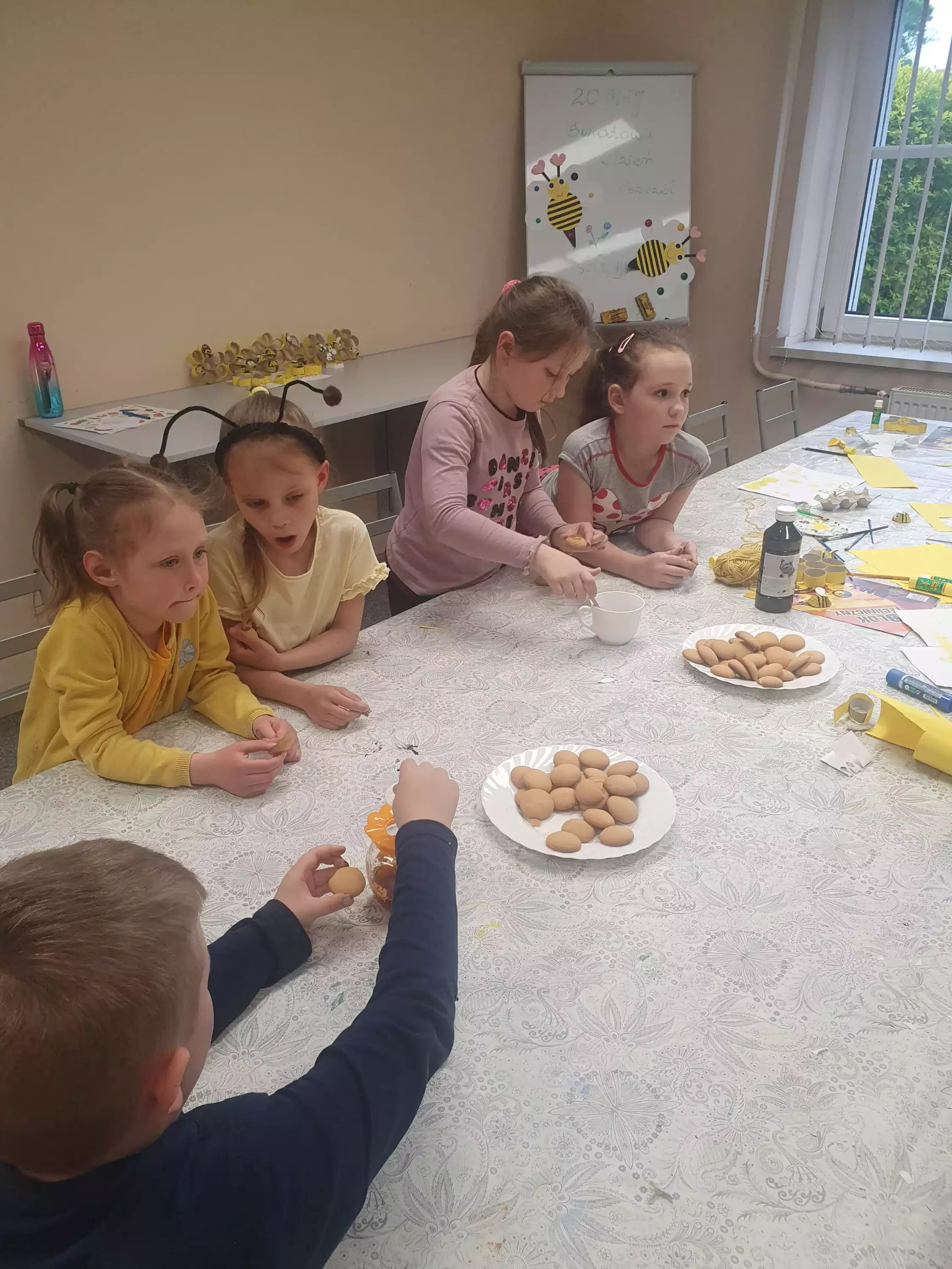 Uczestnicy zajęć siedzą przy stole i malują pszczółki z tektury.Dzieci siedzą przy stole w bibliotece i malują farbami pszczoły z tektury.Na zajęciach plastycznych dzieci malują farbami pszczoły.Chłopcy na zajęciach plastycznych wykonują pracę plastyczną.Dziewczynki na zajęciach w bibliotece sklejają plaster miodu z rolek papierowych.Wspólne zdjęcie w bibliotece.Słodki poczęstunek po zajęciach.Ciasteczka i miód.Słodki poczęstunek po zajęciach.