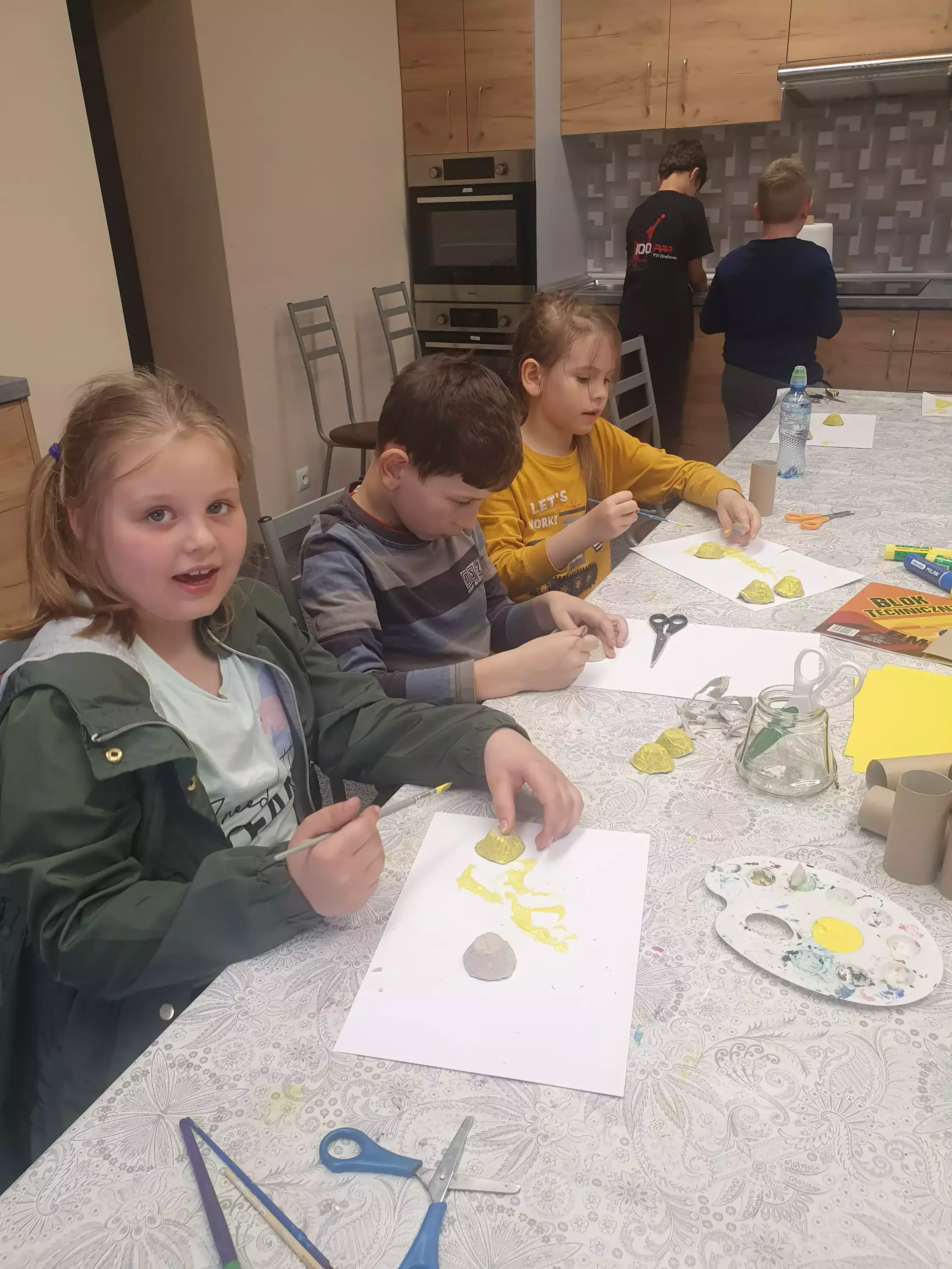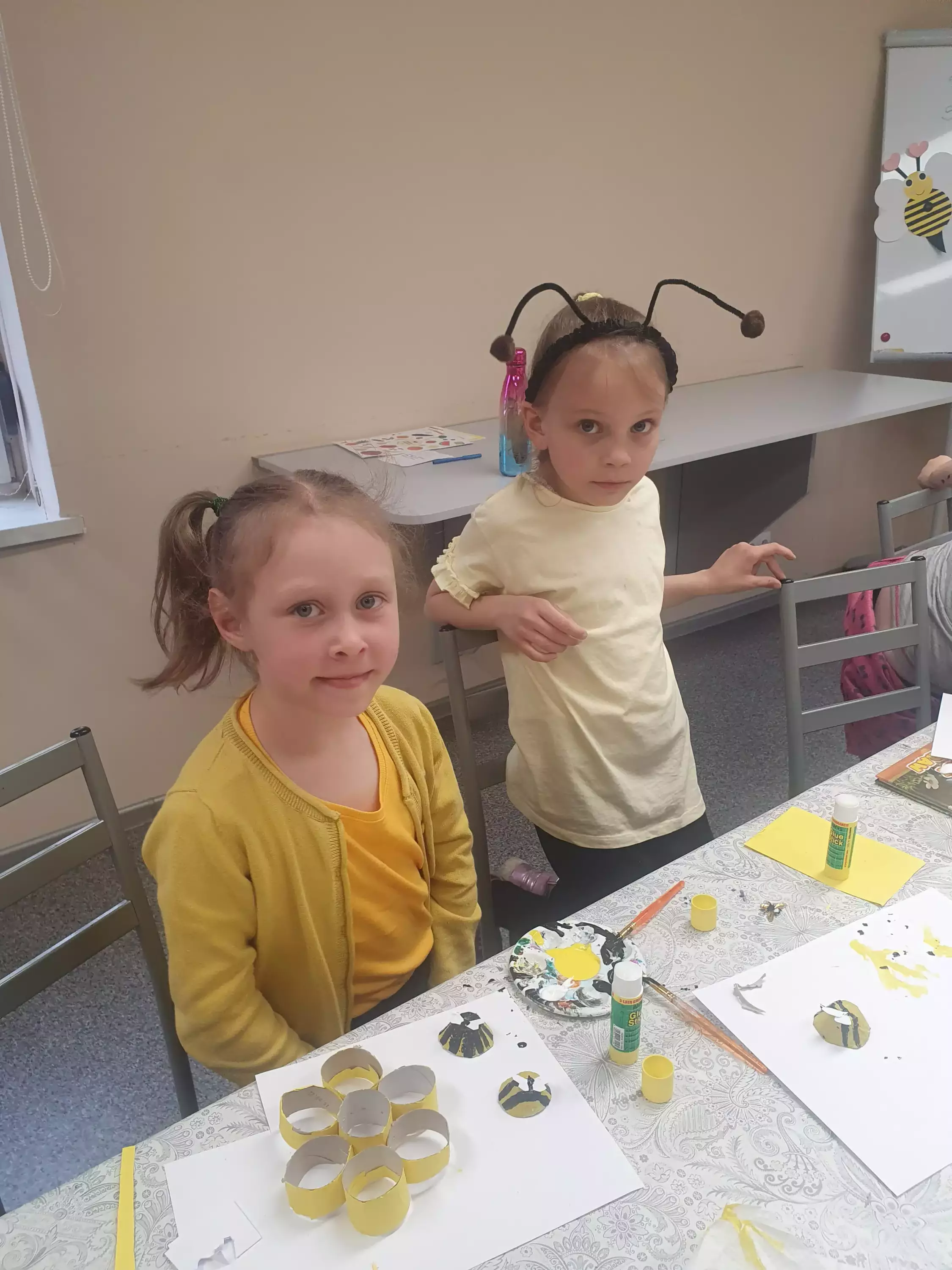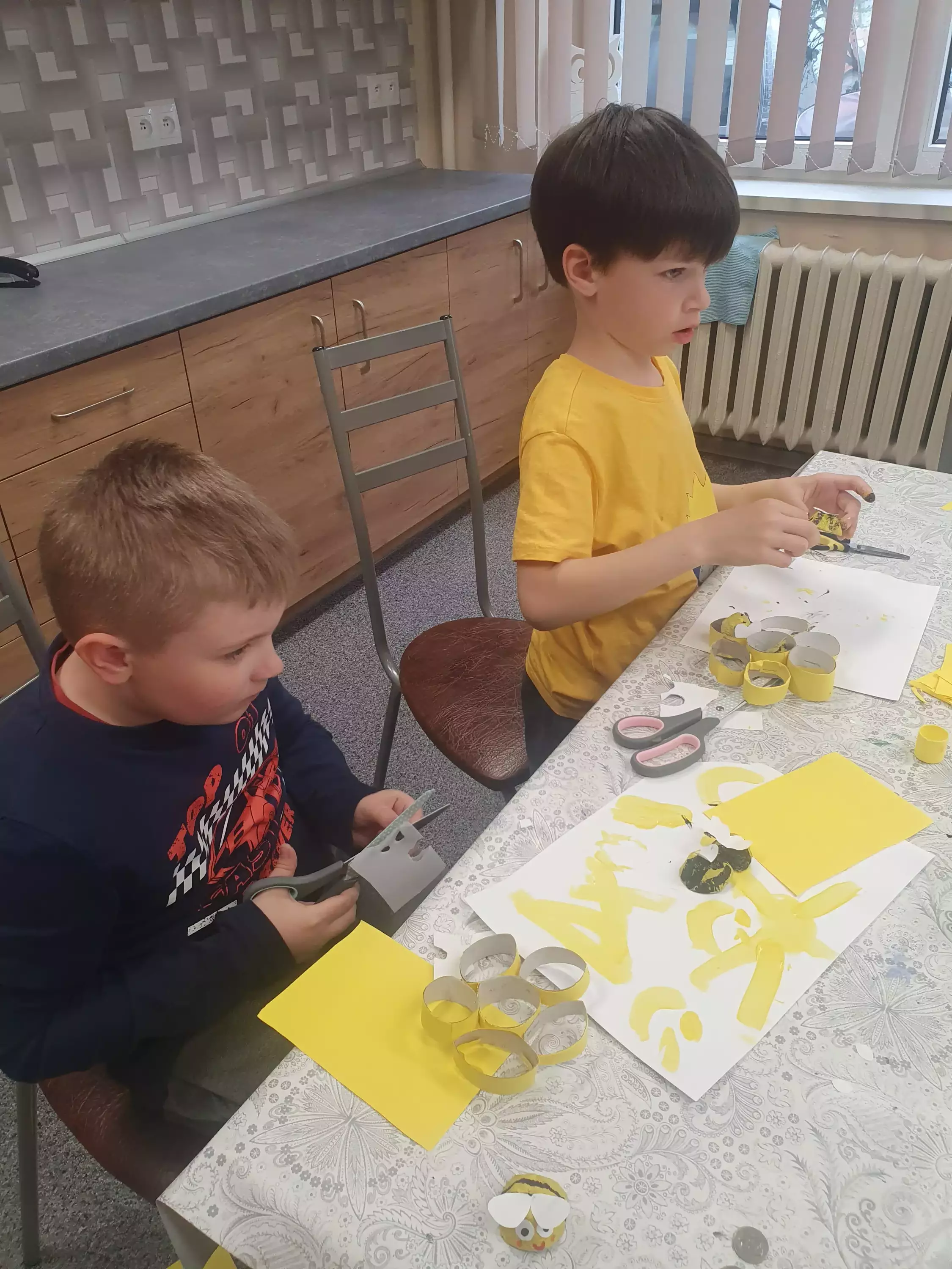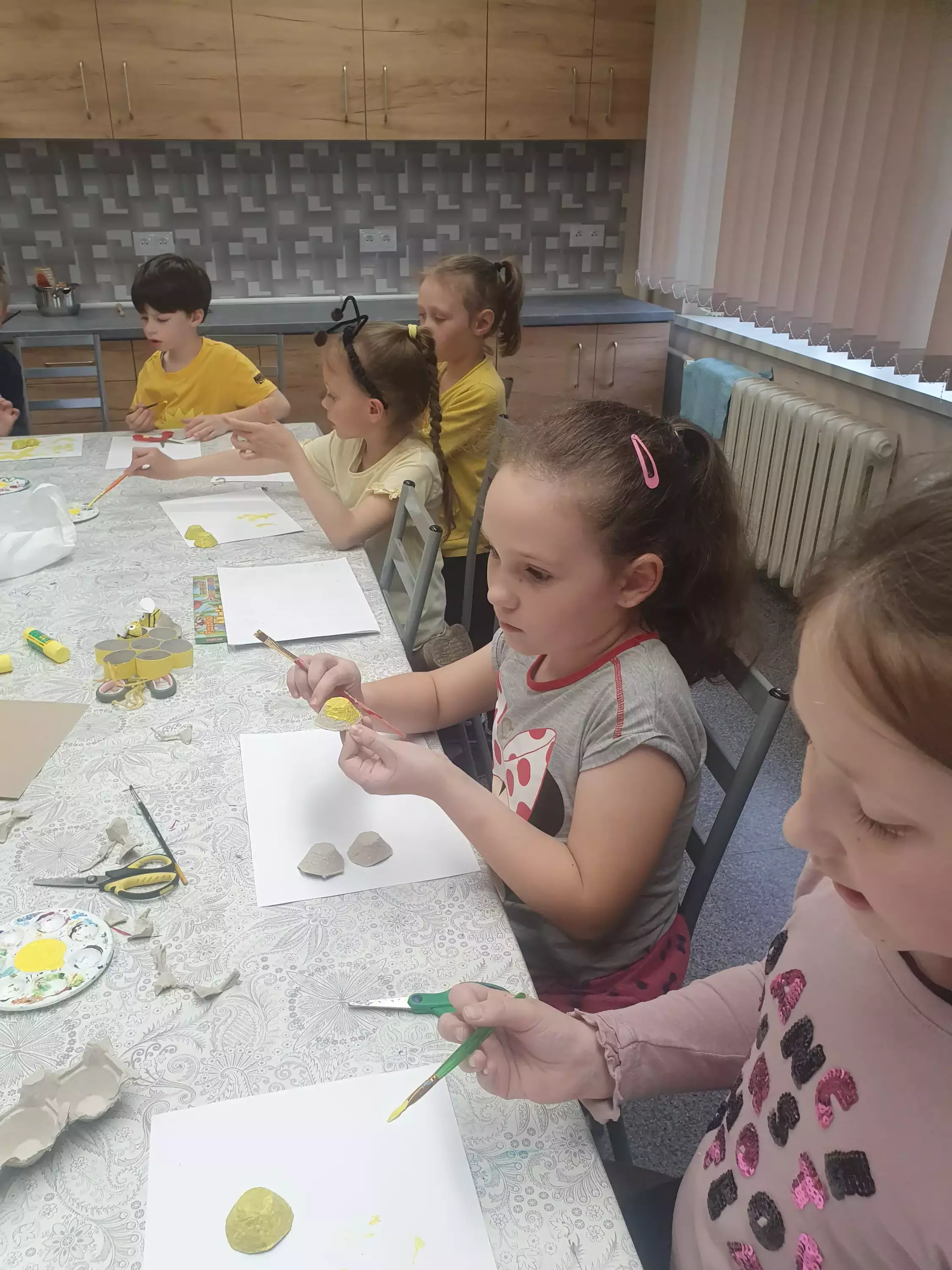 Uczestnicy zajęć siedzą przy stole i malują pszczółki z tektury.Dzieci siedzą przy stole w bibliotece i malują farbami pszczoły z tektury.Na zajęciach plastycznych dzieci malują farbami pszczoły.Chłopcy na zajęciach plastycznych wykonują pracę plastyczną.Dziewczynki na zajęciach w bibliotece sklejają plaster miodu z rolek papierowych.Wspólne zdjęcie w bibliotece.Słodki poczęstunek po zajęciach.Ciasteczka i miód.Słodki poczęstunek po zajęciach.