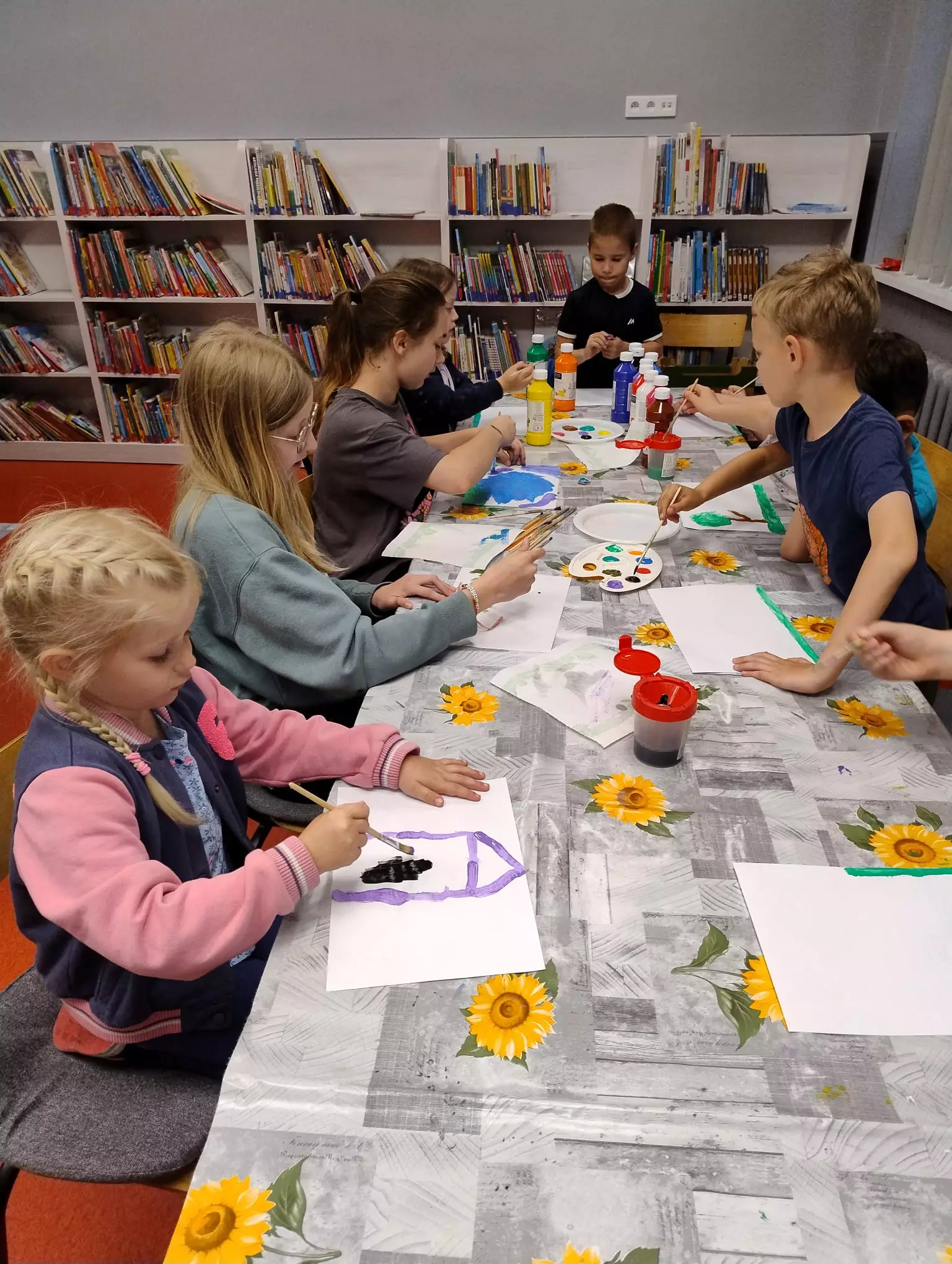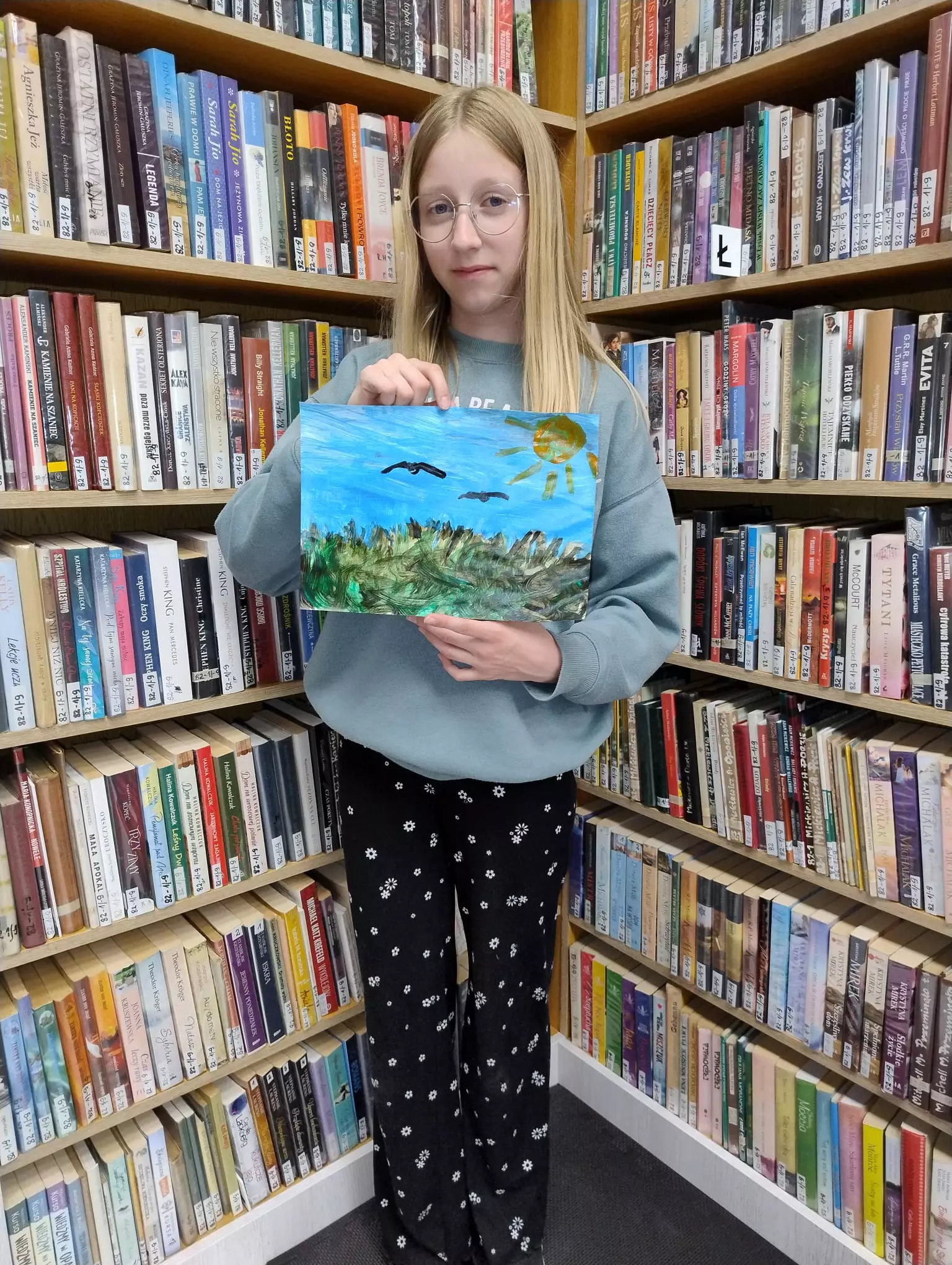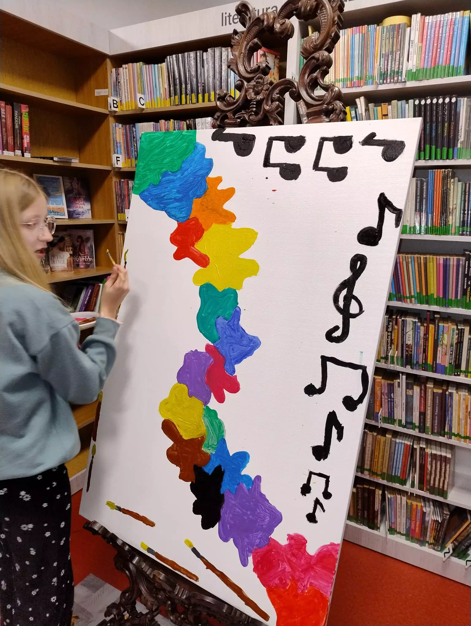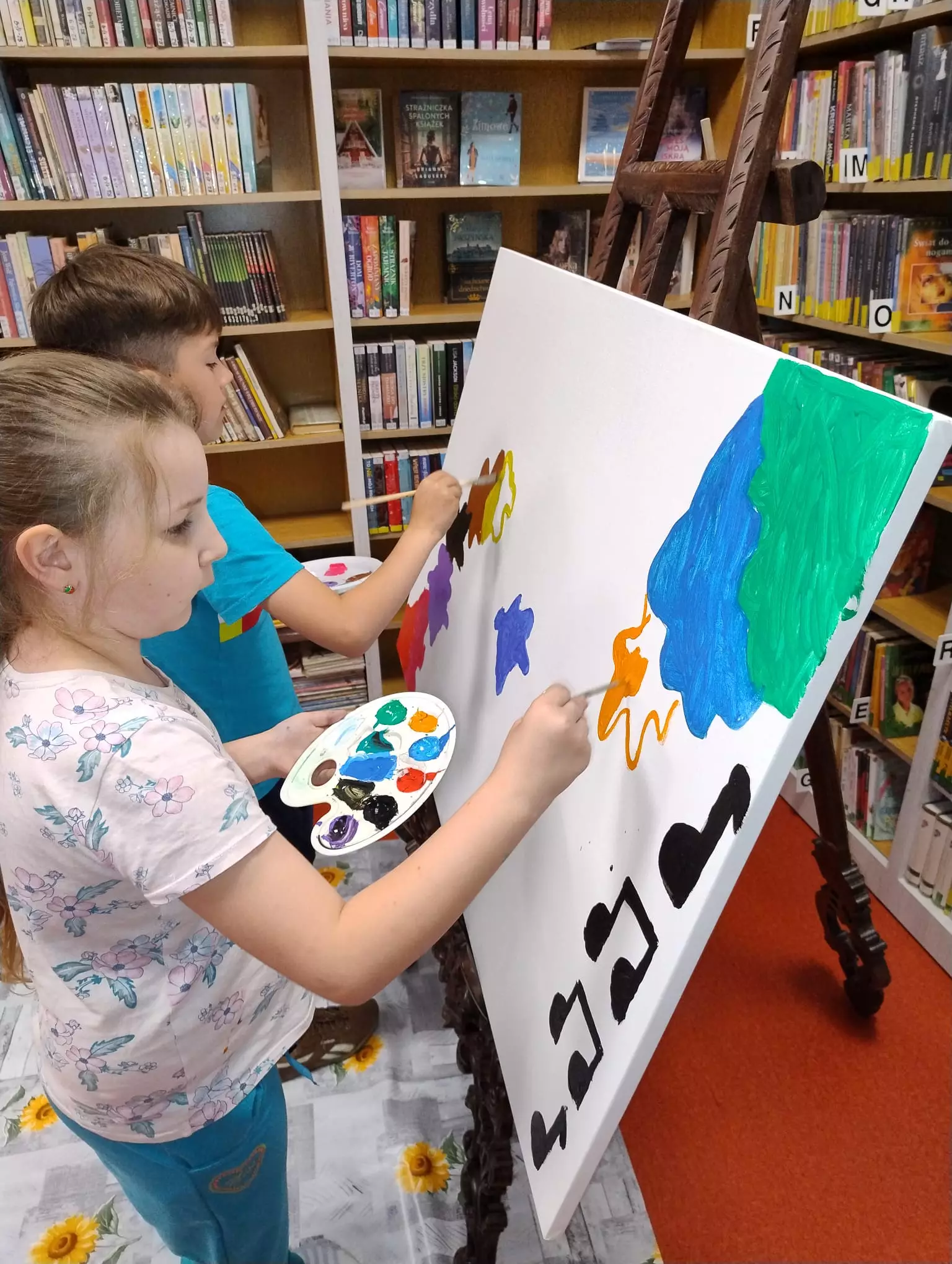 15 maja obchodziliśmy Święto Polskiej Muzyki i Plastyki. Celem tego święta jest upowszechnianie, promowanie polskiej kultury i sztuki. Na piątkowych zajęciach w Filii Bibliotecznej w Łagiewnikach Małych świętowaliśmy ten dzień, aby uwrażliwić dzieci na piękno sztuki i obudzić w nich twórcze działania. Rozmawialiśmy o polskich muzykach i plastykach słuchając ich utworów i oglądając ich dzieła. Dzieci malowały nastrój utworu muzycznego "Walc wiosenny" Fryderyka Chopina oraz tworzyły wspólny obraz, bo przecież każde dziecko jest artystą.