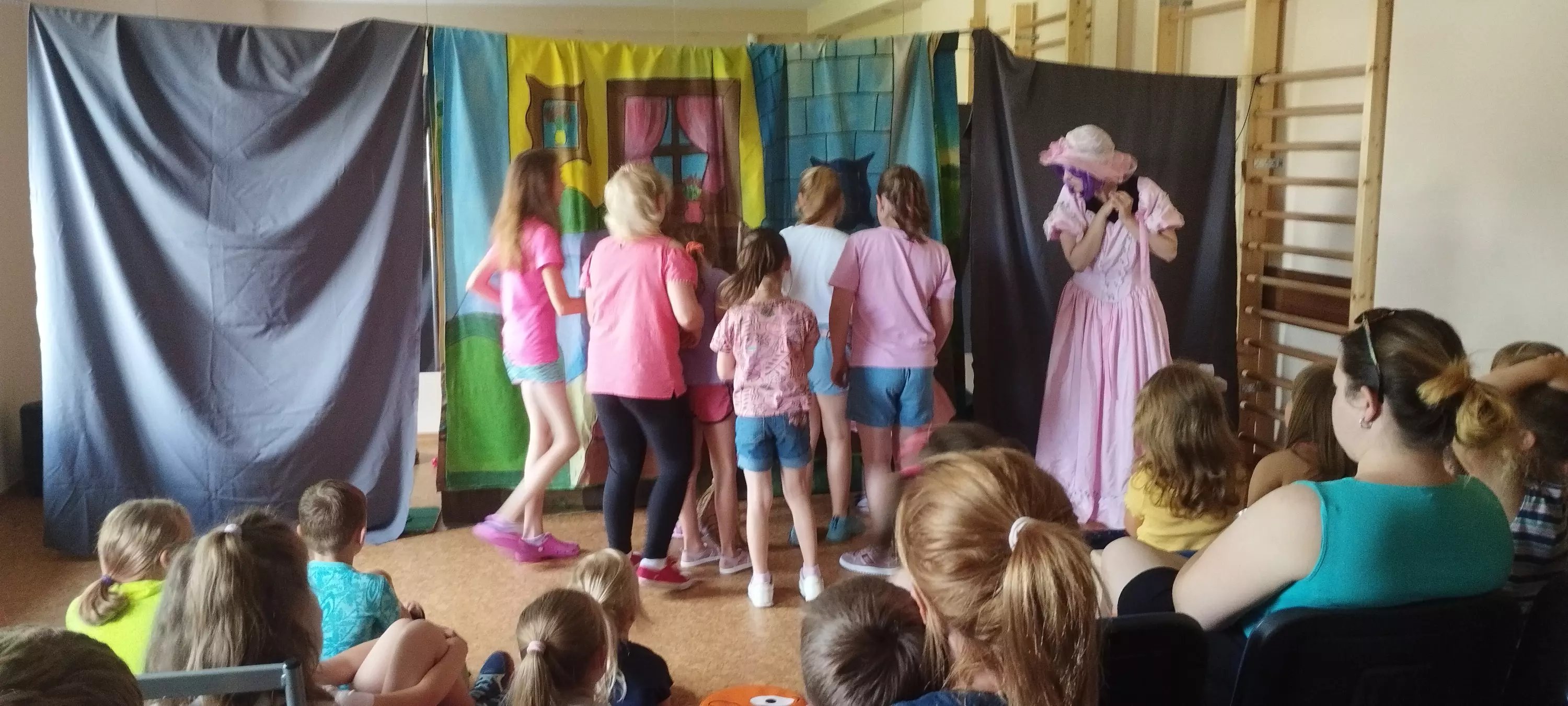 Dzieci i aktorzy teatralni biorą czynny udział w przedstawieniu.