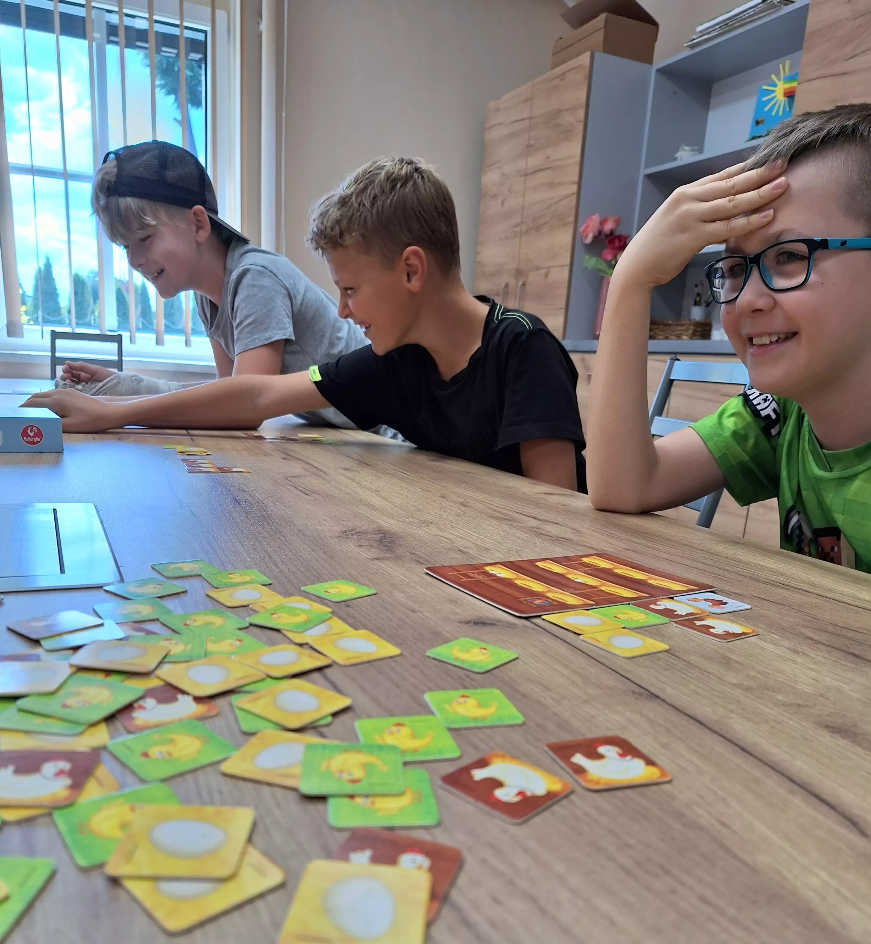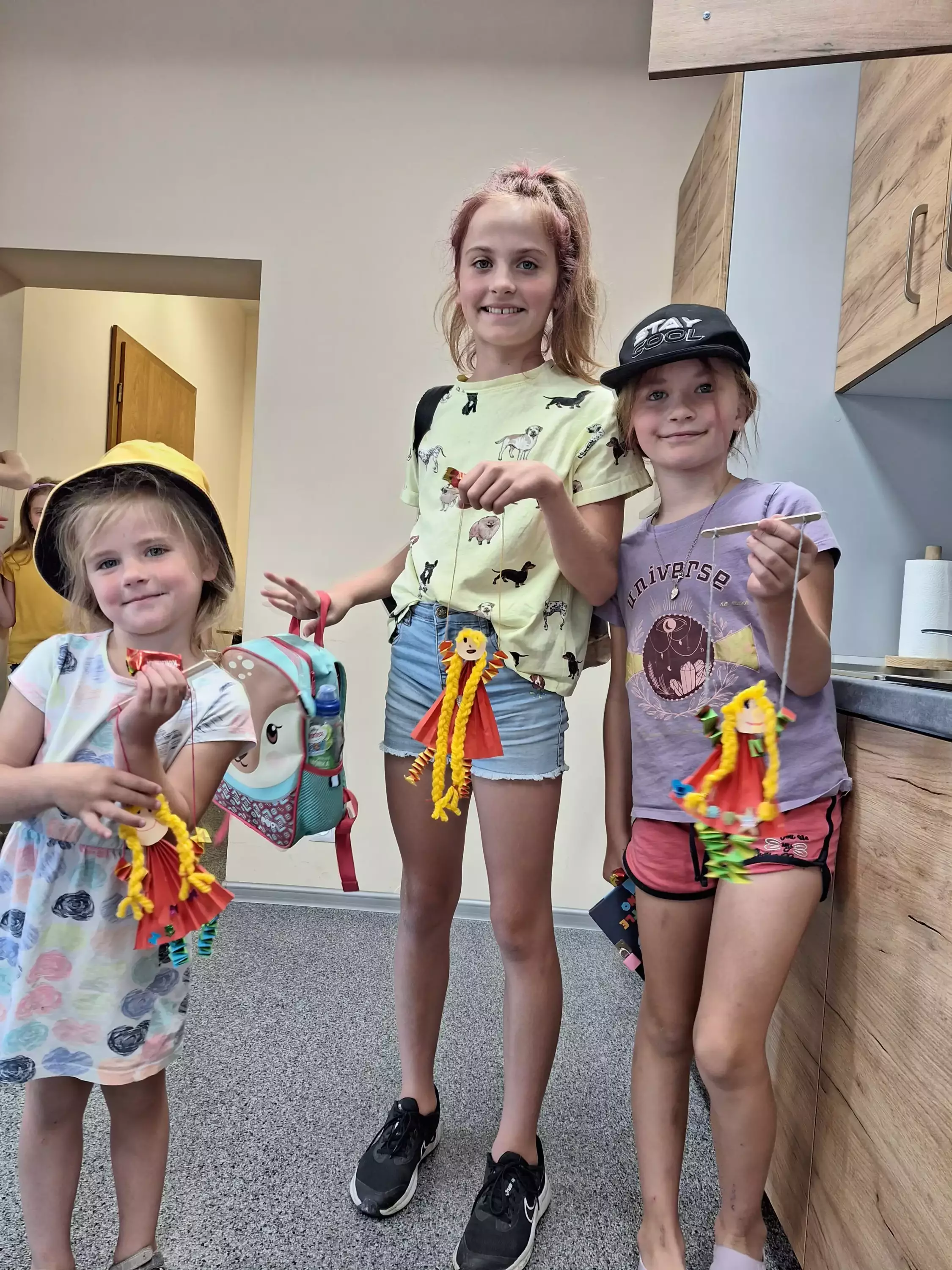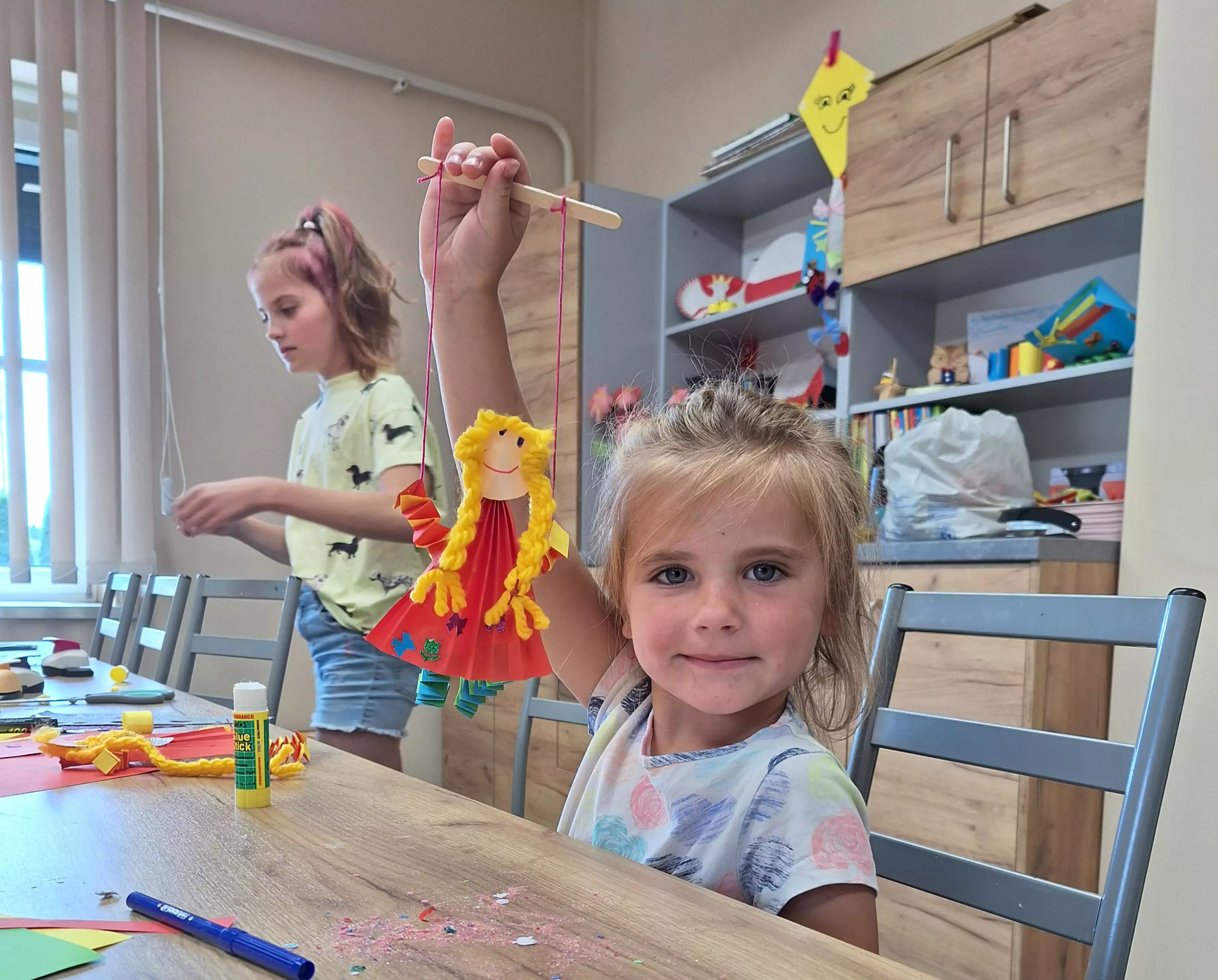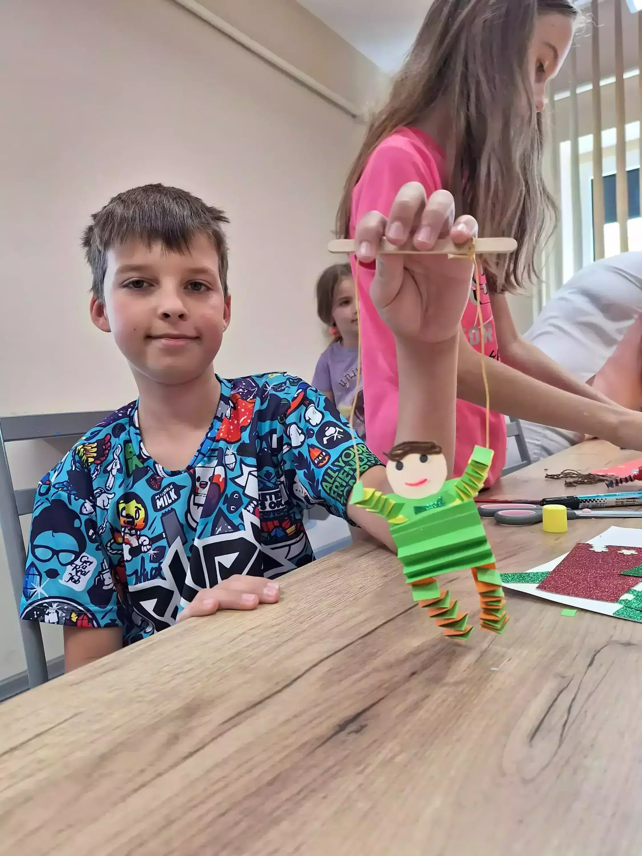 Dzieci oglądają przedstawienie teatralne w wykonaniu studia teatralnego KRAK-ART.Dzieci biorą czynny udział w przestawieniu teatralnym.Chłopiec pokazuje zrobioną na zajęciach marionetkę.Dziewczynka bawi się zrobioną laleczką - marionetką.Dziewczynki pokazują zrobione przez siebie laleczki - marionetki.Chłopcy grają w grę planszową.Dzieci siedzą przy stole i grają w grę Monopoly.Chłopcy siedzą przy stole i grają w grę planszową.