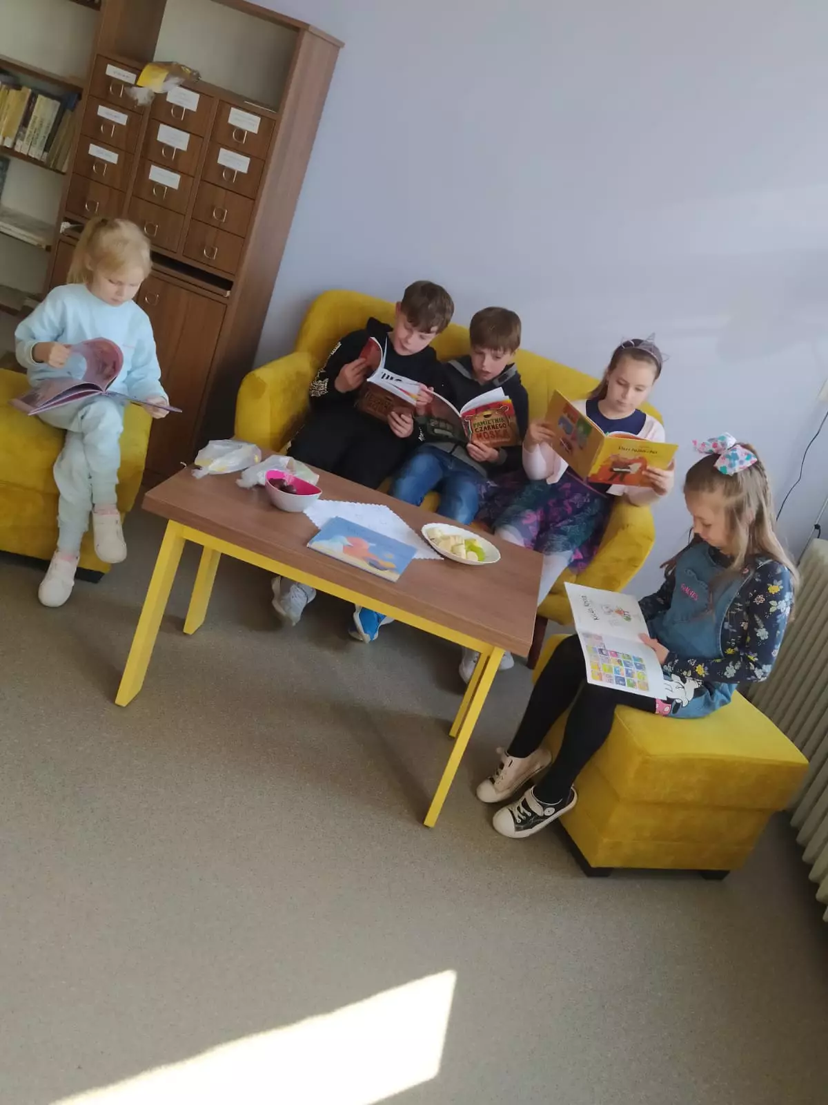 Dzieci oglądają książeczki.Dzieci czytają książki.Dzieci bawią się zabawką.Dzieci jedzą poczęstunek.Aktorzy teatru w bibliotece.Teatrzyk w bibliotece.Dzieci w bibliotece.Dzieci w bibliotece.Dzieci oglądają teatrzyk.