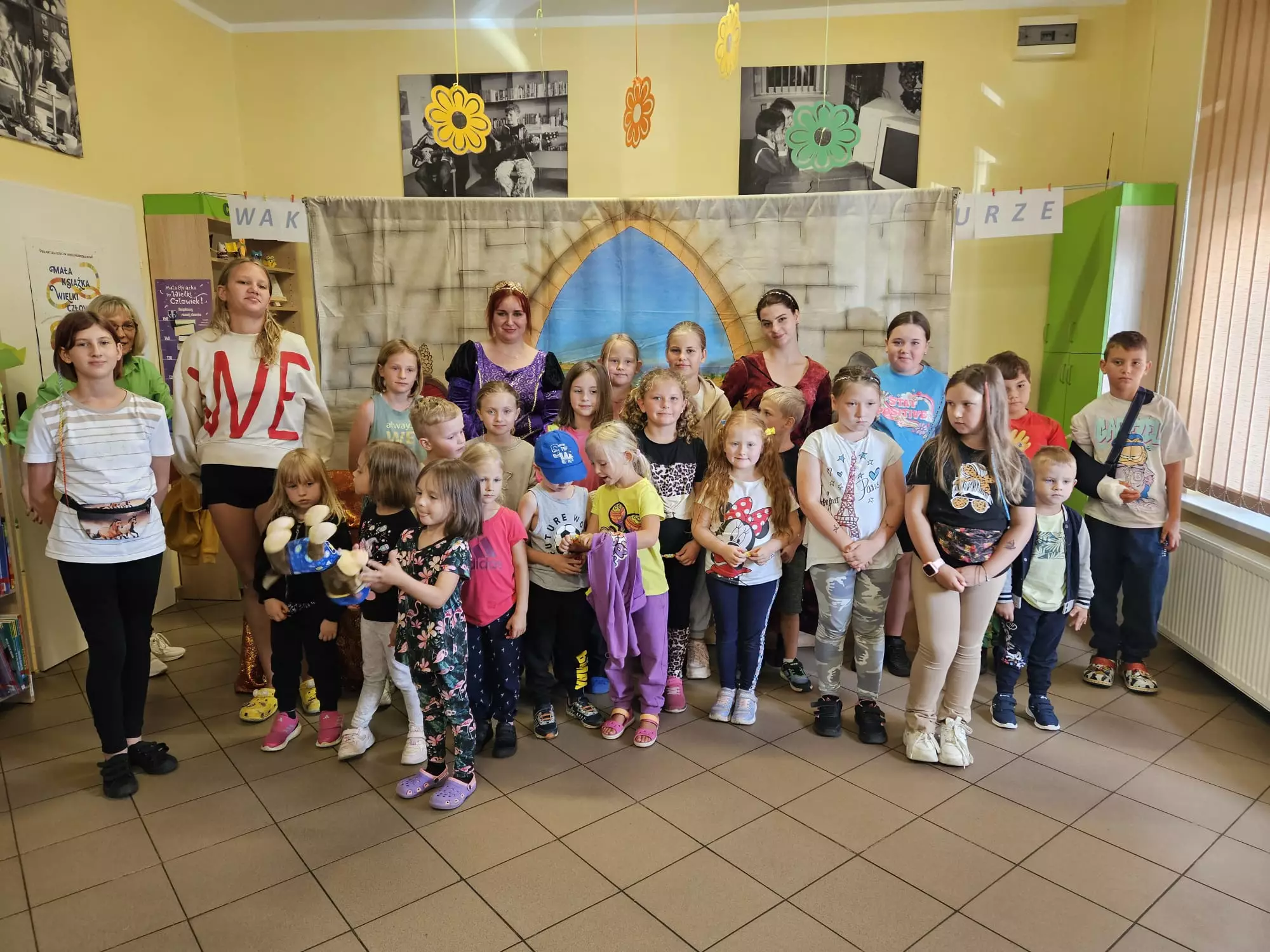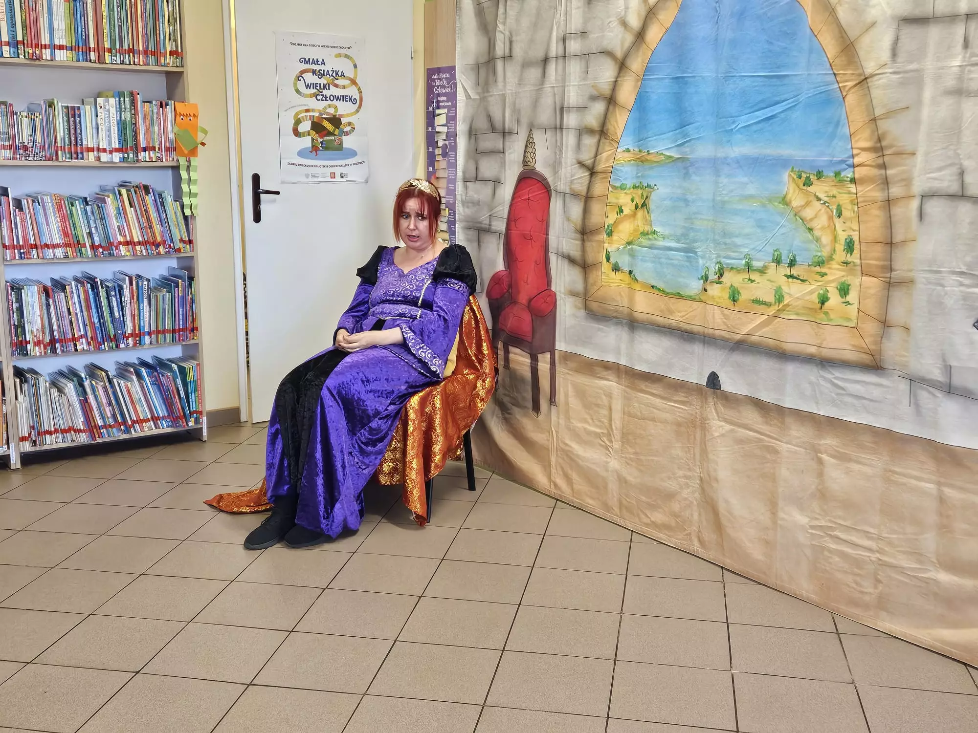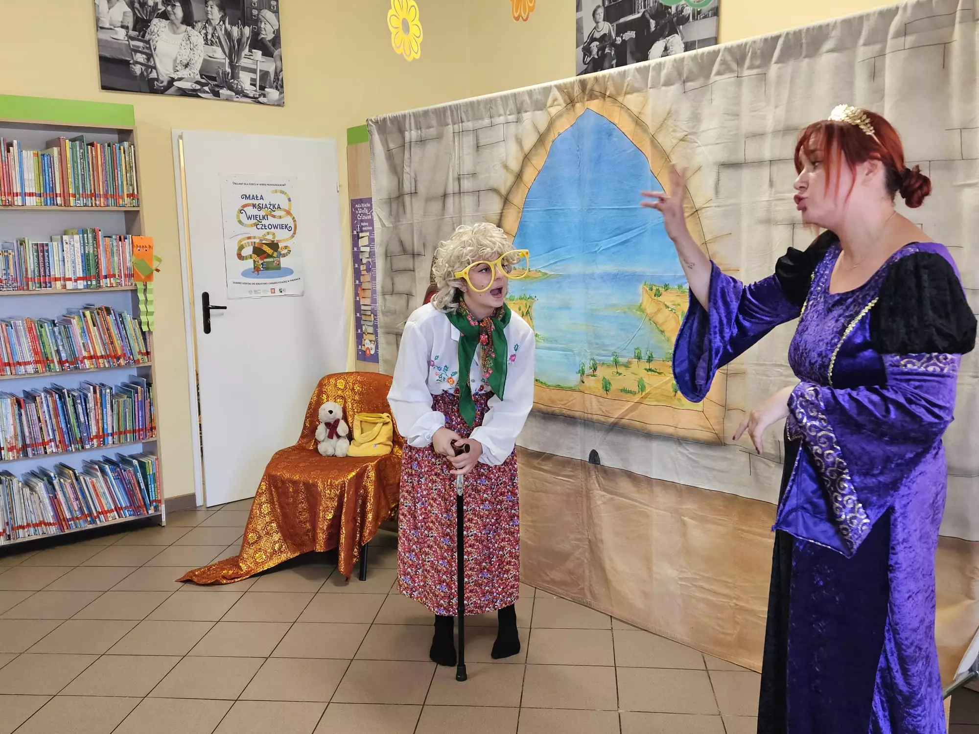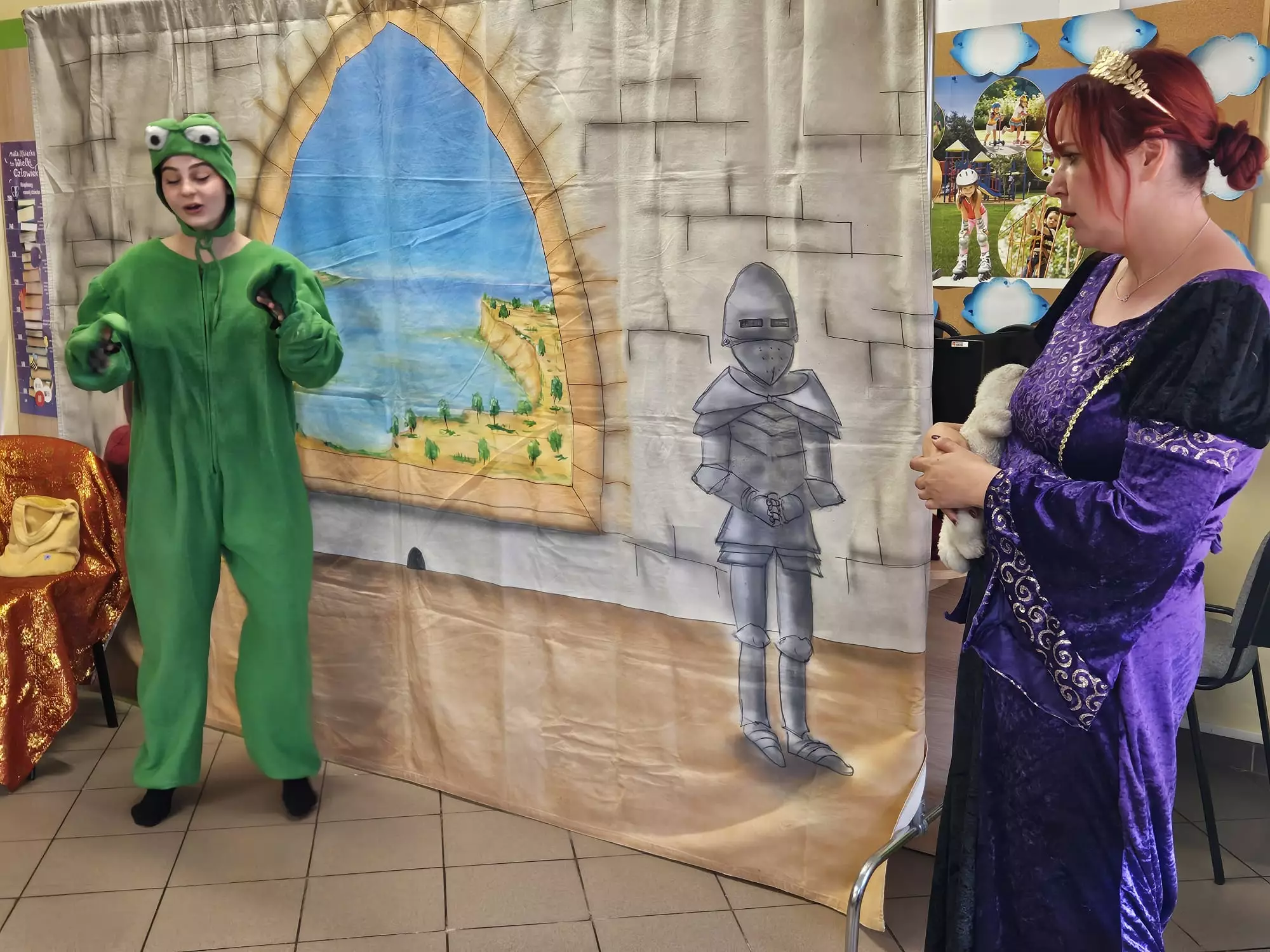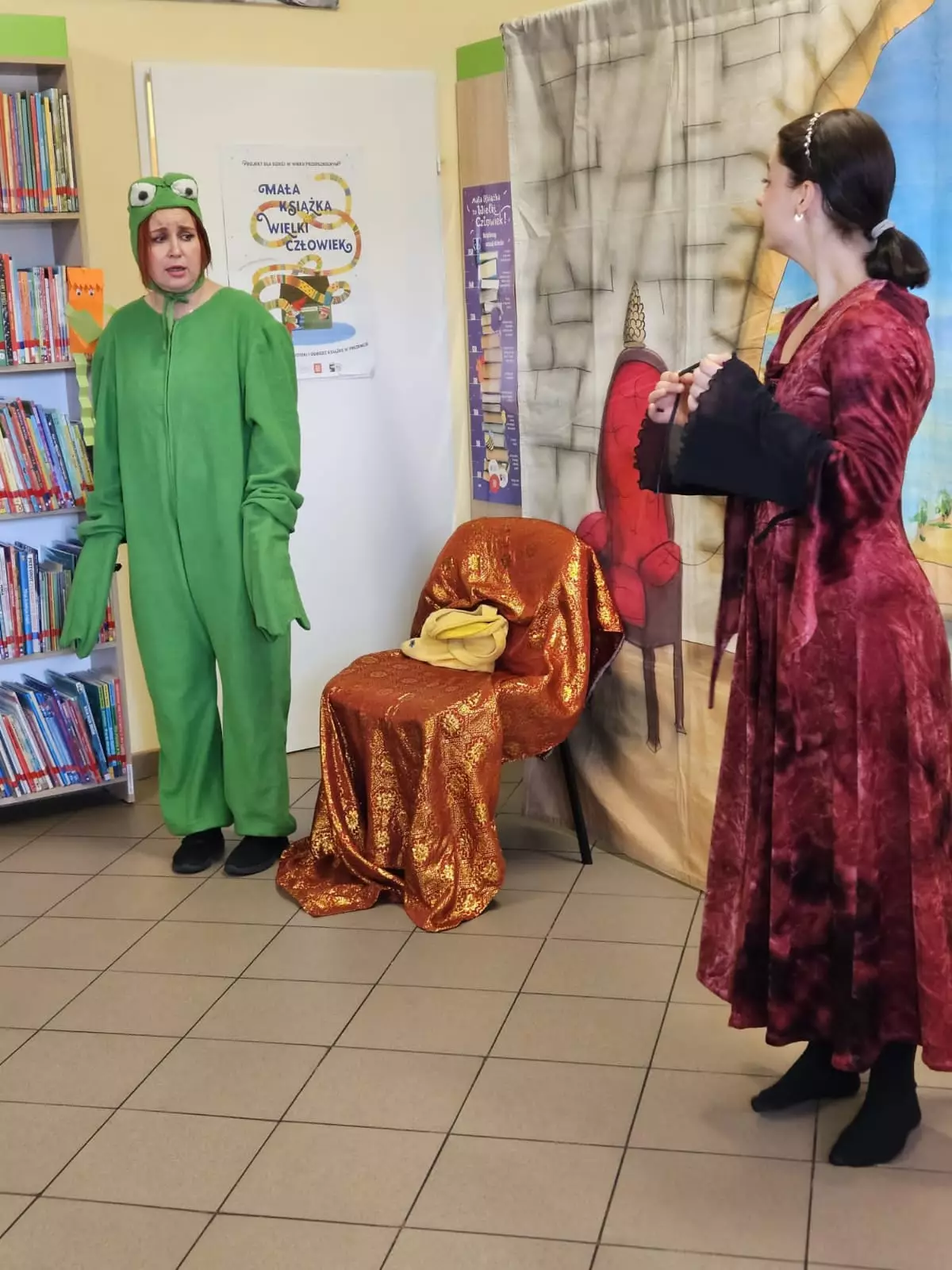 Aktorki przebrane za postacie bajkowe - księżniczkę i babcię - przedstawiają spektakl w bibliotece.Aktorki przebrane za żabę i królową.Widzowie spektaklu, dzieci siedzą na krzesełkach w bibliotece i oglądają przedstawienie.Aktorki w spektaklu przebrane za królewnę i chłopczyka.Aktorki w spektaklu przebrane za królewnę i żabę.Widzowie spektaklu, dzieci siedzą na krzesełkach w bibliotece i oglądają przedstawienie.Wspólne zdjęcie dzieci razem z aktorkami oraz panią bibliotekarką na tle scenografii przedstawienia.Aktorki w spektaklu przebrane za żabę i chłopczyka.
