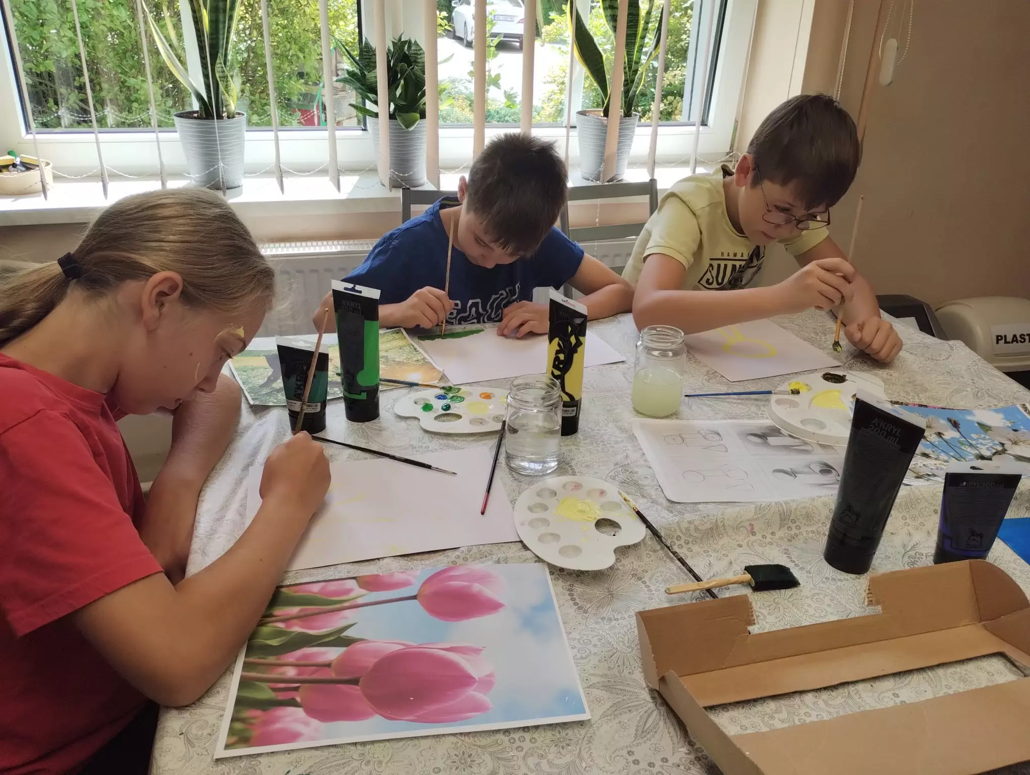 W środę podczas warsztatów „Lato z rysunkiem” uczestnicy poznali malarstwo akrylowe – malowali krajobrazy i kwiaty bez wcześniejszego szkicu ołówkiem, używając zamiast tego żółtej farby podkładowej