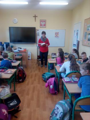 Z okazji Narodowego Czytania Pisma Świętego Pani Bibliotekarka na lekcji religii przeczytała uczniom klasy II fragmenty z Ewangelii św. Jana. X. Tegoroczny Tydzień Biblijny trwał od 5 do 11 maja pod hasłem: "Głosili ewangelię mocą Ducha Świętego" (1 P 1,12), nawiązującym do pierwszej pielgrzymki Jana Pawła II do Polski w 1979 roku. Biblia jest książką dostępną w bibliotece i można ją także wypożyczać.