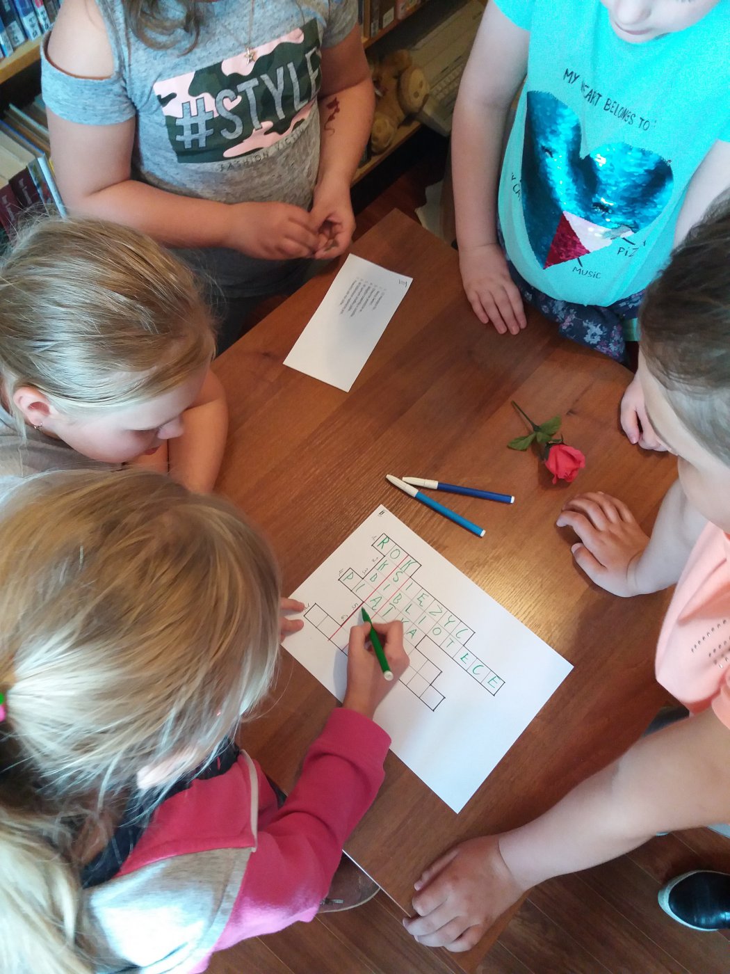 Inny przebieg miało spotkanie w bibliotece z uczniami klasy IV. Przy blasku świec, w otoczeniu książek i w miłym nastroju uczniowie rozwiązywali krzyżówki, których hasło utworzyło temat spotkania "TYDZIEŃ BIBLIOTEK"