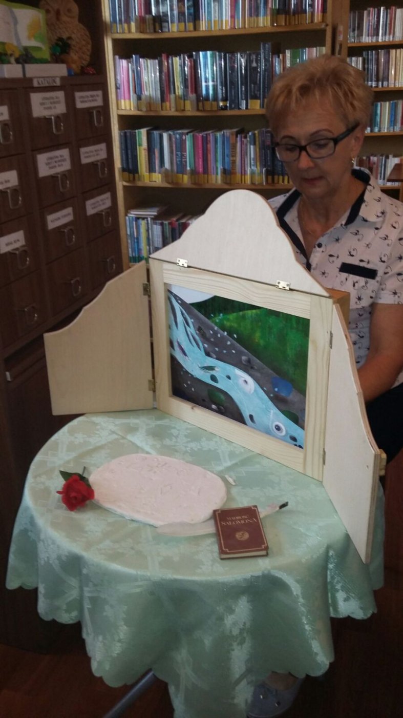 Dzieci wysłuchały także opowiadania przedstawionego za pomocą teatrzyku kamishibai pt.: "Czułość". Wielką radość sprawiły im również biblioteczne pacynki oraz marionetki- tuptusie.