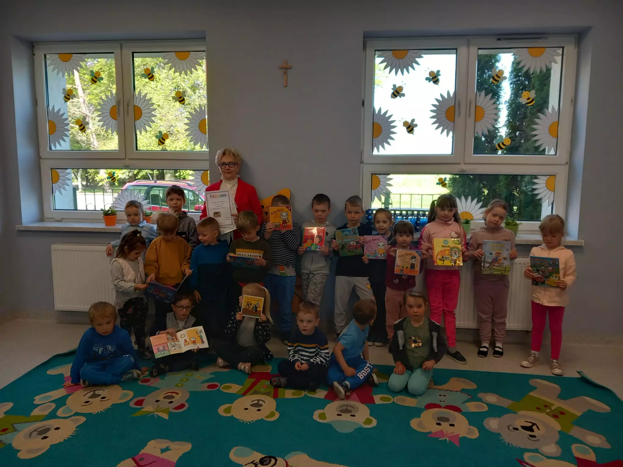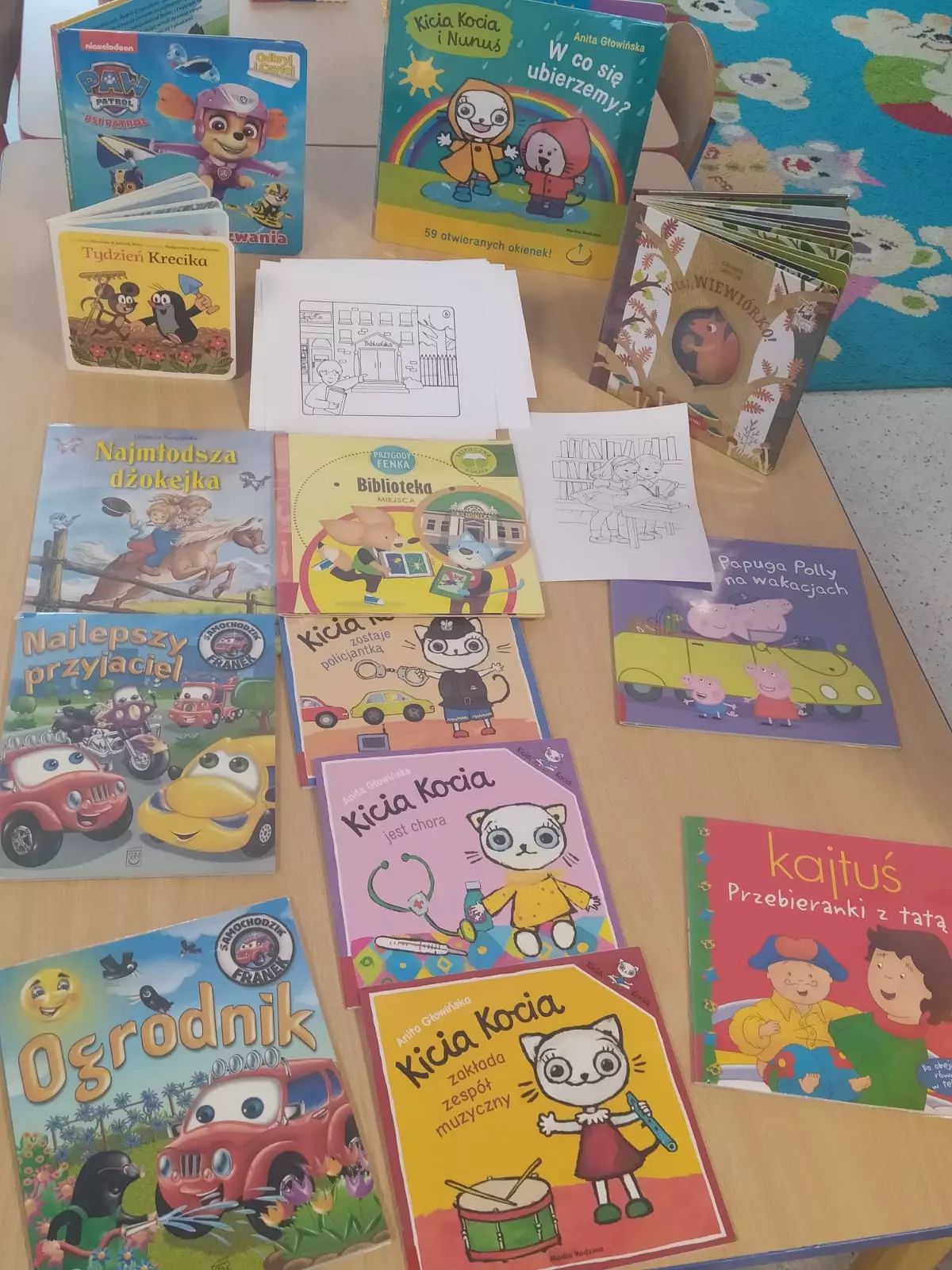 Dzieci siedzą na dywanie i słuchają bibliotekarkiPrzedszkolaki siedzą na dywanie i oglądają książki przyniesione z biblioteki.Przedszkolaki siedzą na dywanie i oglądają książki przyniesione z biblioteki.Przedszkolaki siedzą na dywanie i oglądają książeczki.Dzieci siedzą przy stolikach i wykonują pracę plastyczną.Przedszkolaki siedzą na dywanie i słuchają czytanej bajki.Książki