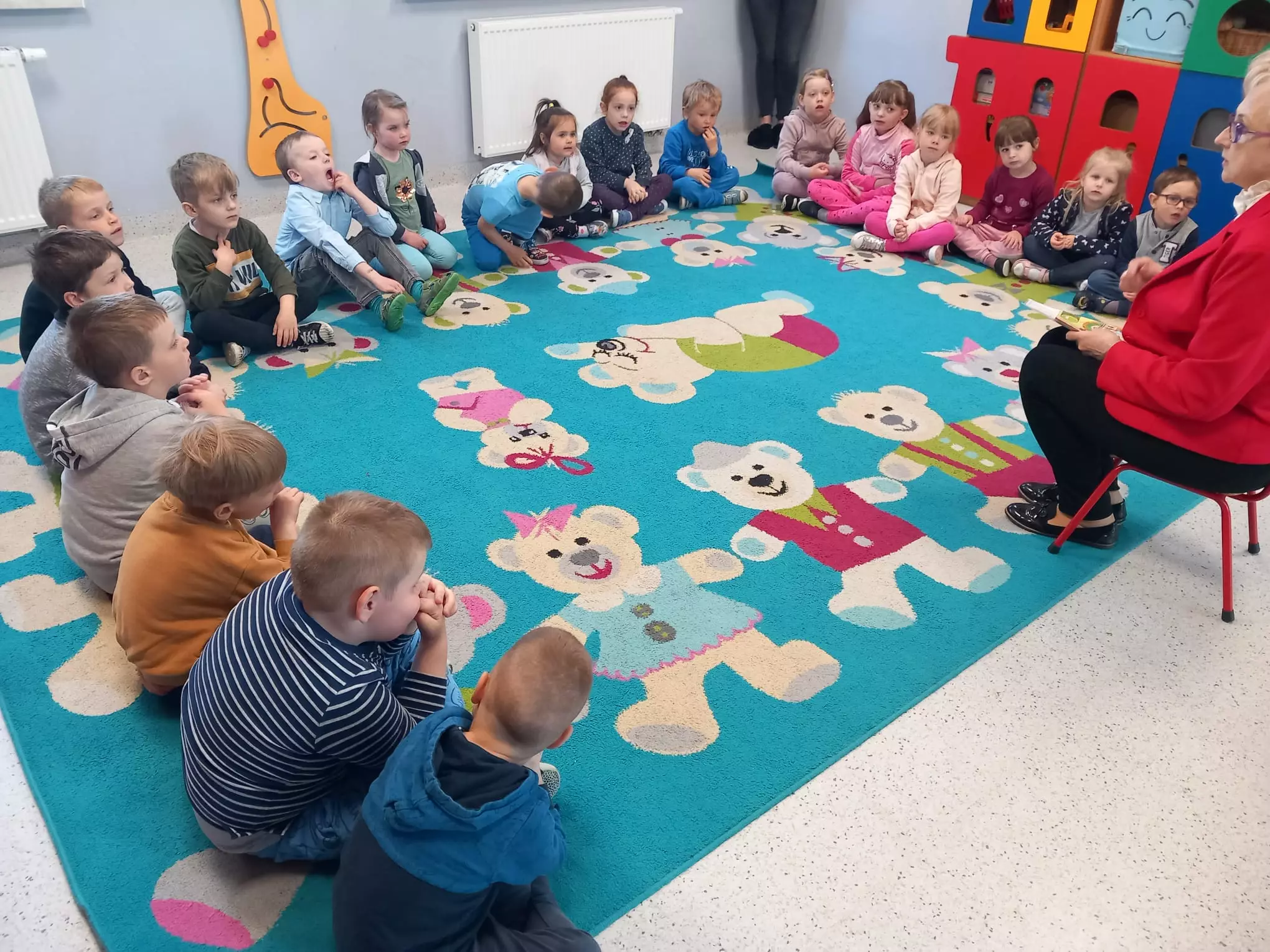 Spotkanie nie mogło odbyć się bez głośnego czytania na dywanie, dlatego w związku z tematyką uczestnicy wysłuchali opowiadania pt. "Biblioteka" z serii Miejsca.