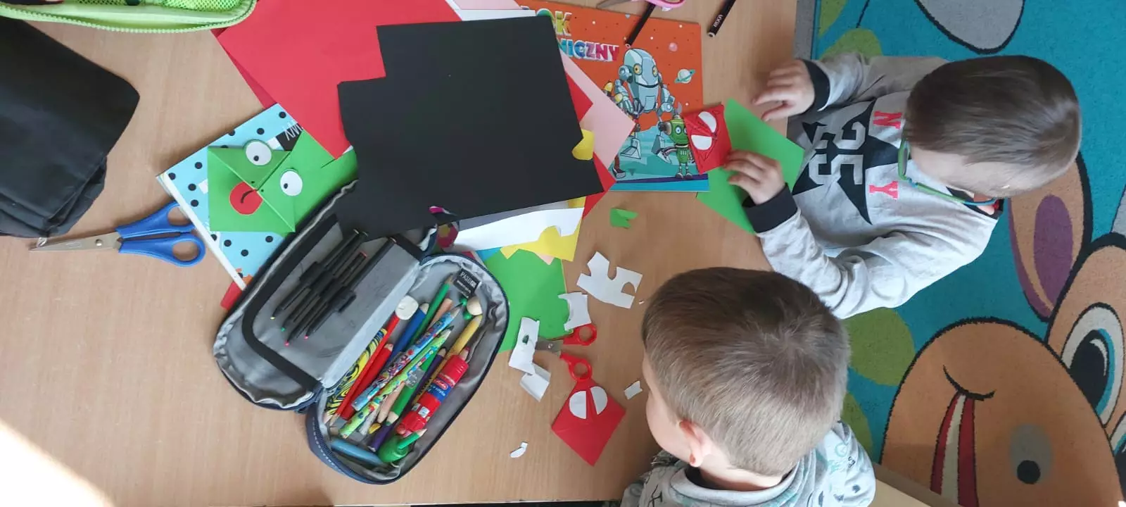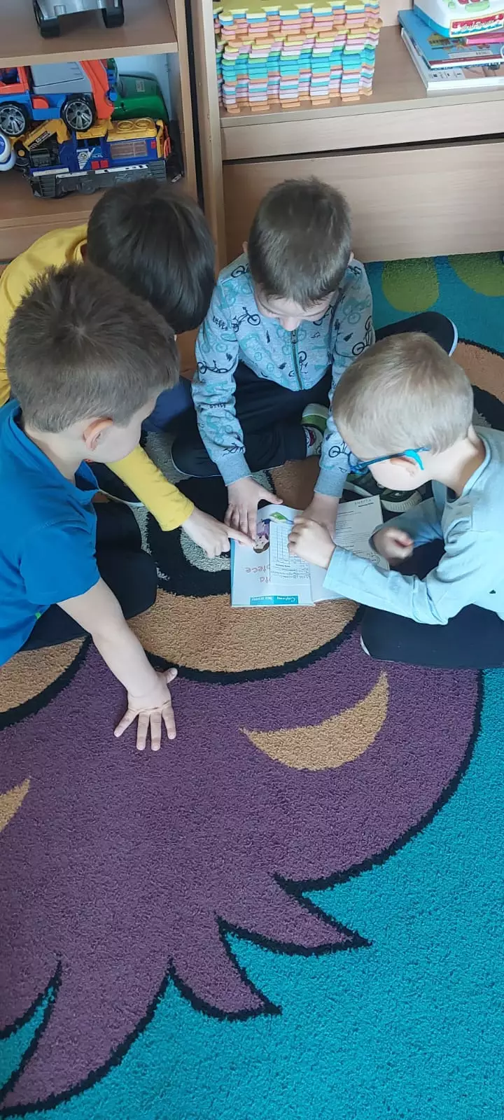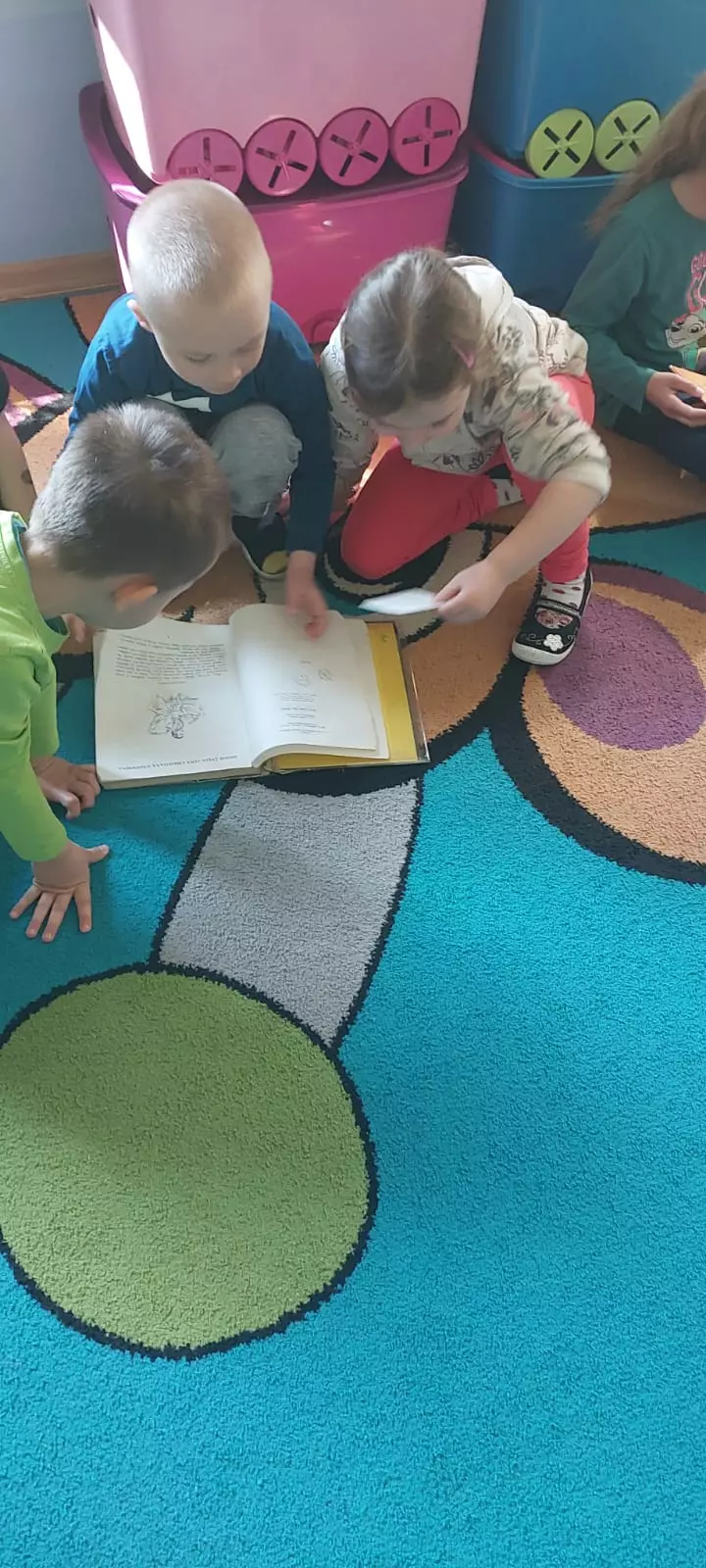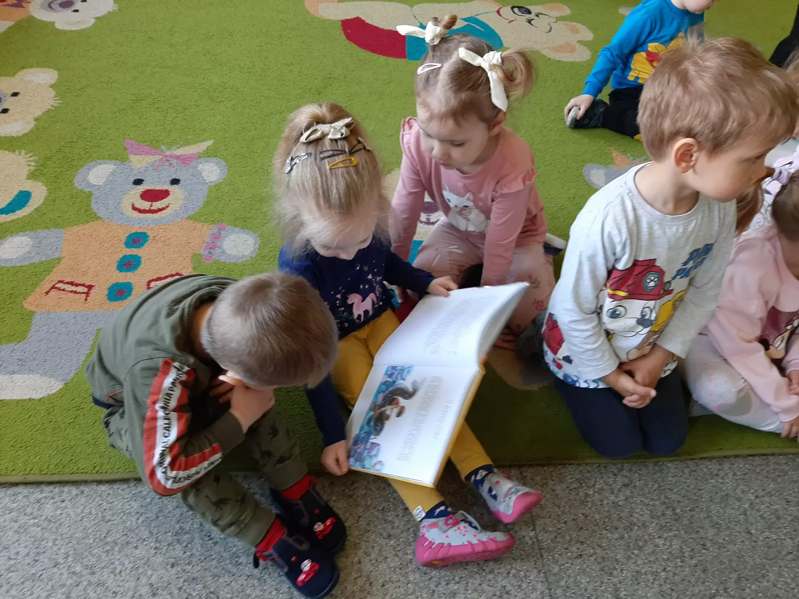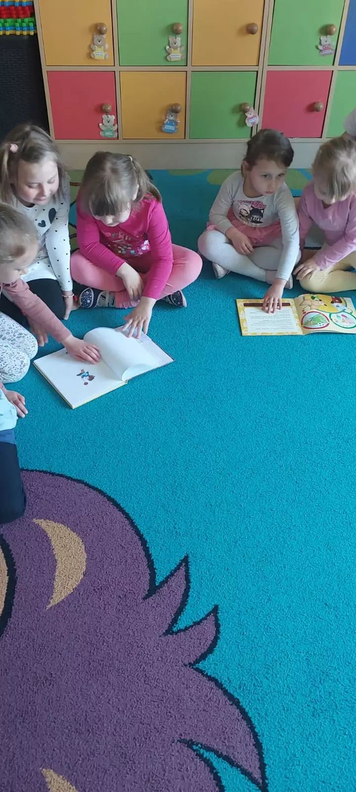 Przedszkolaki na dywanie oglądają książki.Dziewczynka siedzi przy stoliku i klei z papieru zakładkę do książki.Uczestnik zajęć wykonuje zakładkę do książki z papieru.Chłopcy wykonują zakładkę z papieru.Przedszkolaki siedzą na dywanie i słuchają opowiadania czytanego w formie teatrzyku.Przedszkolaki sklejają zniszczoną książkę.Przedszkolak siedzą na dywanie i ogląda książkę.Przedszkolaki siedzą przy stolikach i wykonują pracę plastyczną.Maluszki siedzą na dywanie w przedszkolu i słuchają czytanej książki.Maluszki siedzą na dywanie i oglądają książki.Maluszki siedzą na dywanie i oglądają książeczki przyniesione z biblioteki.Przedszkolaki siedzą na dywanie i słuchają opowiadania czytanego w formie teatrzyku.Maluszki siedzą na dywanie i oglądają książki przyniesione z biblioteki.Przedszkolaki uczą się jak posklejać zniszczoną książeczkę.