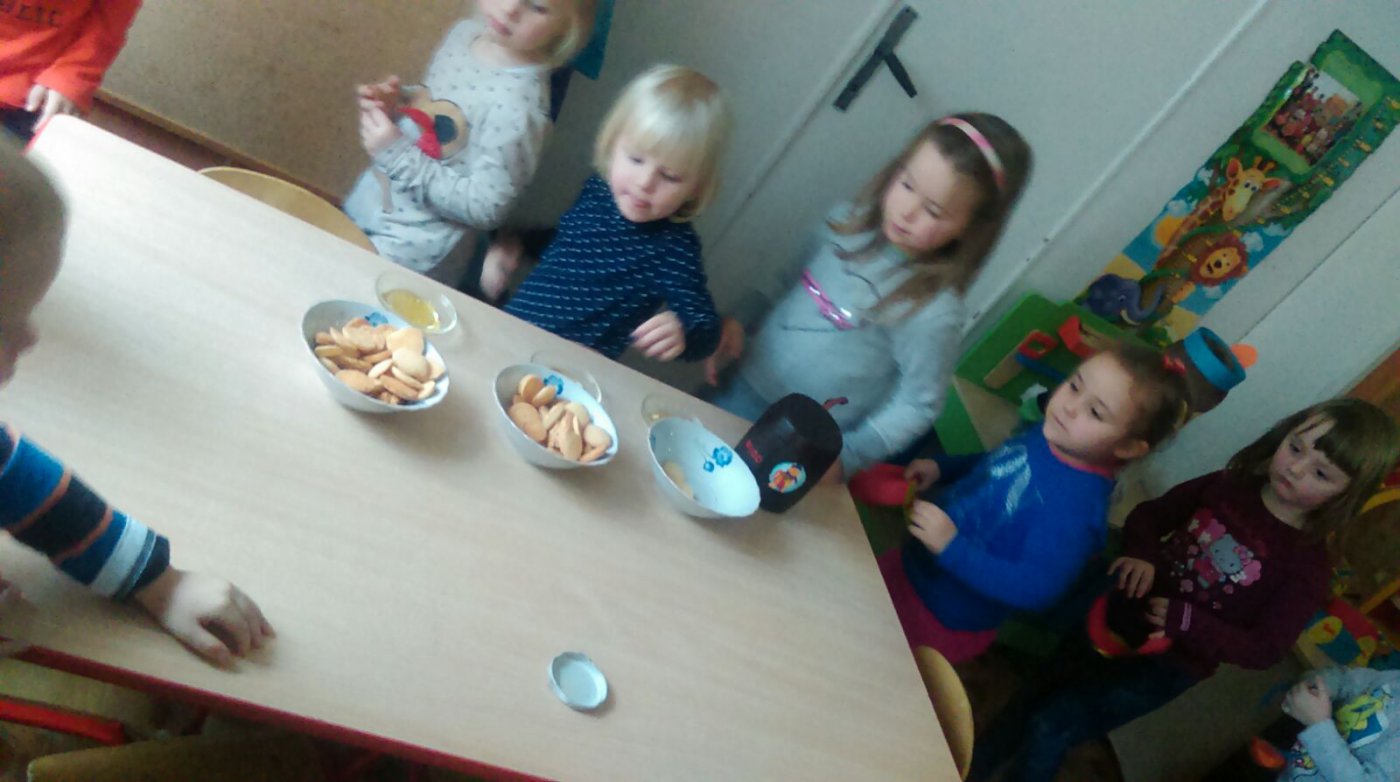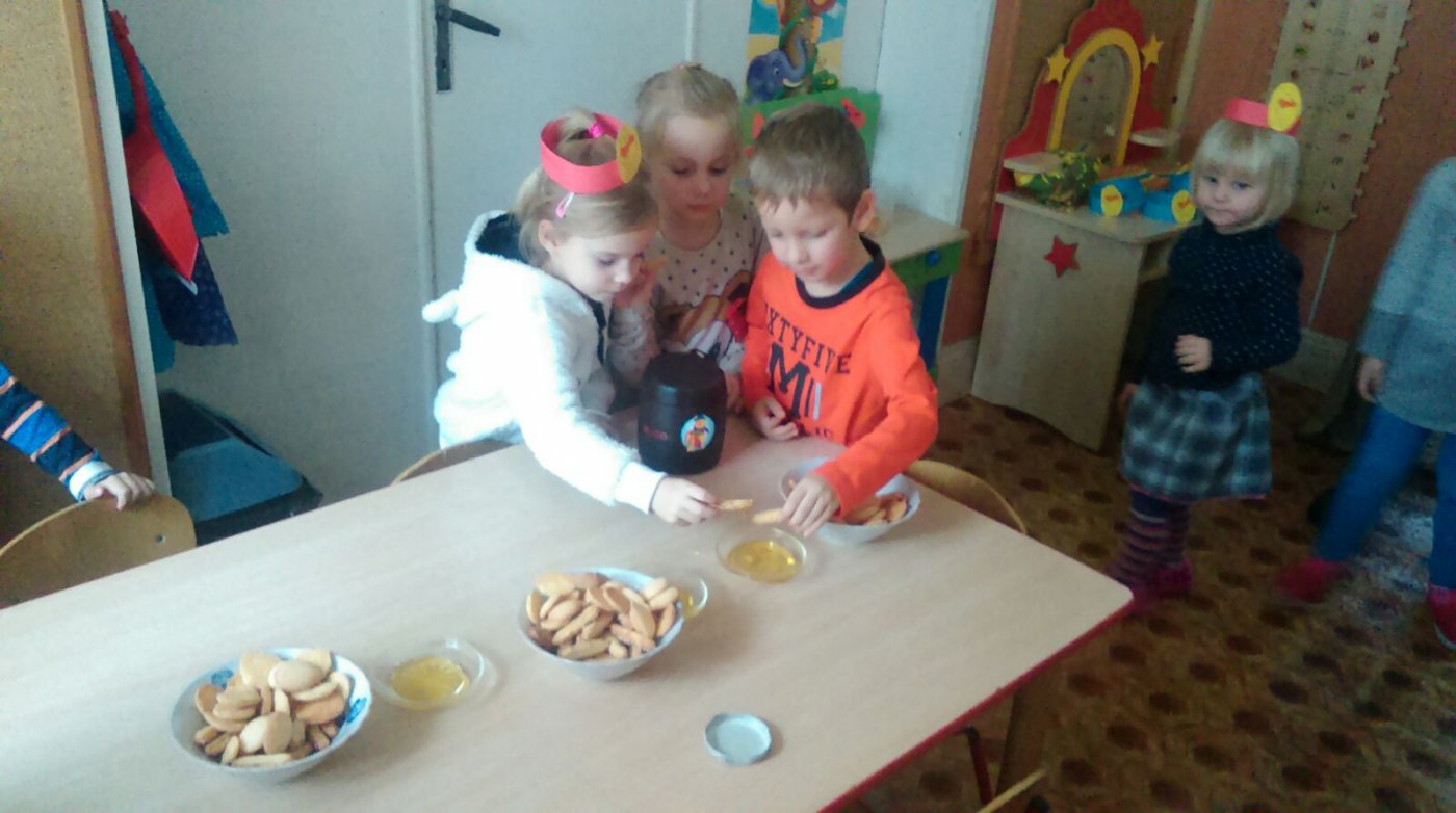 Następnie po odświętnie zaśpiewanym "Sto lat", przedszkolaki próbowały pysznego Kubusiowego miodku z ciasteczkami.