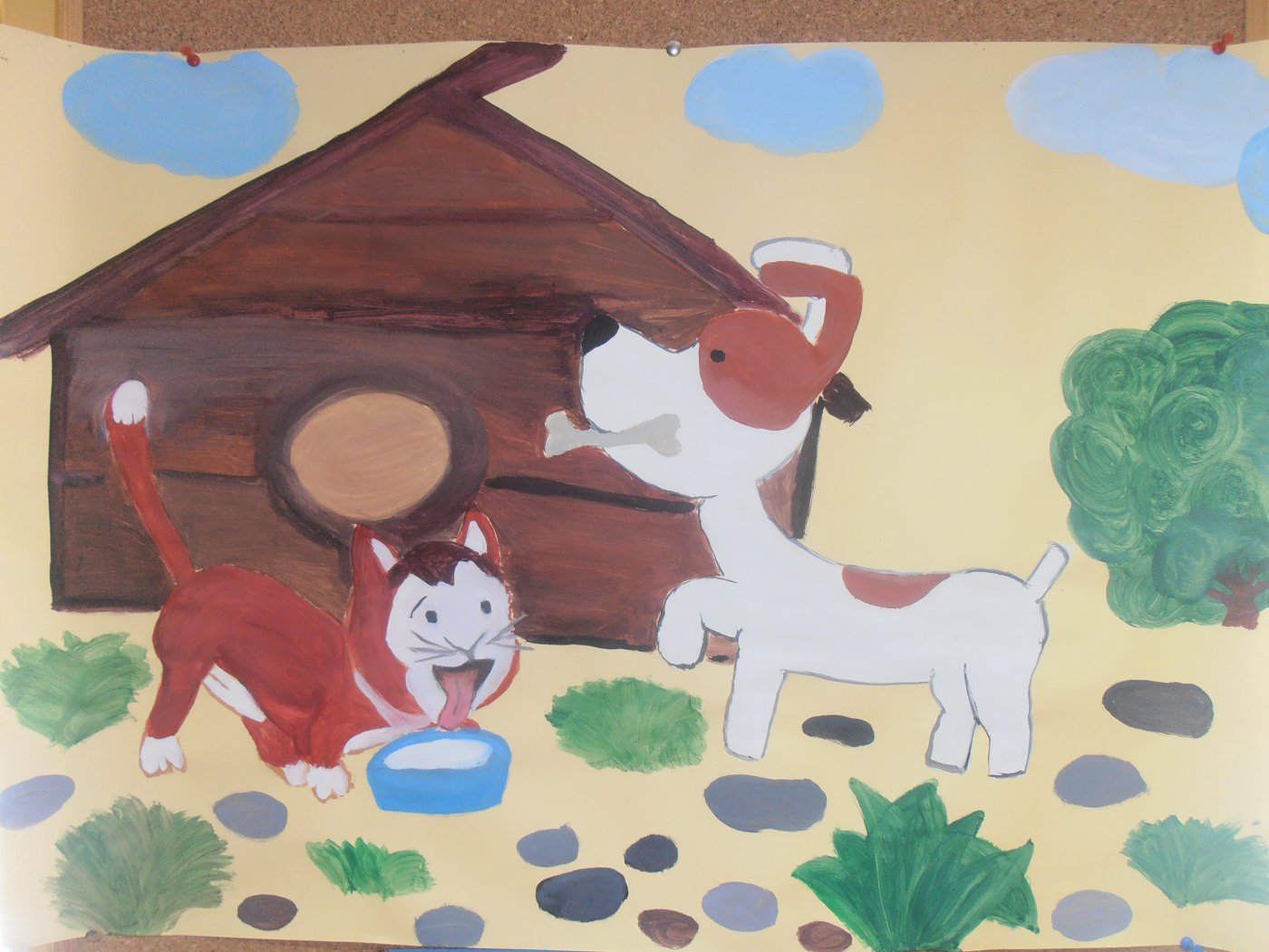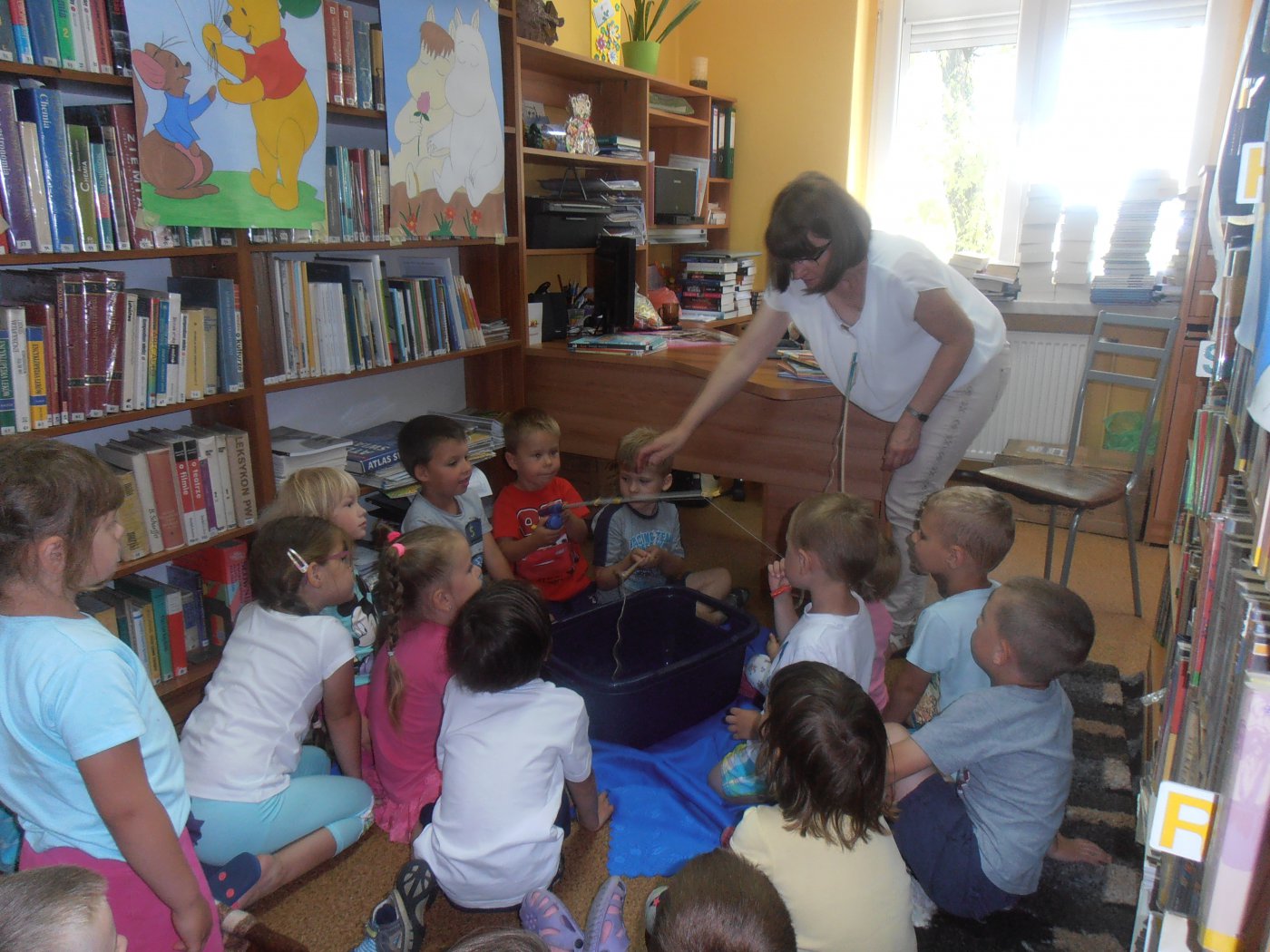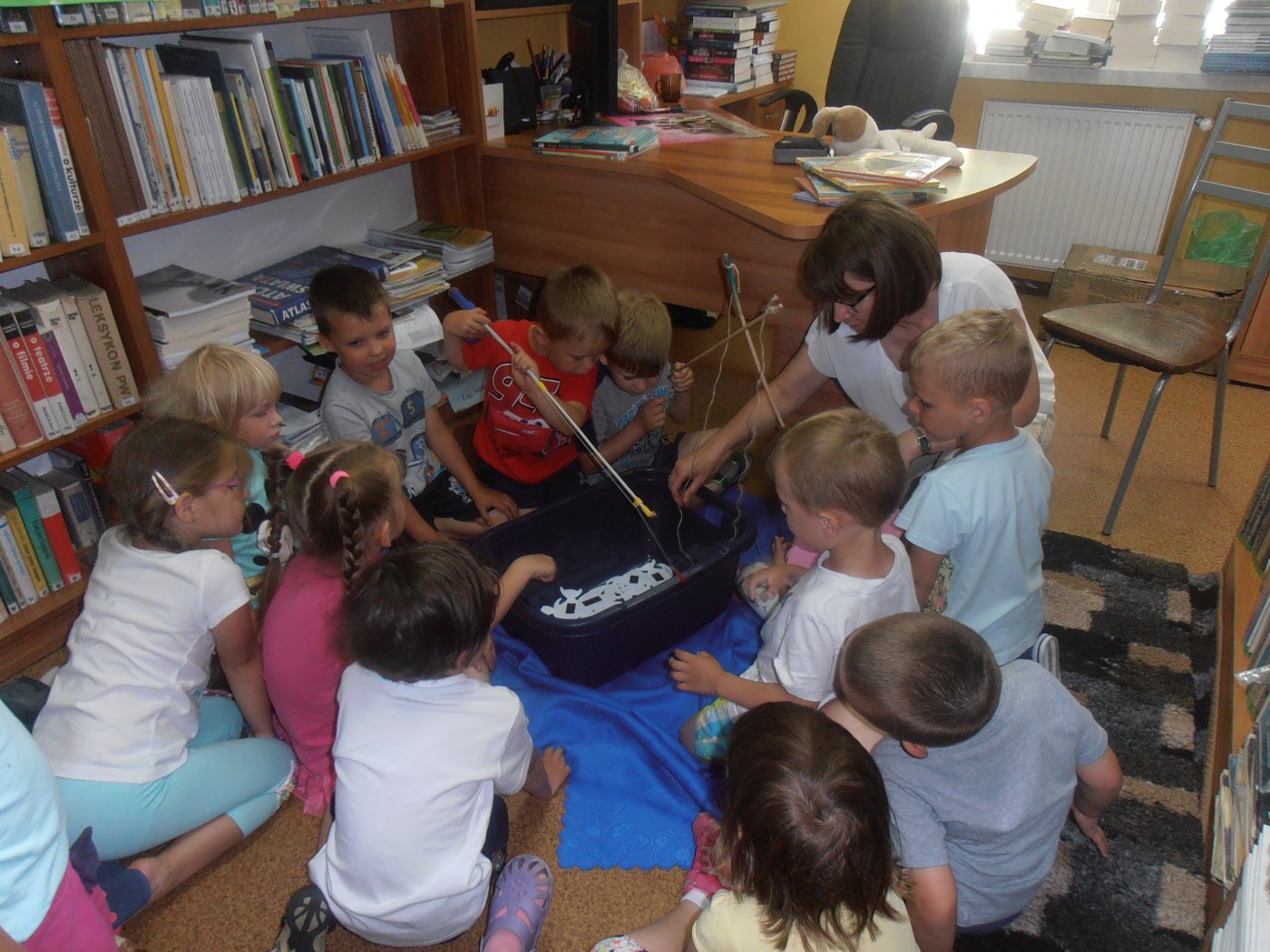 Dzieci bardzo chętnie opowiadały o swoich pieskach, dyskutowano o tym jak opiekować się swoim pupilem oraz jak zachować się wobec nieznanego nam czworonoga. Dowiedziały się także jak różne psy pomagają ludziom, często także ratując im życie. Nawiązując do czytanej historii przypomniane zostały zasady bezpieczeństwa nad wodą i w innych miejscach odwiedzanych podczas wakacji. Na zakończenie przedszkolacy razem z Reksiem łowili rybki - zagadki, wspaniale się przy tym bawiąc.