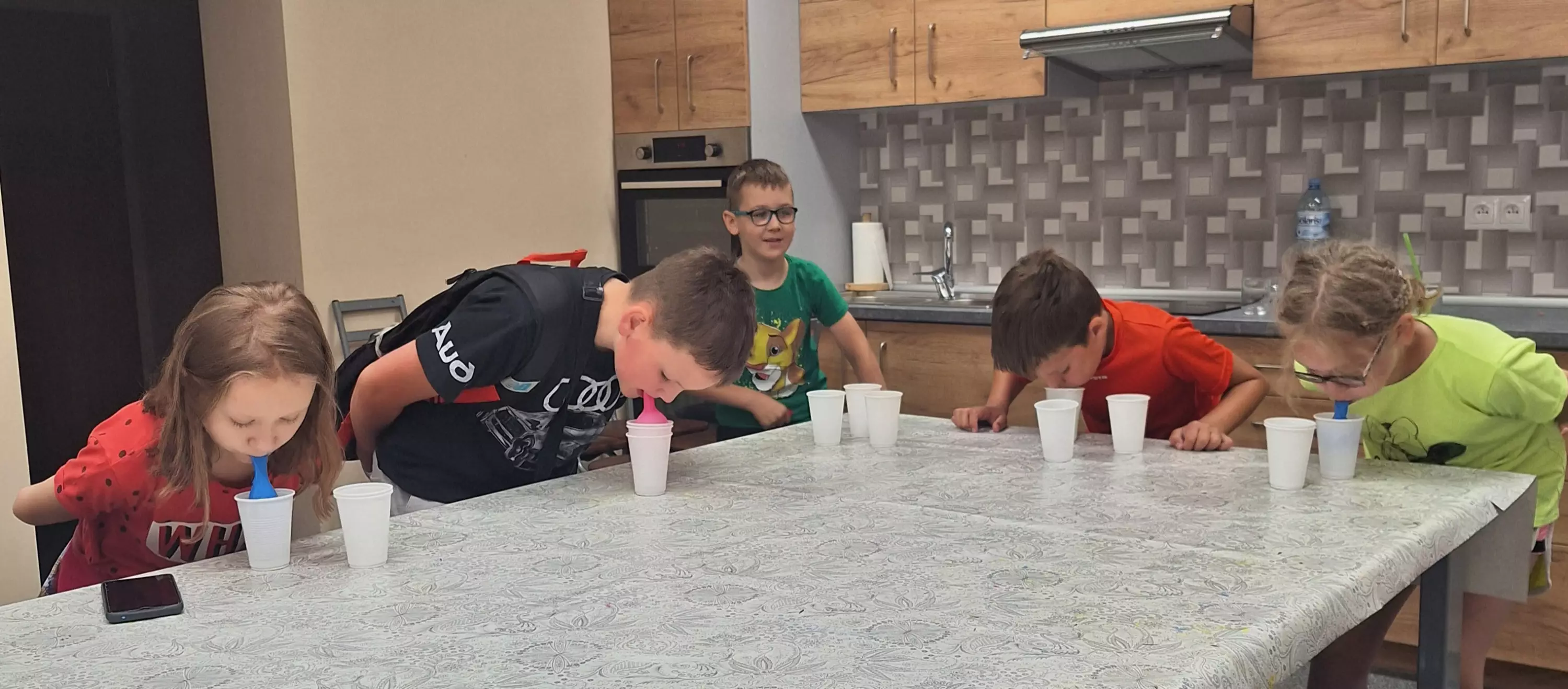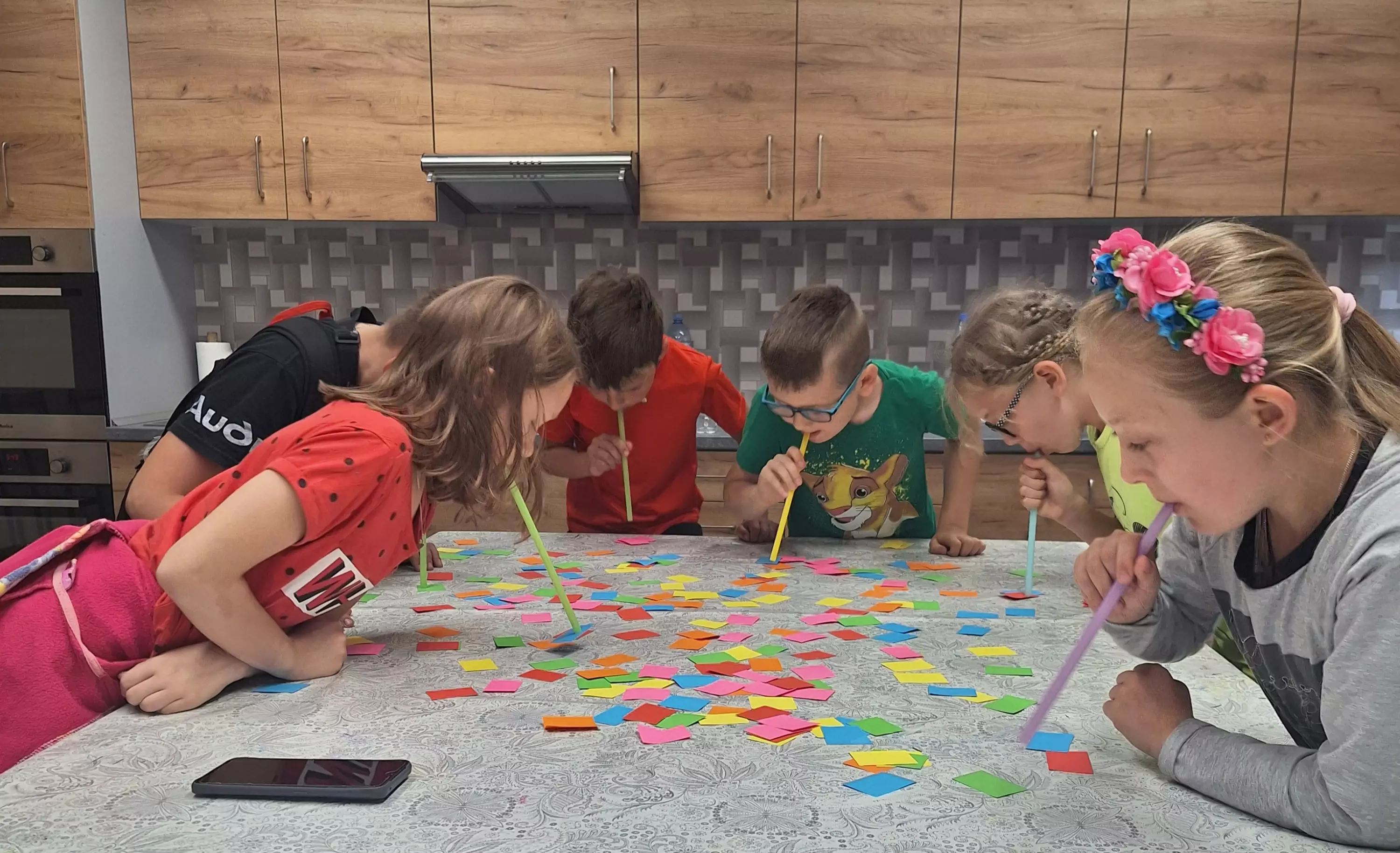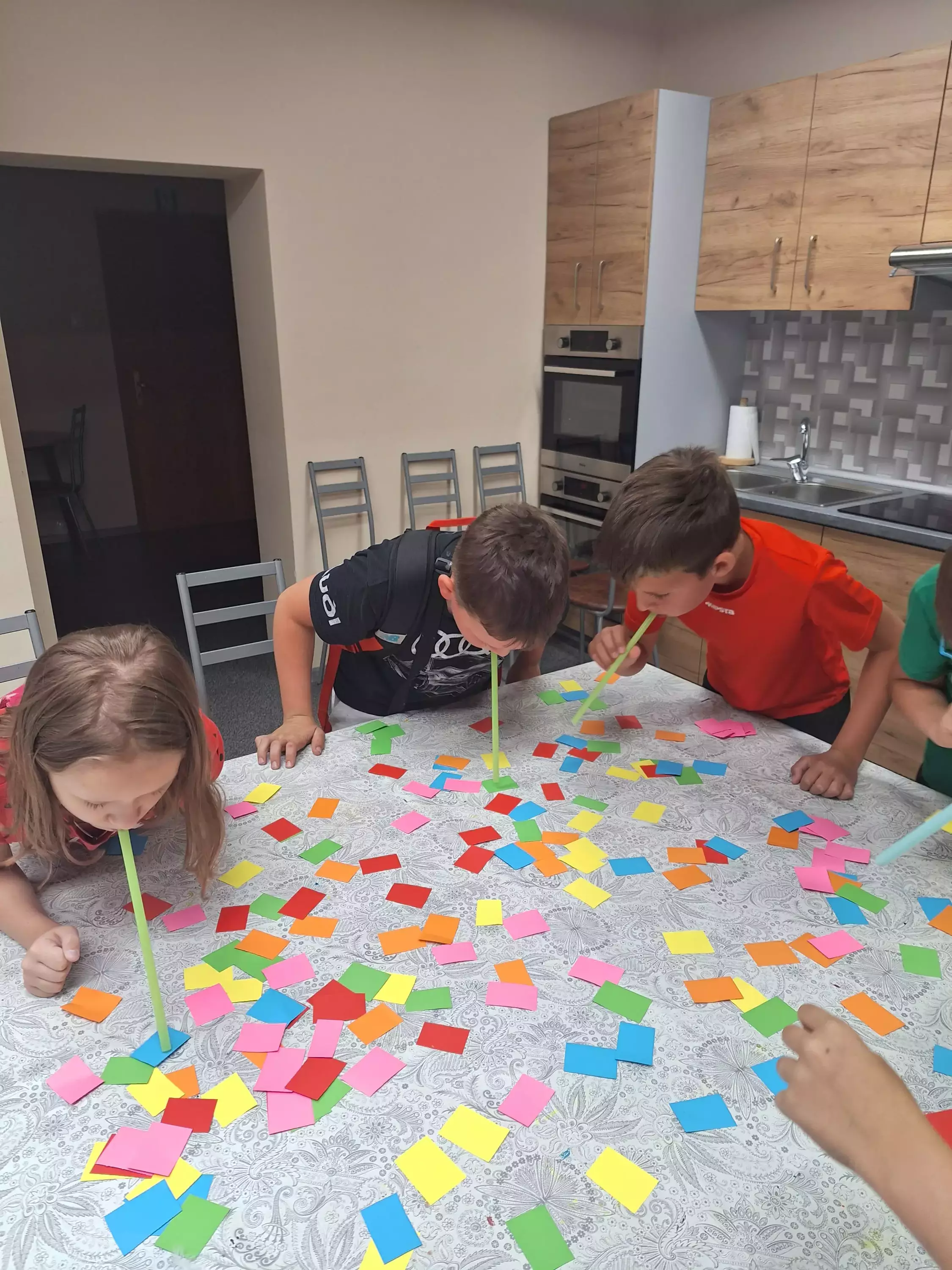 Chłopak sypie piaskiem pomalowany farbami talerzy.Chłopczyk i dziewczynka malują farbami.Dziewczynki malują farbami talerzyk papierowy.Dziewczynka i chłopczyk z kolorowego papieru wykonują parasol.Prace plastyczne.Dzieci bawią się w wyścigi statków.Dzieci bawią się w wyścigi statków.Chłopcy wykonują kolorowe łapacze.Chłopak i dziewczyna nawlekają koraliki.Łapacze wakacyjnych przygód.Dzieci bawią się w zabawę dmuchając balonik.Dzieci dmuchają baloniki w kubeczkach i składają je razem.Dzieci bawią się w zbieranie kolorowych karteczek słomkami.Dzieci bawią się w zbieranie kolorowych karteczek słomkami.Dzieci rozgrywają mini turniej gry Państwa-Miasta.