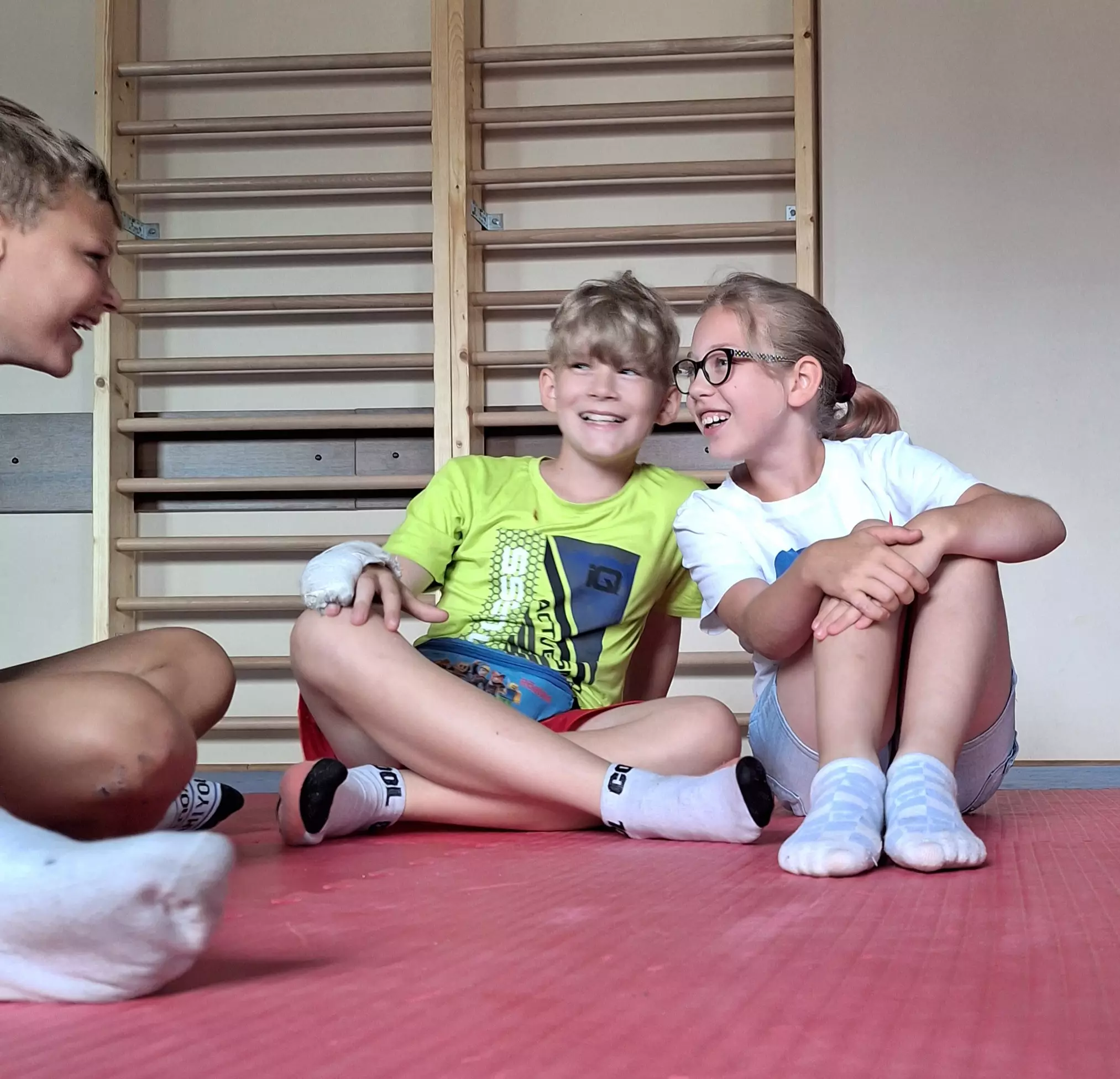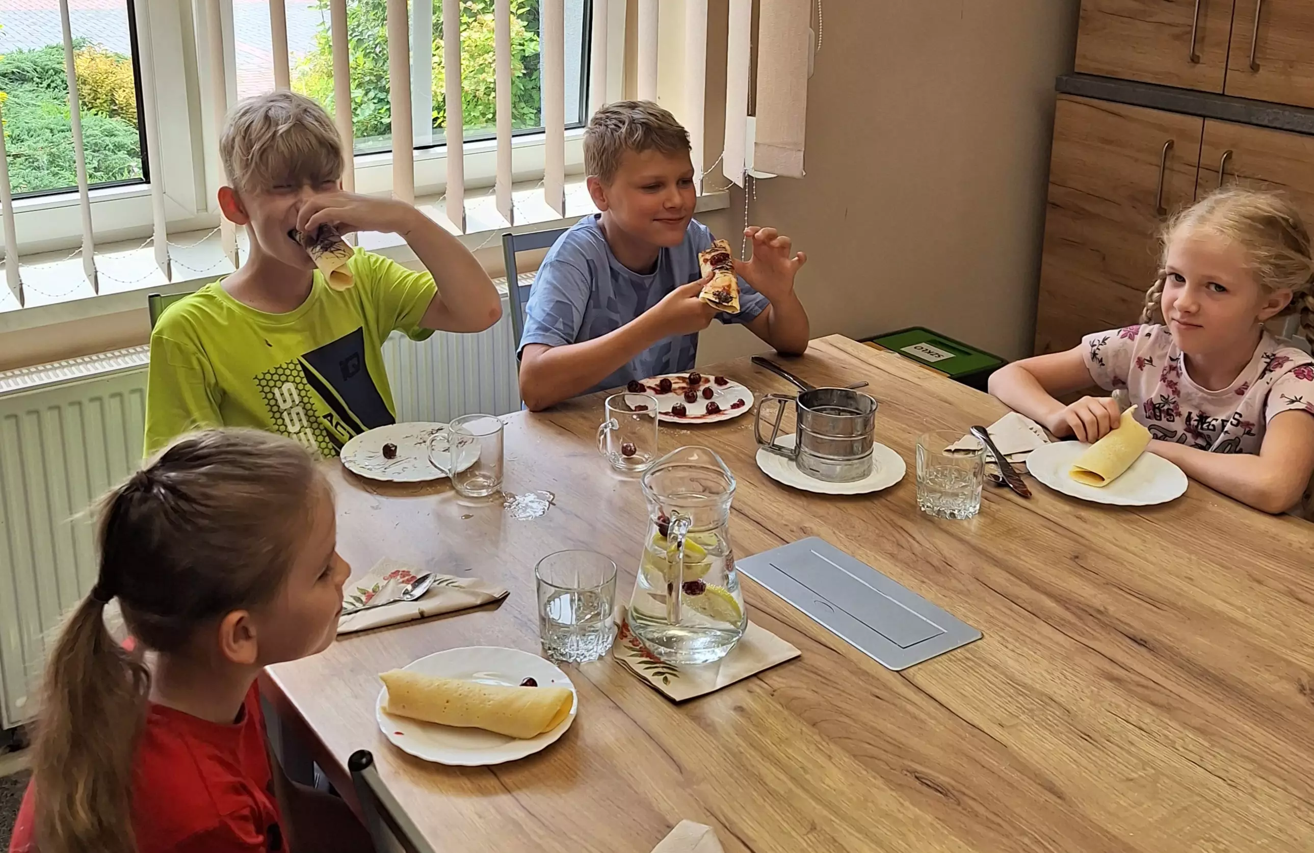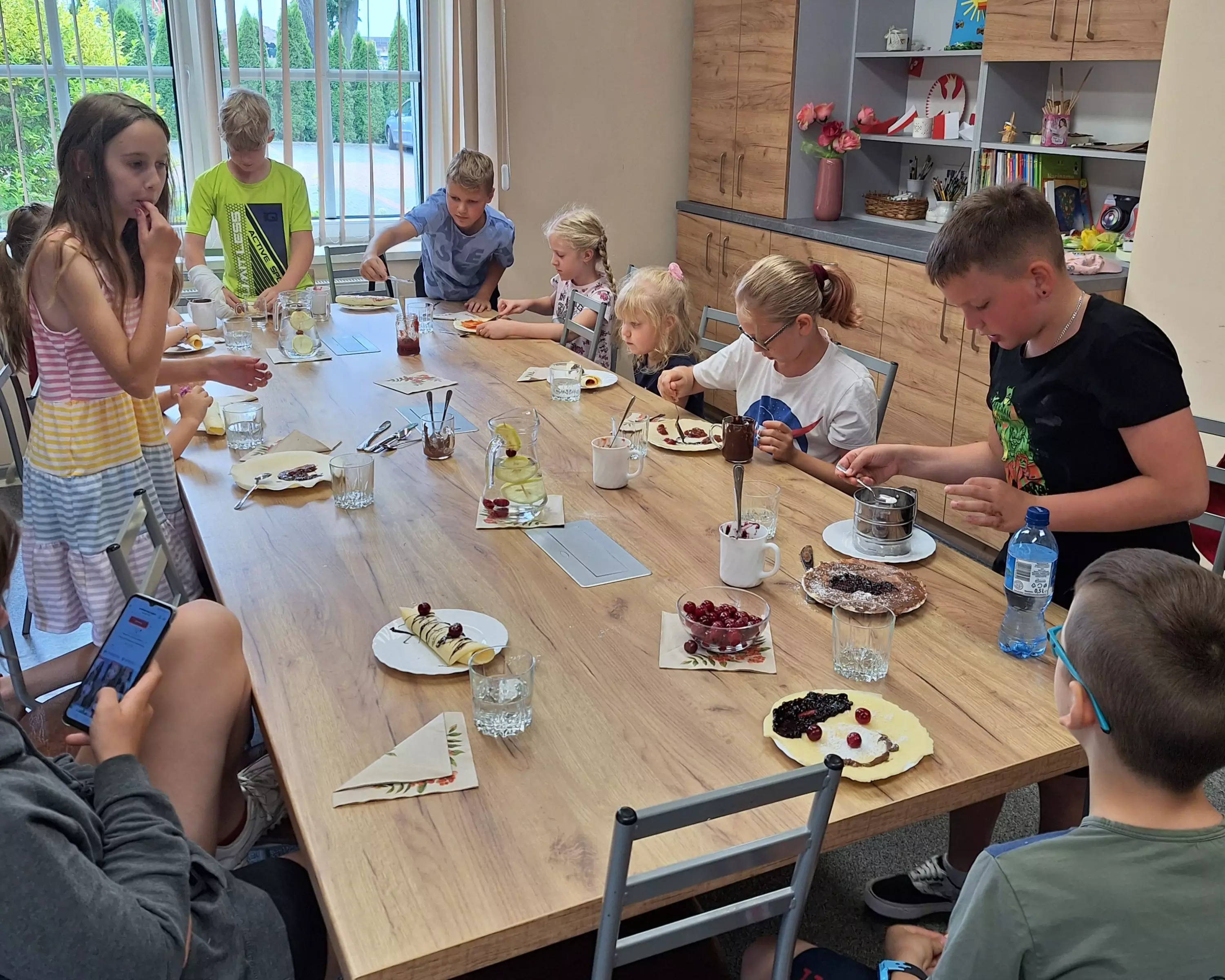 Dzieci ozdabiają naleśniki na mini konkurs.Dzieci ozdabiają naleśniki dżemem i  owocami.Dzieci ozdabiają naleśniki dżemem i nutellą.Chłopcy ozdabiają naleśniki.NaleśnikiZdjęcie grupowe po zajęciach.Uczestnicy zajęć jedzą naleśniki.Dzieci bawią się w głuchy telefon.Uczestnicy kursu wykonują rysunek farbkami.Kurs rysunku i projektowaniaDzieci malują farbami obraz.
