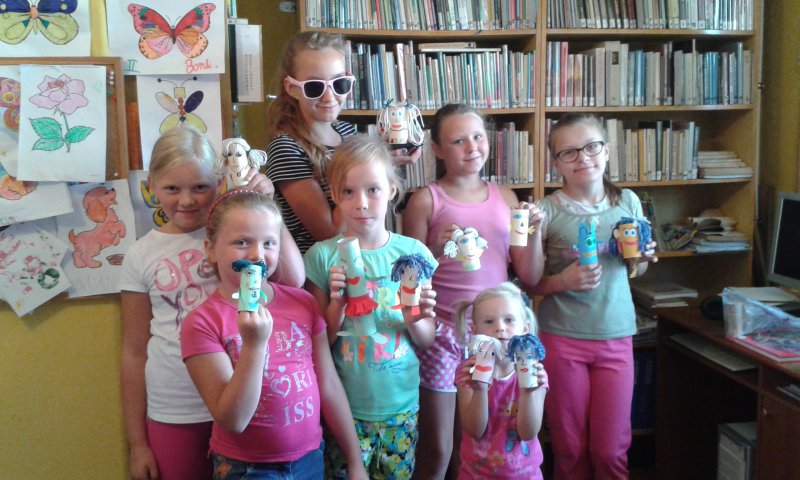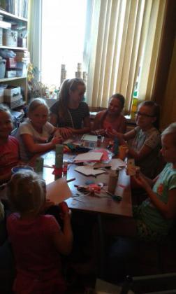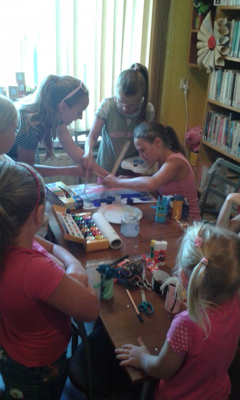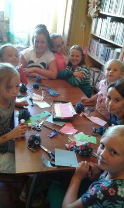 Niezwykle wesoło i twórczo dzieci spędzały wakacyjny czas podczas spotkań w bibliotece w Gwoździanach. Organizowane przez panią Jadwigę Kukowka warsztaty plastyczne i zabawy w otoczeniu książek cieszą sie coraz większą popularnością wśród dzieci.