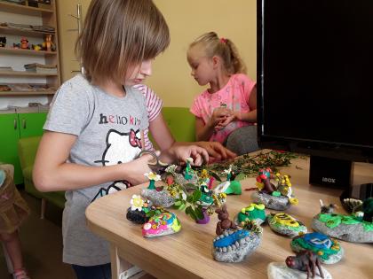 Treści tych baśni dostarczyły wiele pomysłów do wykonania prac plastycznych. I tak z plasteliny powstały słowiki i stokrotki a z tutek po papierze toaletowym strojne syrenki, zaś pomalowane i ozdobione wytłoczki do jajek zmieniły się w makiety dna morza oraz kolorowe stonogi. Natomiast z różnobarwnych guzików wykonano bardzo ciekawe kompozycje.