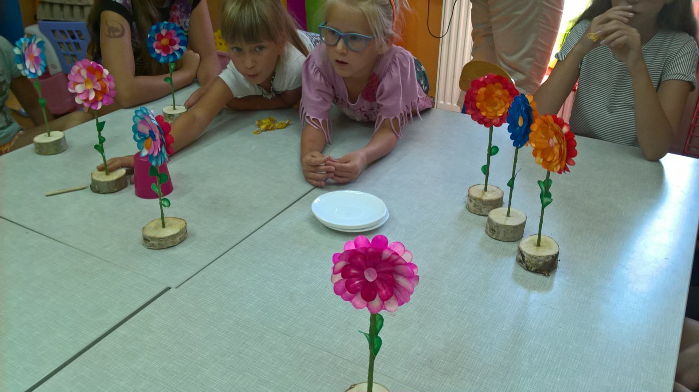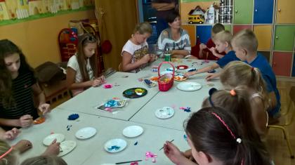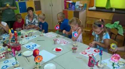 Natomiast 8 sierpnia Pani Katarzyna Koza z LCSK przeprowadziła zajęcia plastyczne. Dzieci robiły kwiatki z osikowych płatków oraz dmuchawce za pomocą rolki papieru i farb. Dziękujemy Pani Dyrektor Przedszkola za możliwość korzystania podczas zajęć z sali.