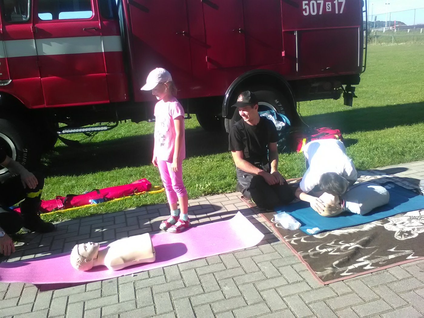 Wielką atrakcją w czasie wakacji było spotkanie ze strażakami z OSP w Dralinach, którzy kolejny raz odwiedzili bibliotekę z pokazami udzielania pierwszej pomocy i gaszenia pożaru.
