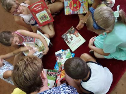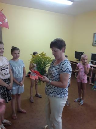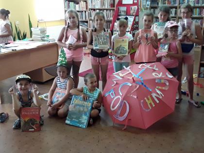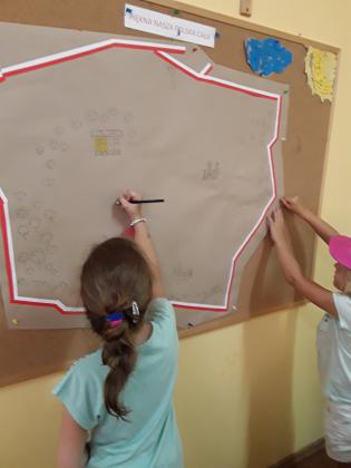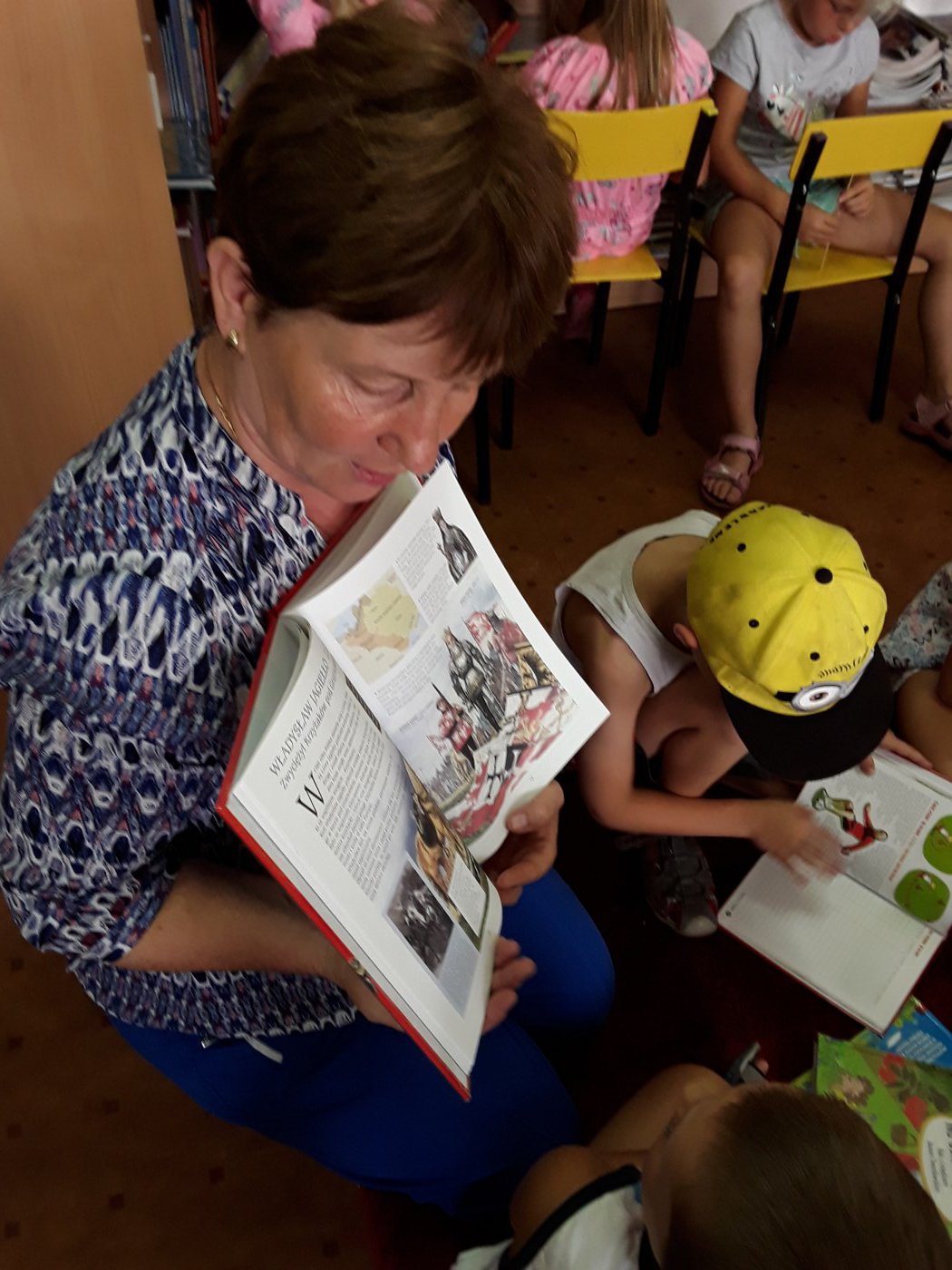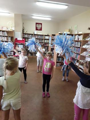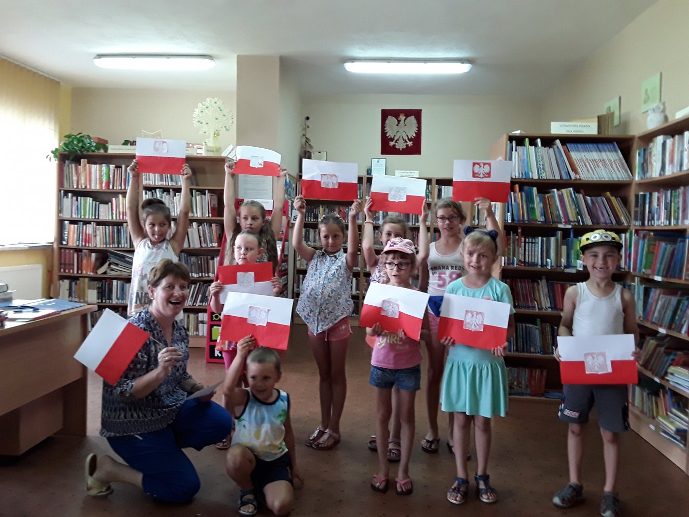 Z okazji zbliżających się obchodów 100-lecia Niepodległości Polski w księgozbiorze dla dzieci wyszukiwano pozycje dotyczące historii ojczyzny. Uczestnicy przypomnieli sobie jakie mamy symbole narodowe, a przez całe wakacje kolorowano obraz pt. „Piękna nasza Polska cała”. Nauczono się też piosenki pt. ”Jestem Polakiem”. Poznano układy taneczne do utworów „Koła autobusu kręcą się” i ” Idziemy do ZOO”.