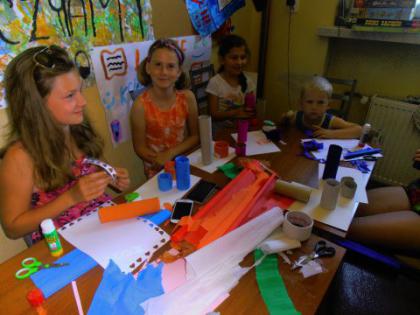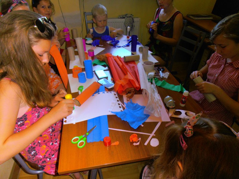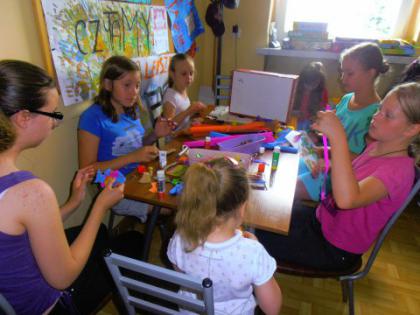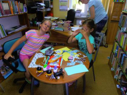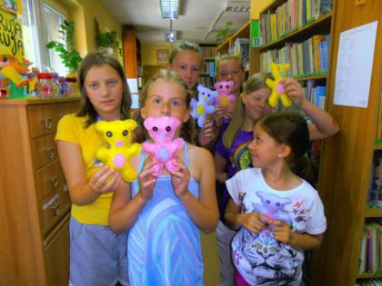 Od 29 czerwca do 7 sierpnia, w każdy poniedziałek, środę i piątek dzieci uczestniczyły w zajęciach w bibliotece. Bardzo chętnie brano udział w warsztatach plastycznych, w zabawach i grach. Powstały przedziwne stwory z rolek, ozdoby, malowane wazoniki i plastelinowe zwierzaczki - cudaczki. Największą atrakcją było  szycie pluszowych misiaczków i ptaków, które powędrowały z dziećmi do domów jako pamiątki z wakacji w bibliotece.