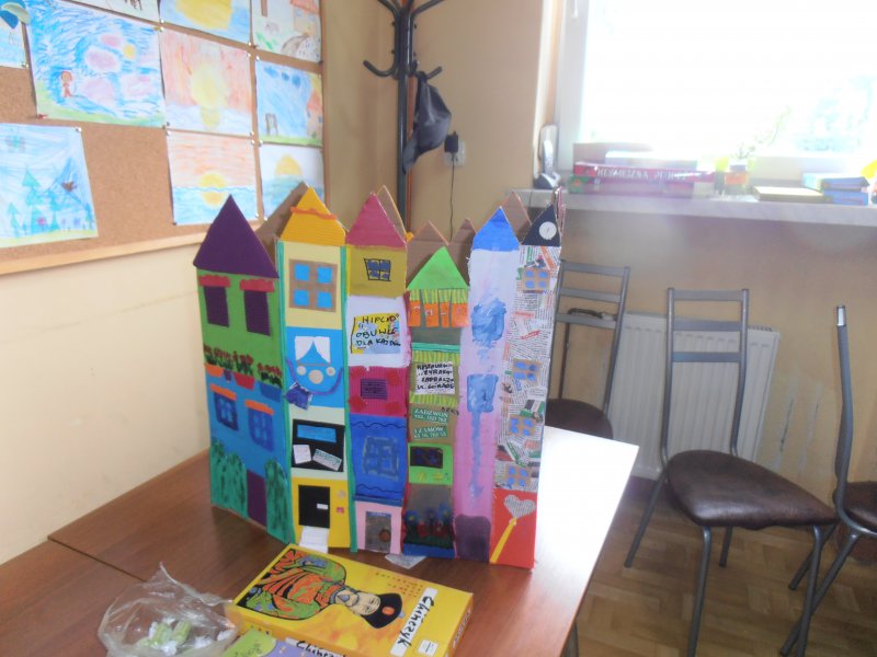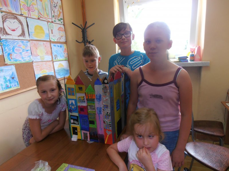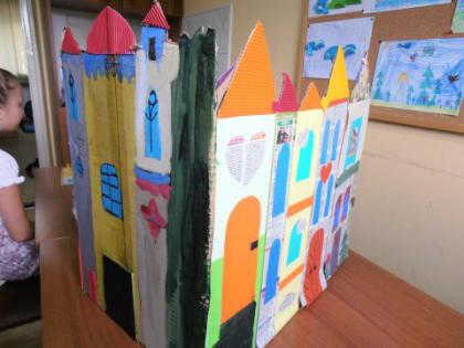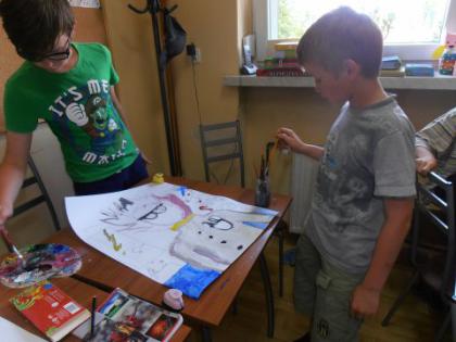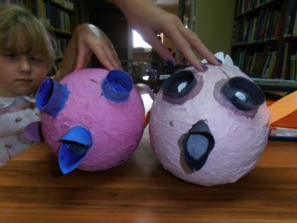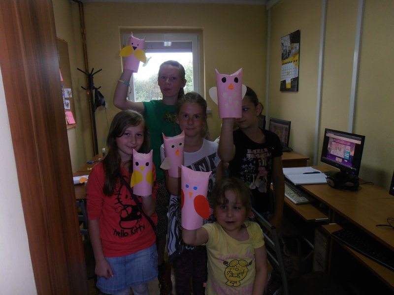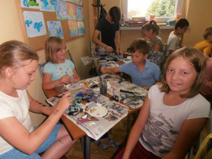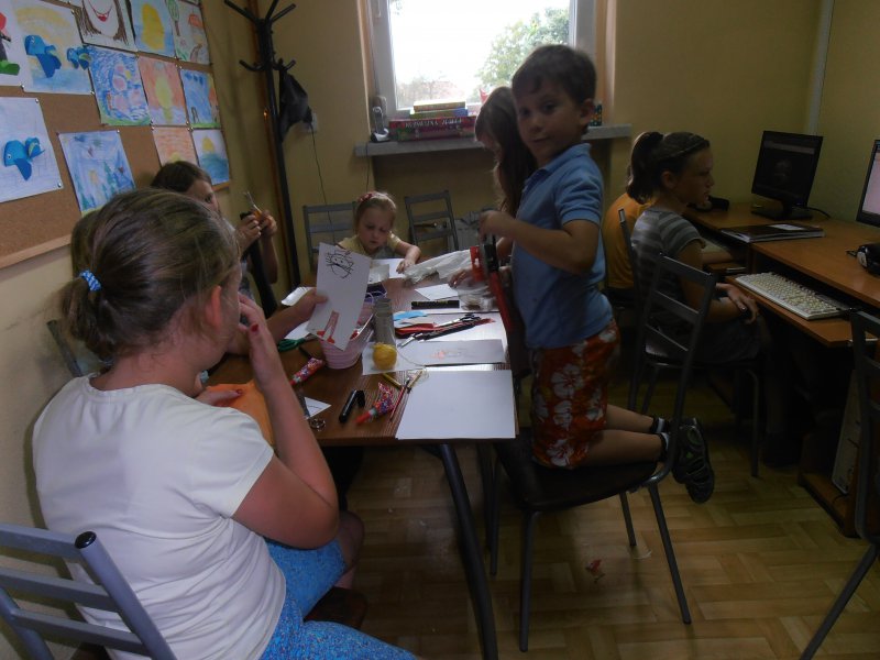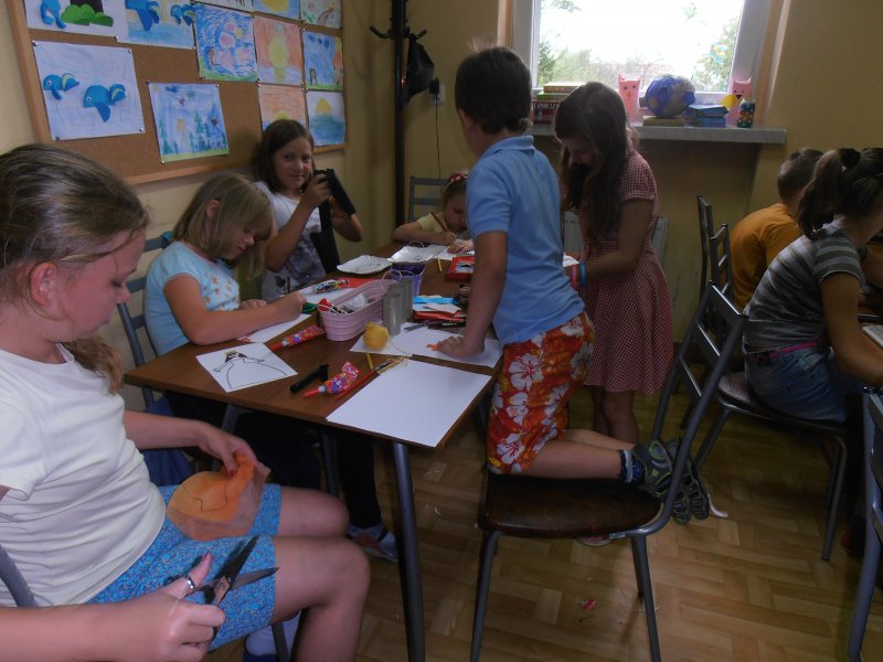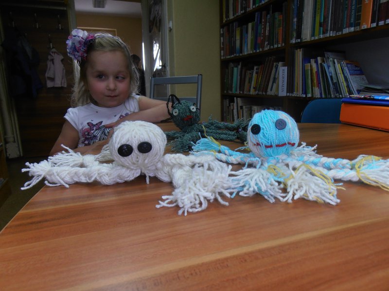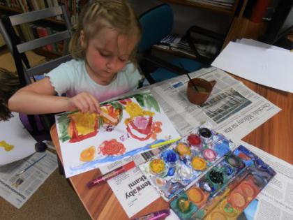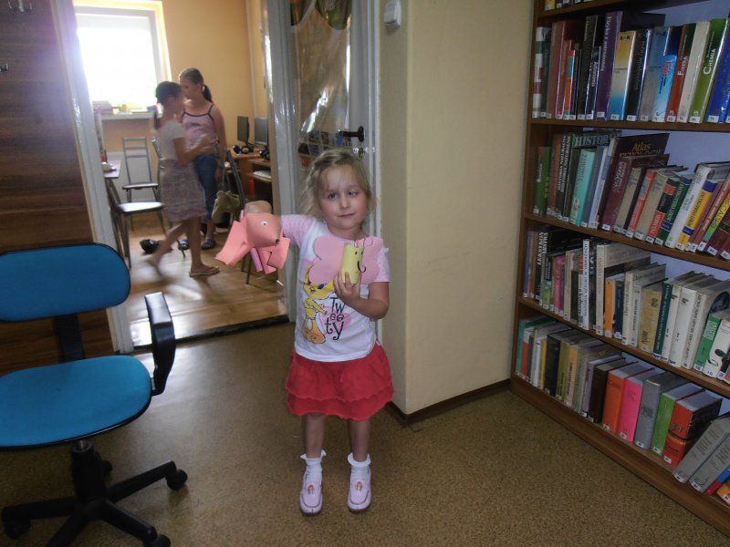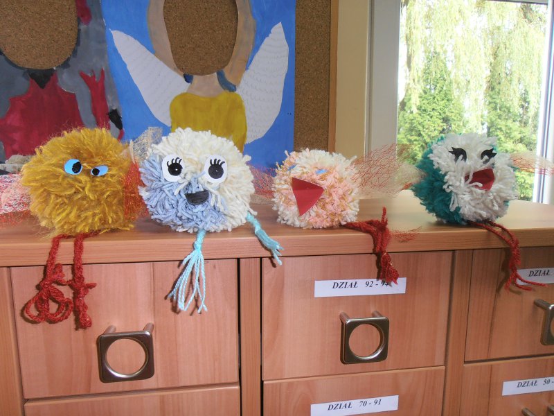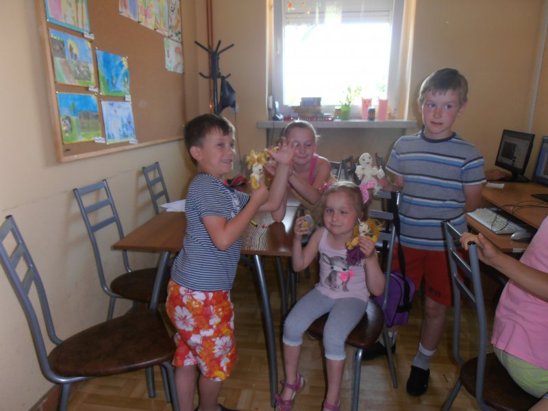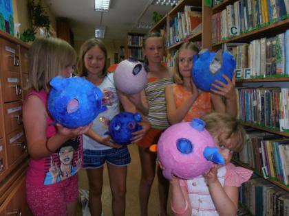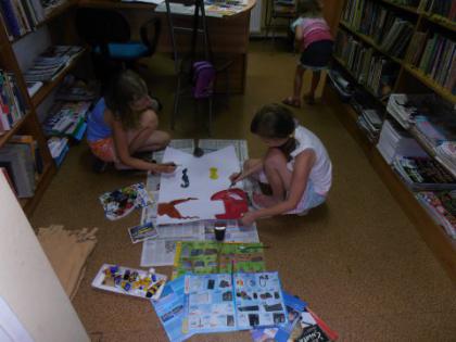 W czasie wakacji nasza biblioteka tętni życiem   Młodzi czytelnicy bardzo chętnie biorą udział w zajeciach plastycznych. Powstała juz kartonowa farma z konikami, wełniane laleczki, bransoletki. Plastelina, modelina, farby, pastele, kredki, bibuła, wełna, kartony to środki z których mali artyści tworzą niezwykłe dzieła.  Dobry humor  i świetna zabawa są z nami codziennie.