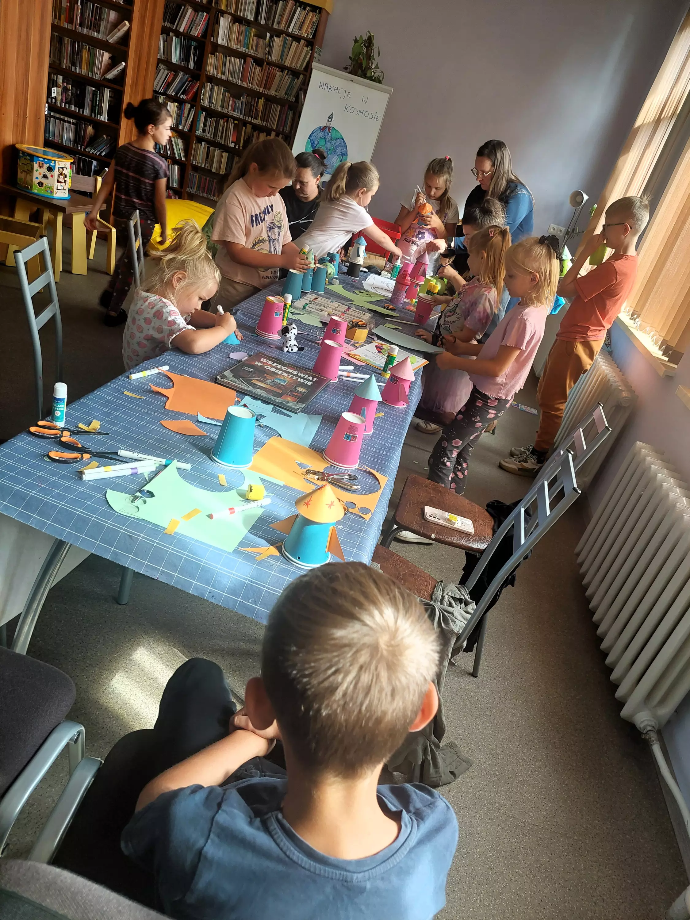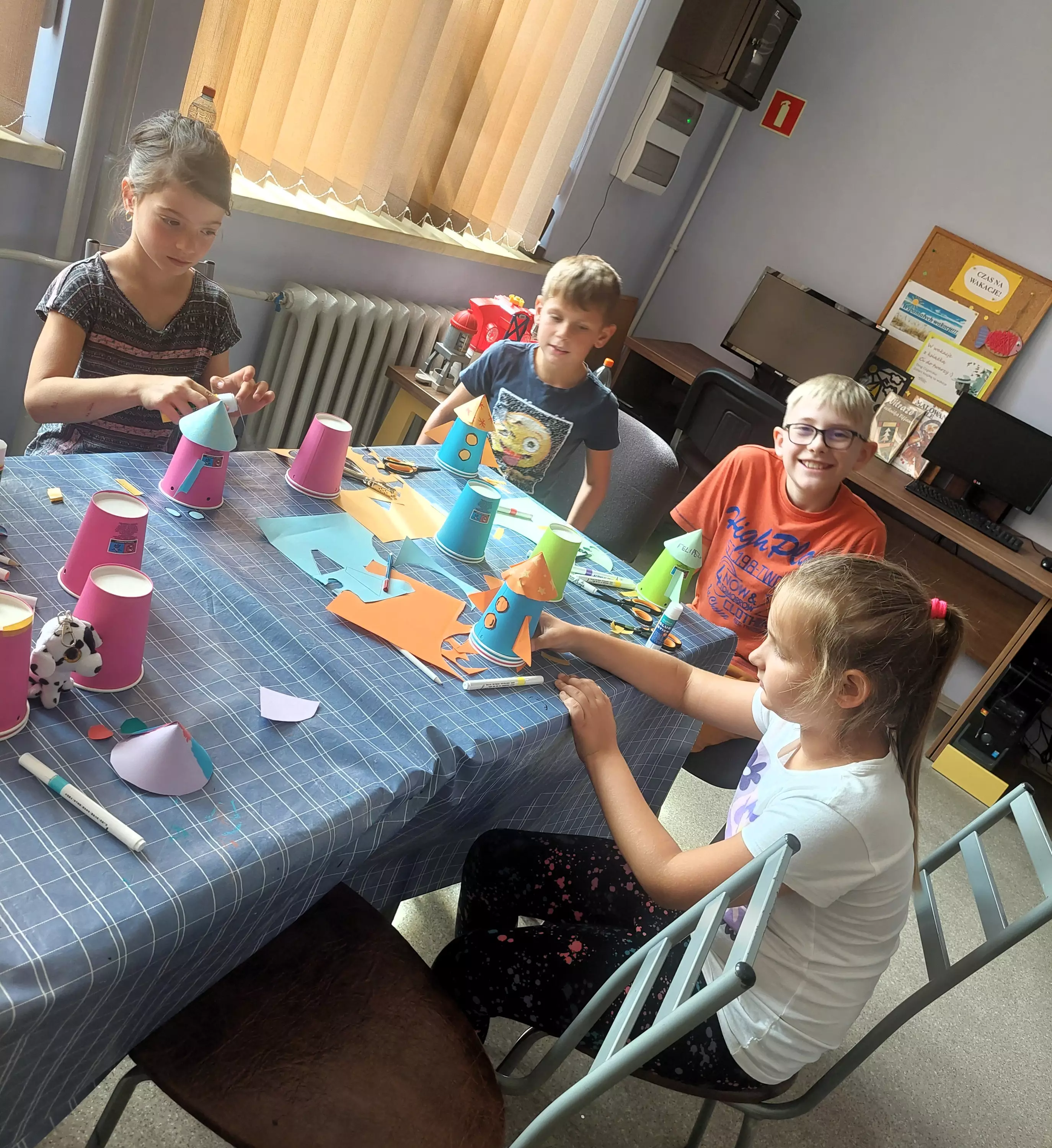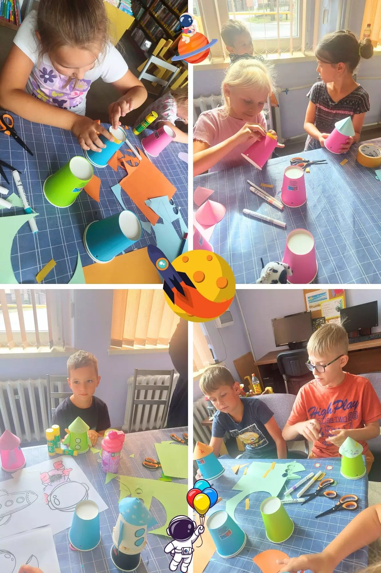 Młodsze dzieci kolorują kredkami rakiety.Dzieci w trakcie klejenia kubeczkowych rakiet.Kolaż zdjęć. Dzieci malują dużą rakietę niebieską farbą oraz robią próby swoich mini rakiet.Dzieci w trakcie robienia rakiet.Dzieci w trakcie robienia rakiet.Dzieci w trakcie robienia rakiet.Dziewczynka prezentuje swoją różową kubeczkową rakietę.Dziewczynka robi próbę skoczności swojej rakety.Grupowe zdjęcie uczestników z ich mini rakietami.Trójka dzieci prezentująca dekoracje.