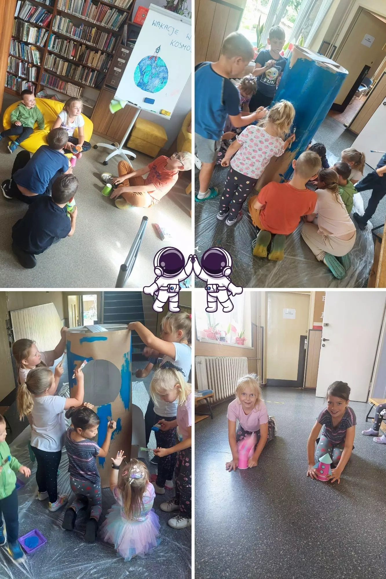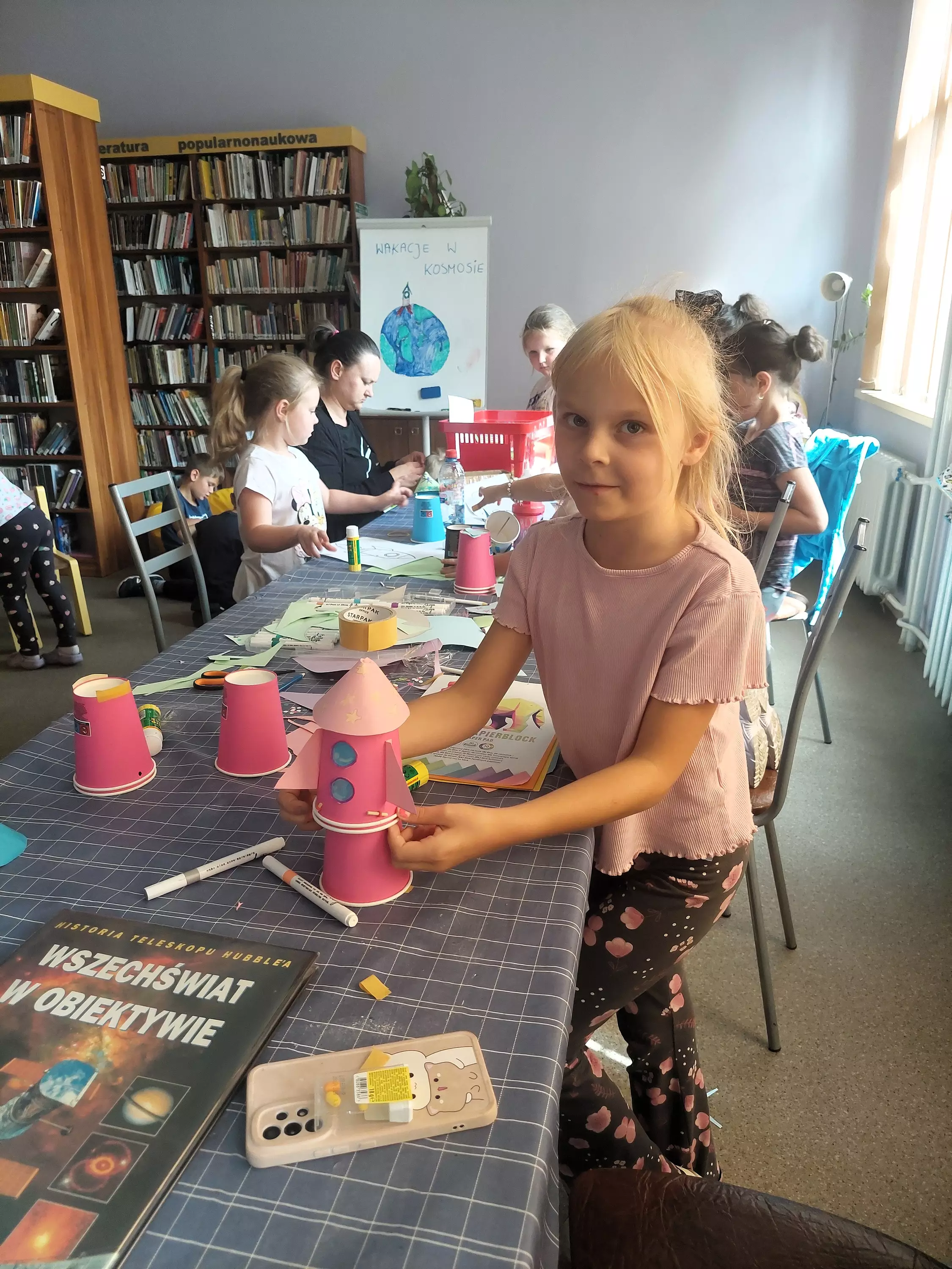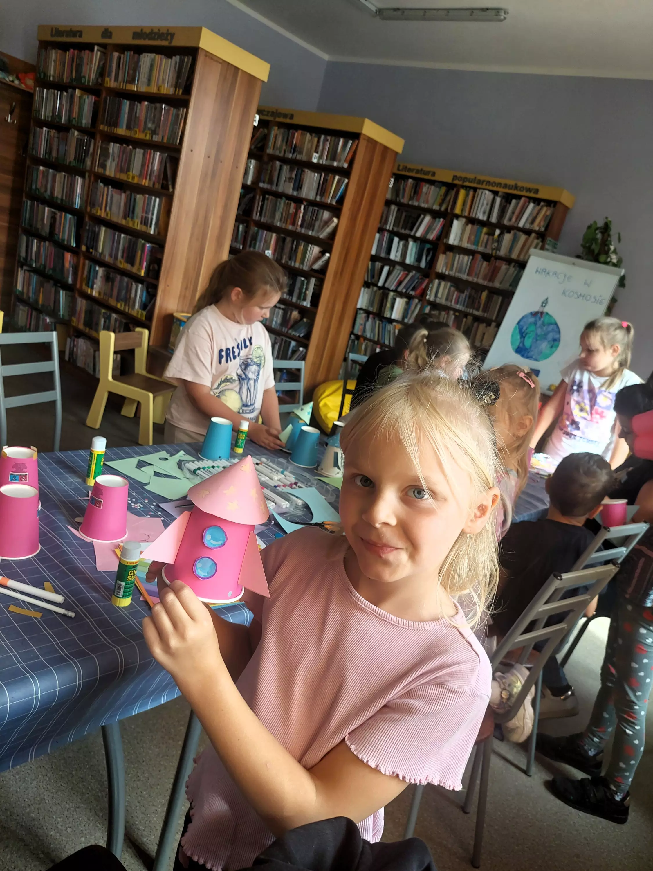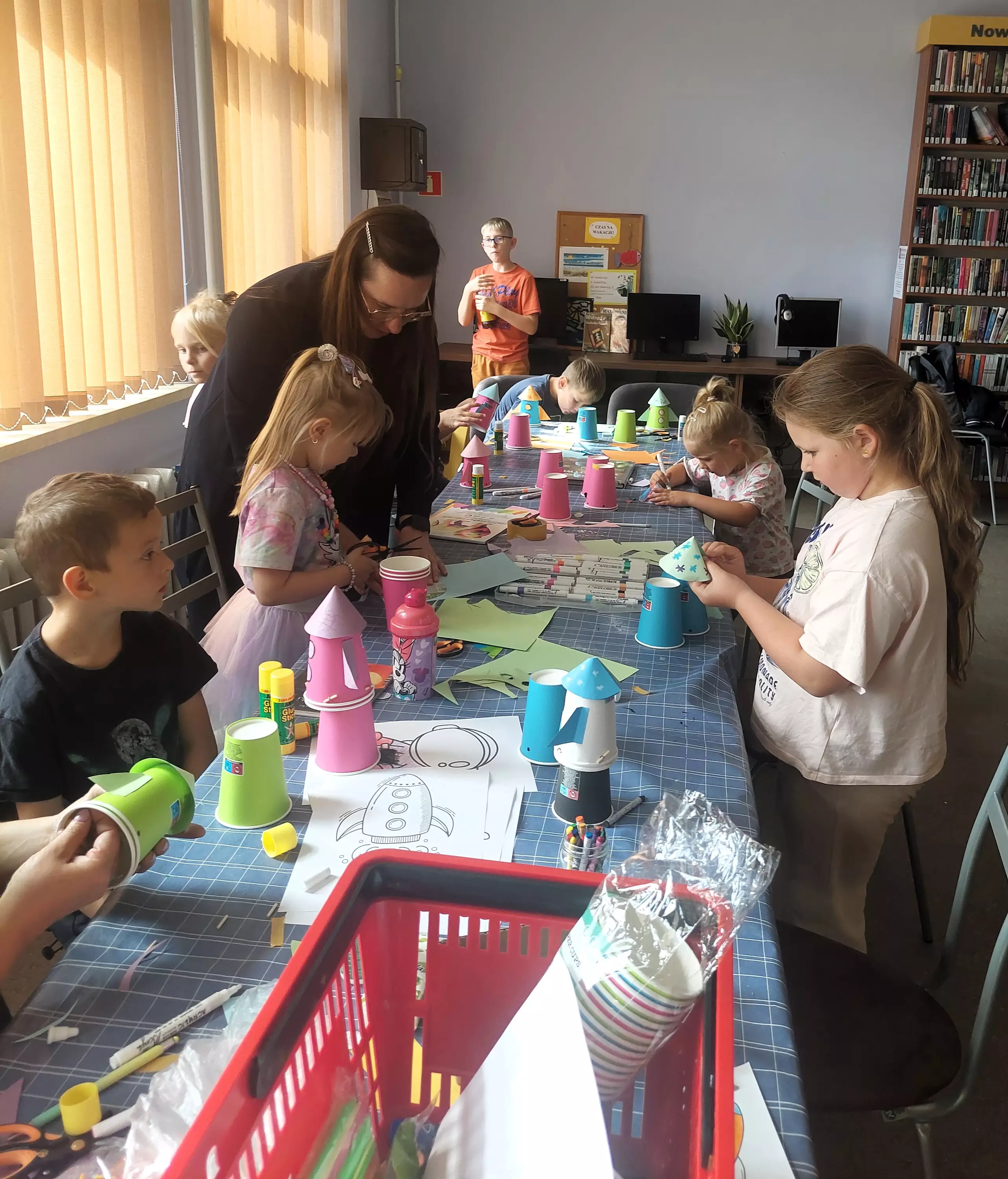 Młodsze dzieci kolorują kredkami rakiety.Dzieci w trakcie klejenia kubeczkowych rakiet.Kolaż zdjęć. Dzieci malują dużą rakietę niebieską farbą oraz robią próby swoich mini rakiet.Dzieci w trakcie robienia rakiet.Dzieci w trakcie robienia rakiet.Dzieci w trakcie robienia rakiet.Dziewczynka prezentuje swoją różową kubeczkową rakietę.Dziewczynka robi próbę skoczności swojej rakety.Grupowe zdjęcie uczestników z ich mini rakietami.Trójka dzieci prezentująca dekoracje.