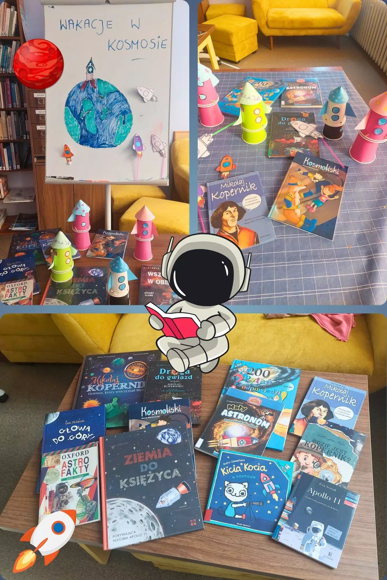 kolaż zdjęć, który przedstawia wystawkę książek o kosmosie oraz gazetkę.