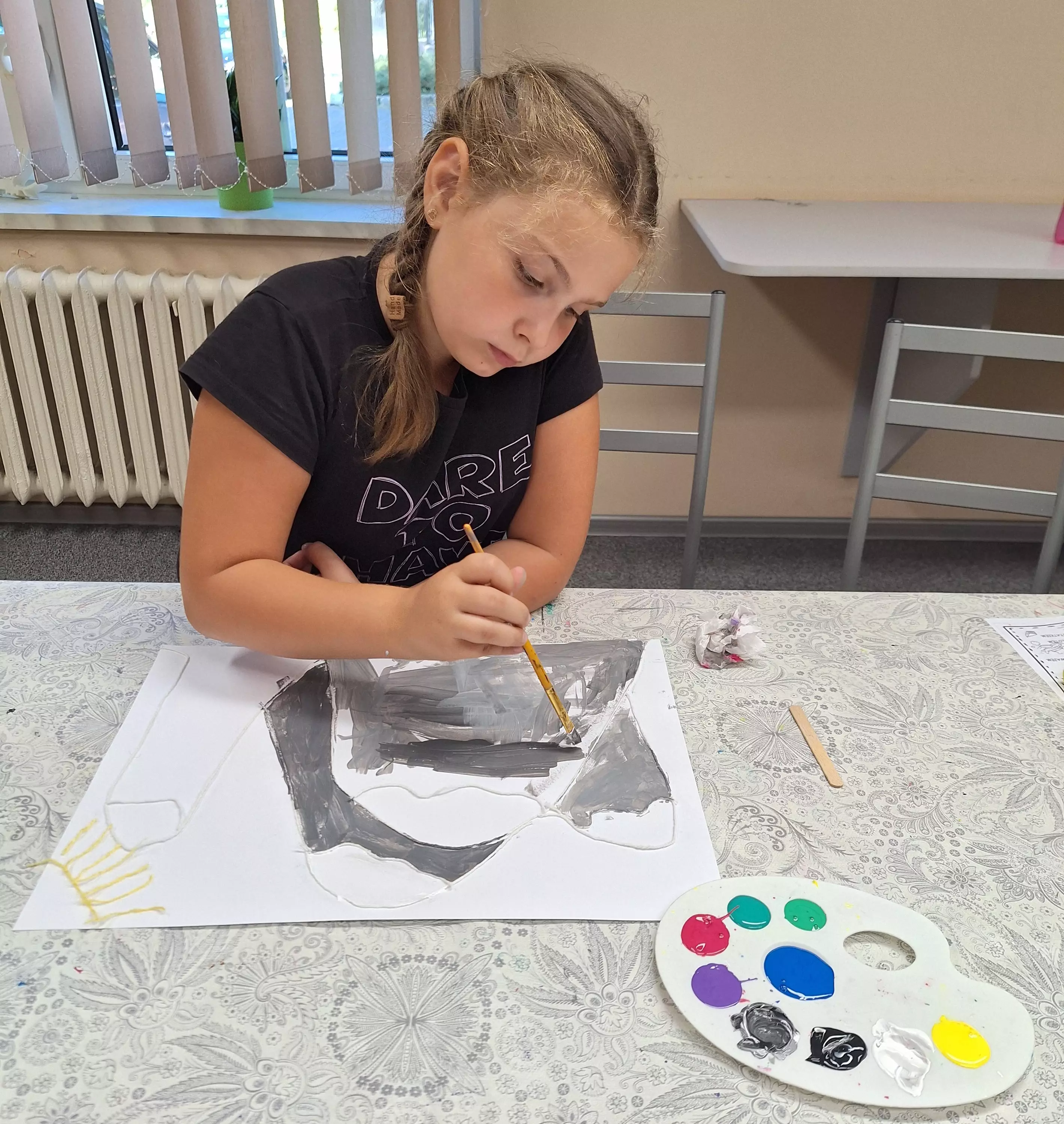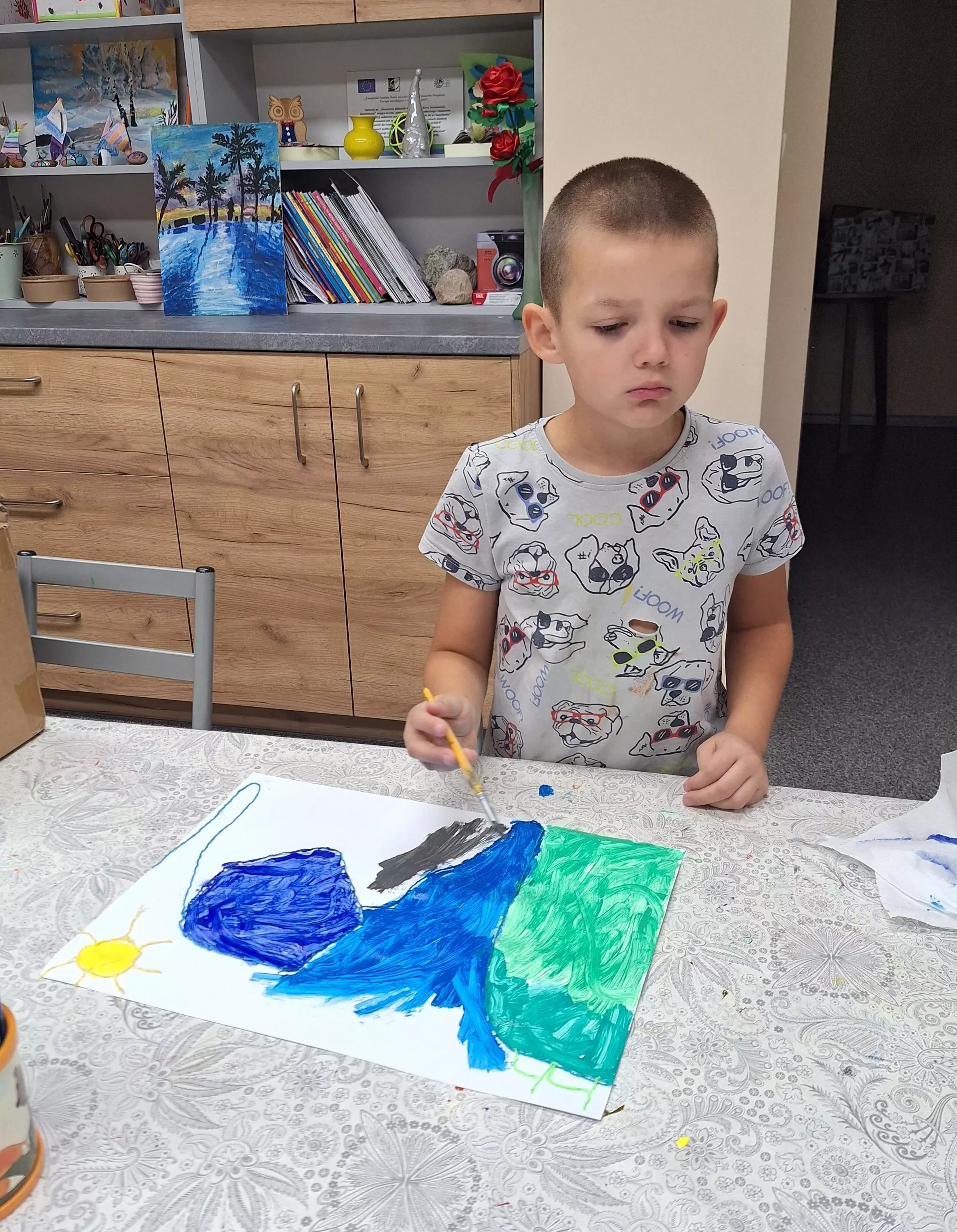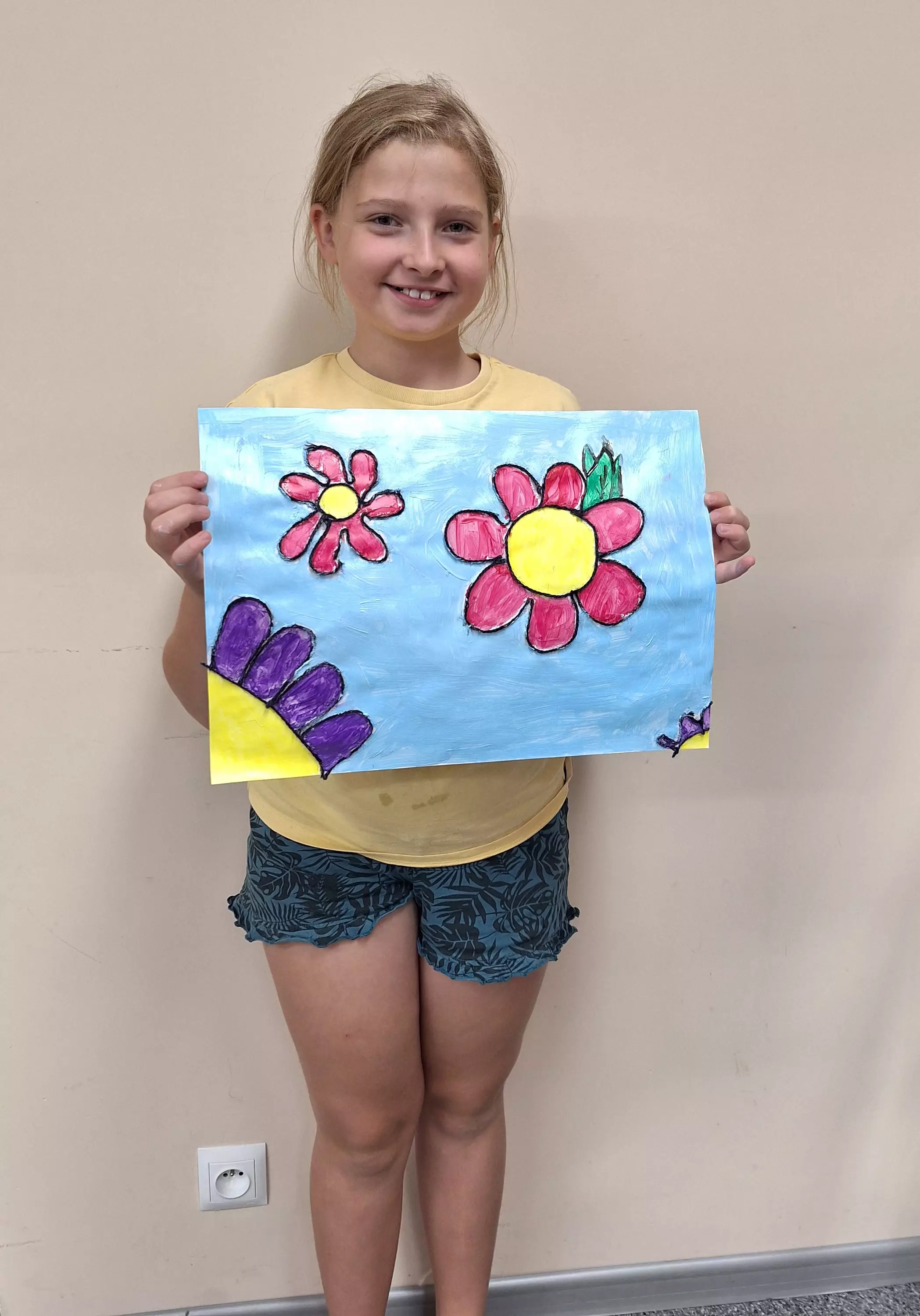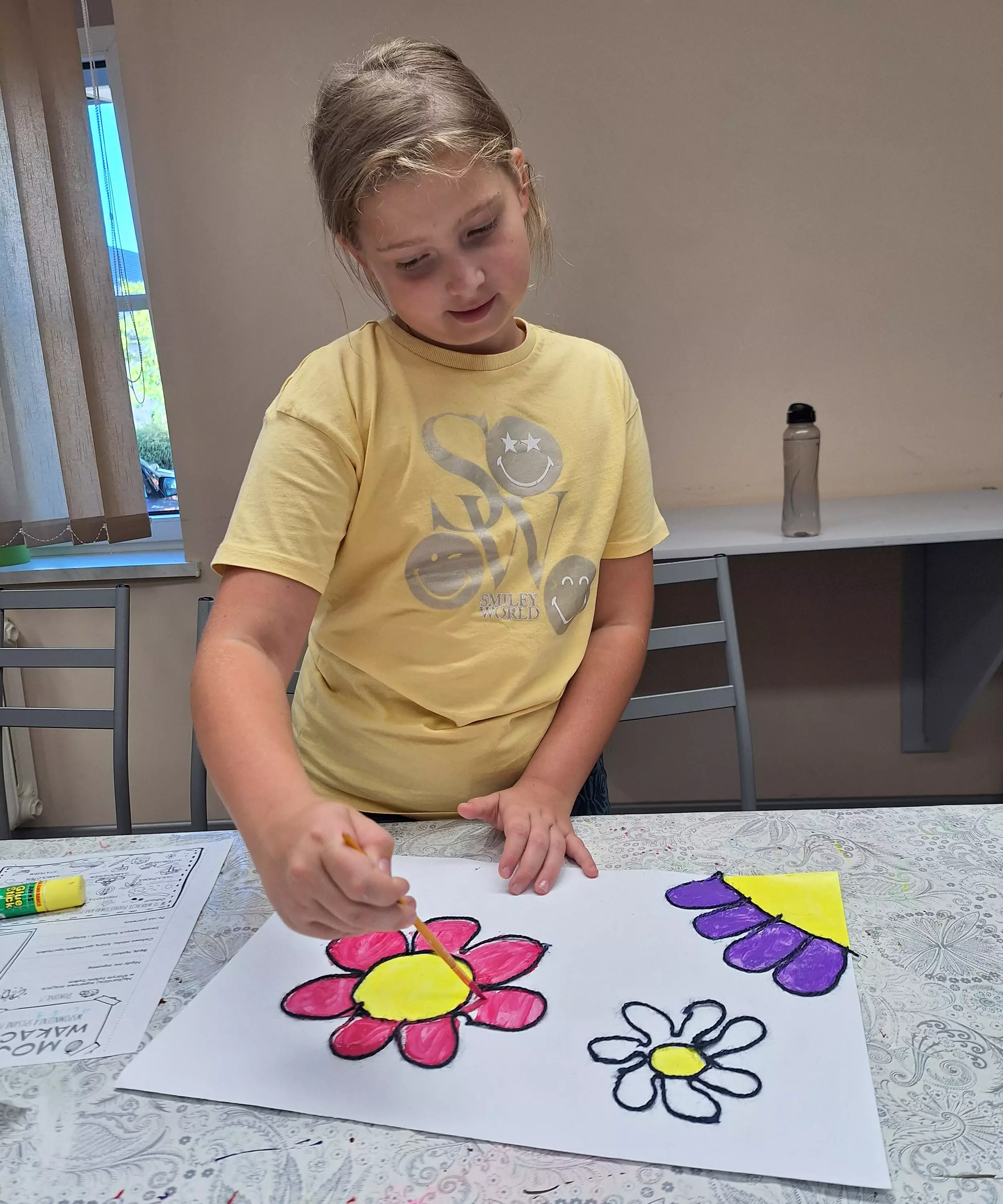 Na wczorajszych zajęciach literacko-plastycznych w Pawonkowie, dzieci przyklejając włóczkę do kartki, wyczarowały kontury wakacyjnych wspomnień, a gdy wszystko wyschło – dodały kolory farbami!