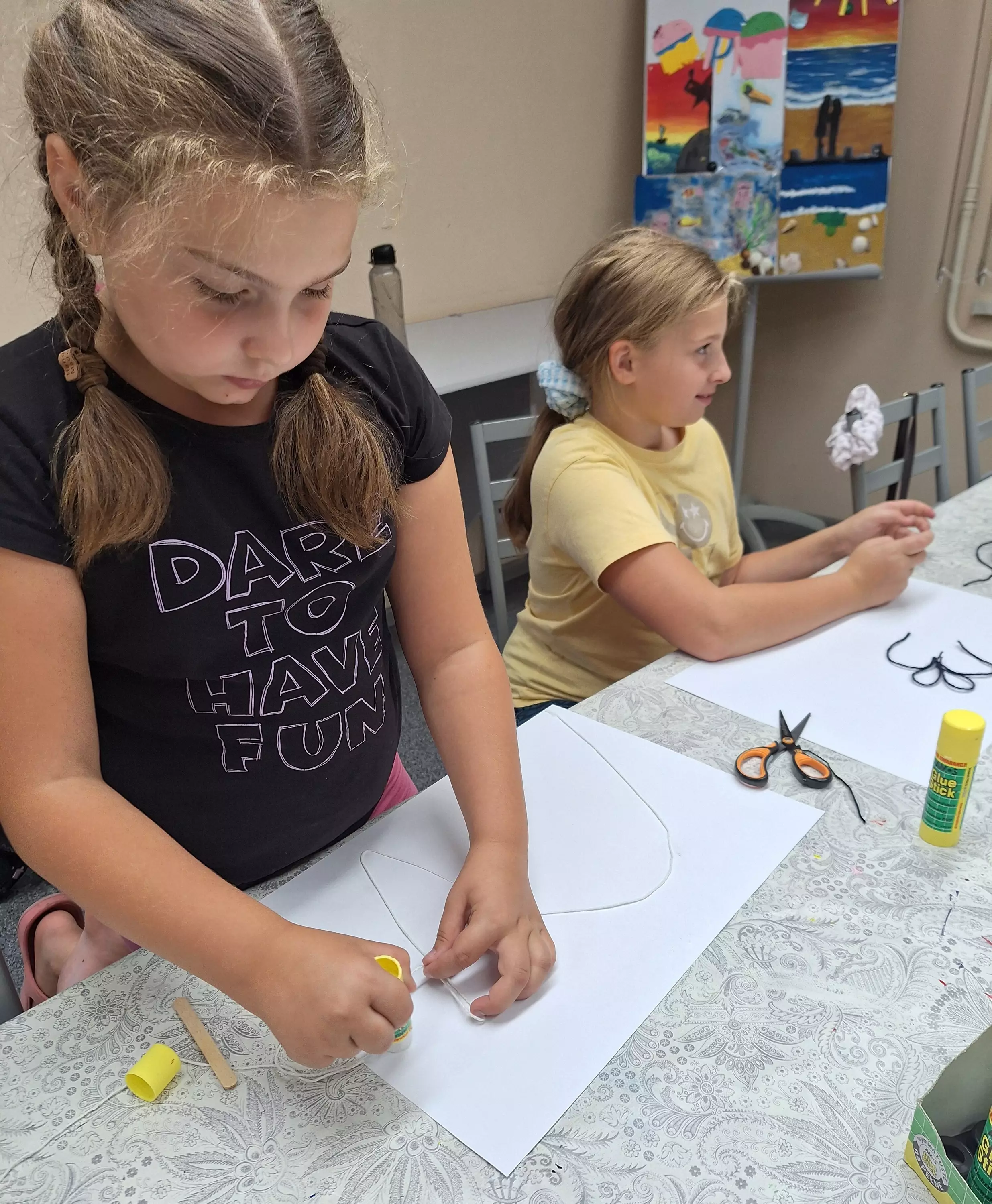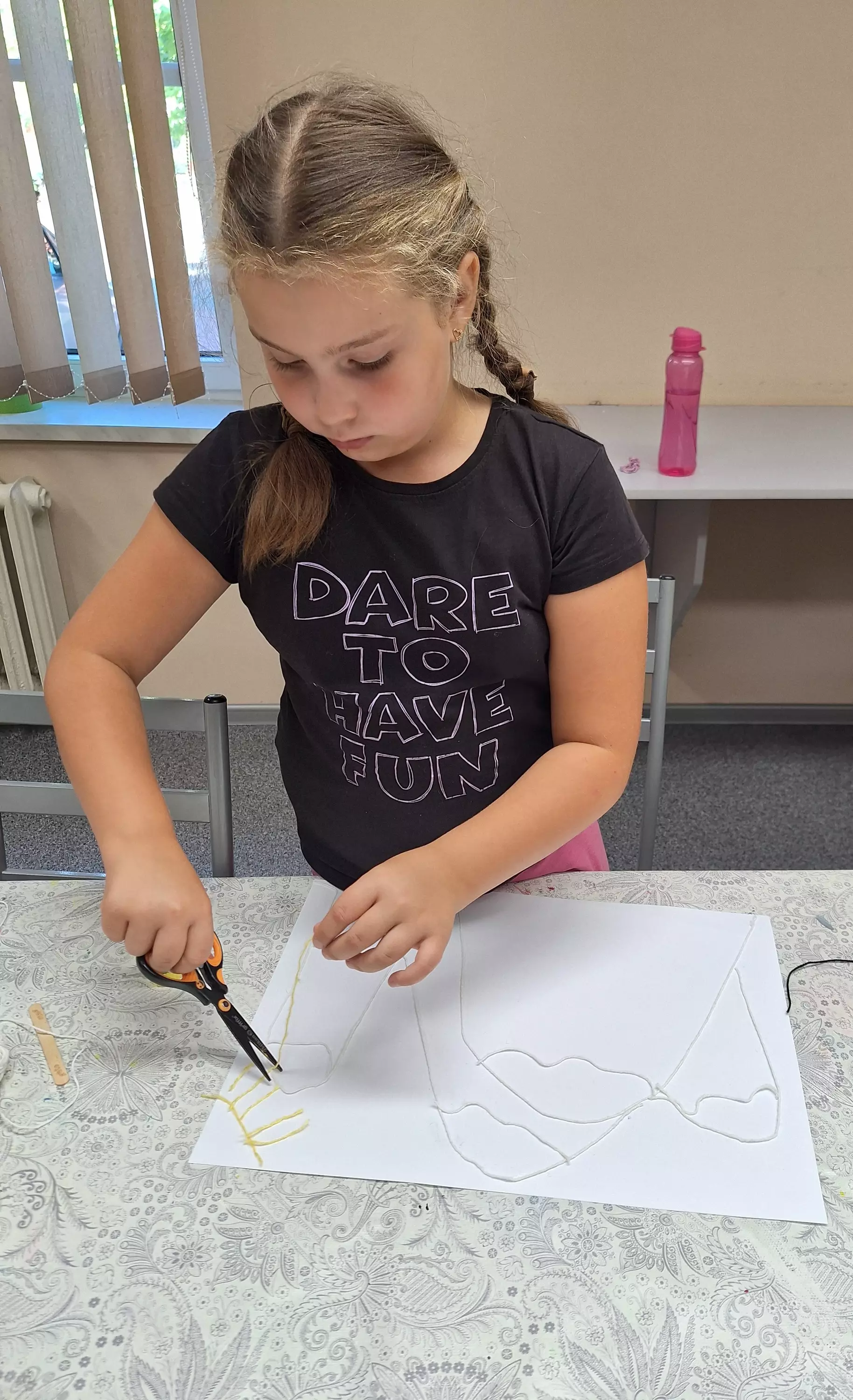 Dziewczynki wyklejają włóczką zarys obrazu.