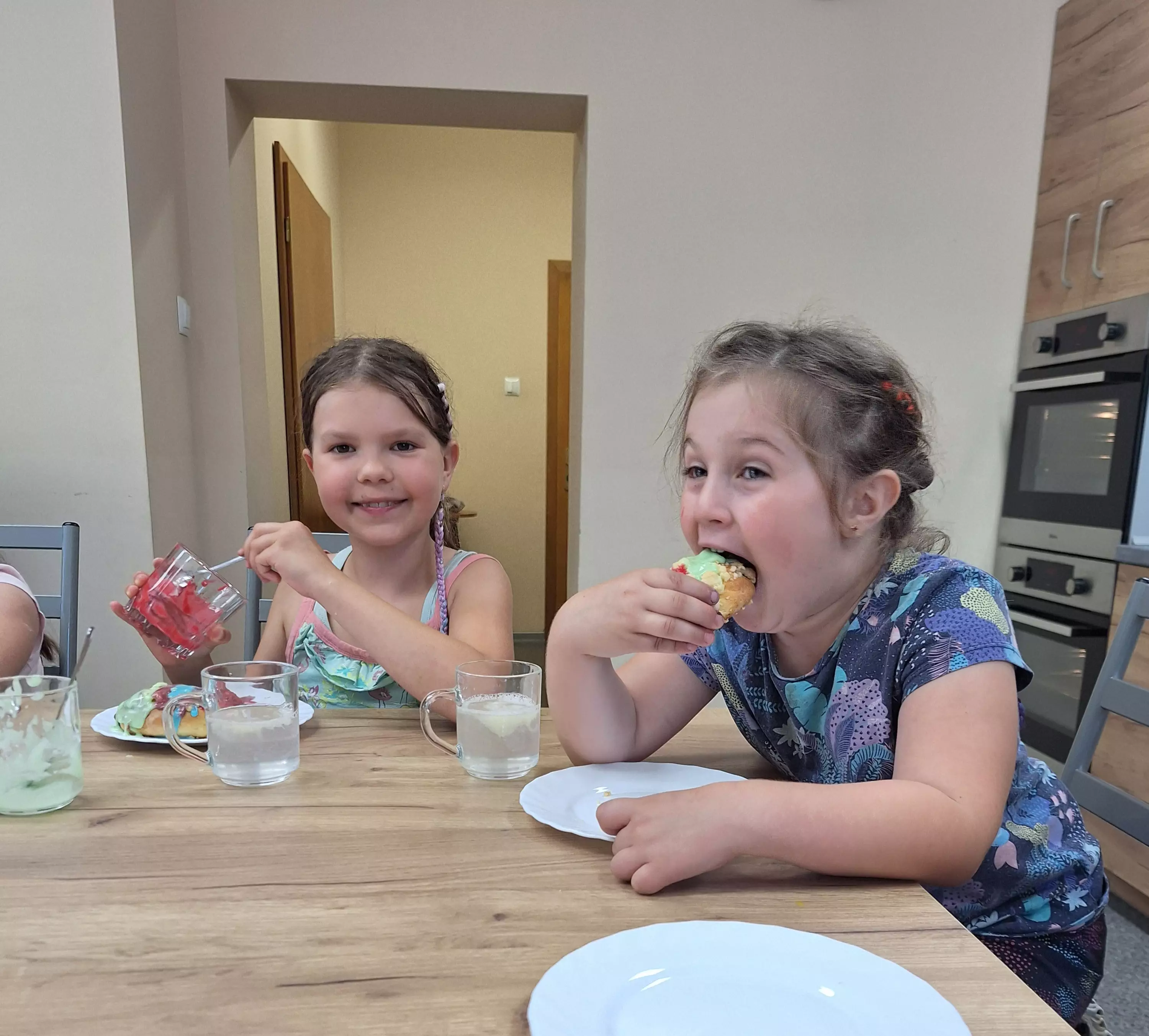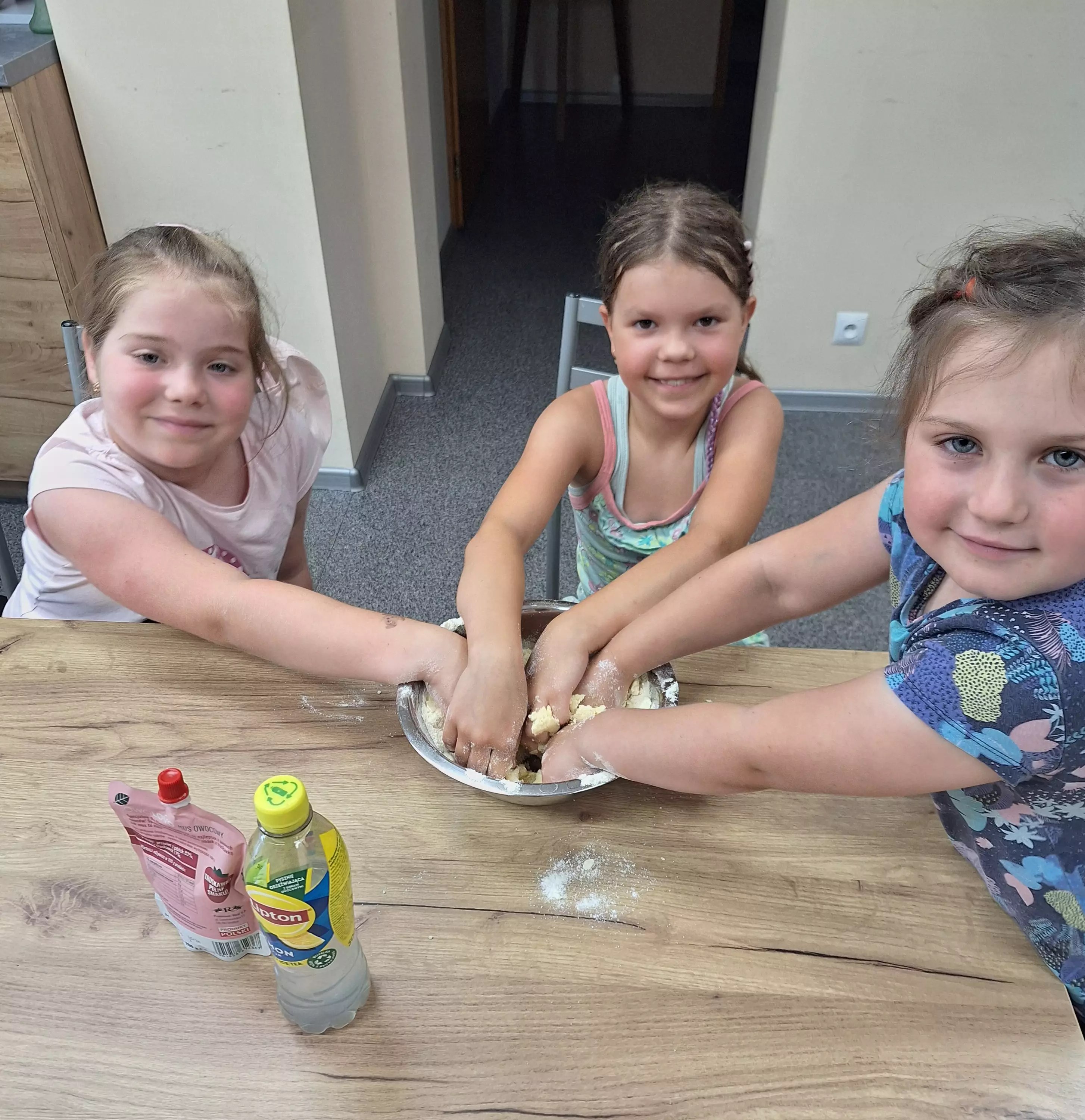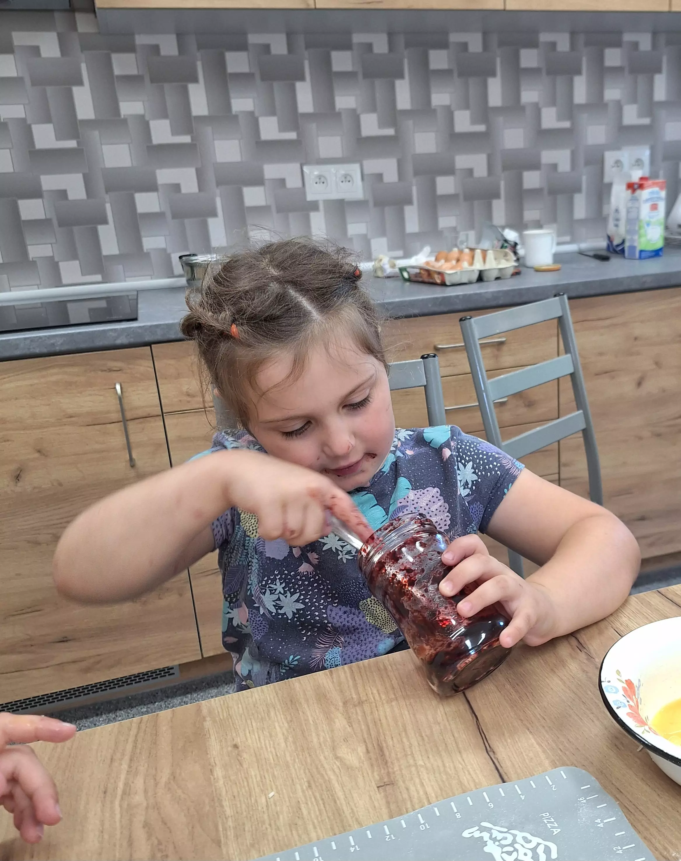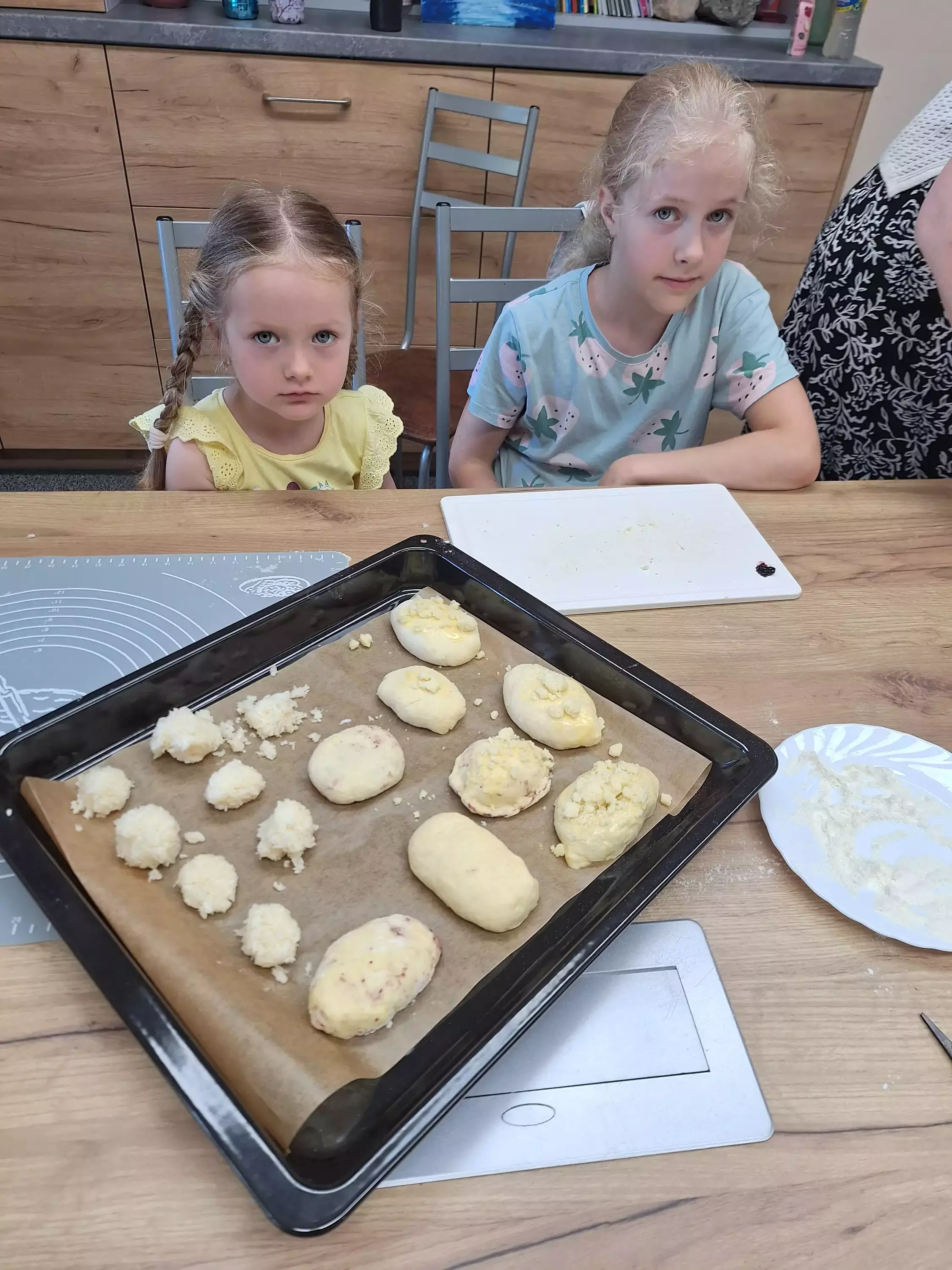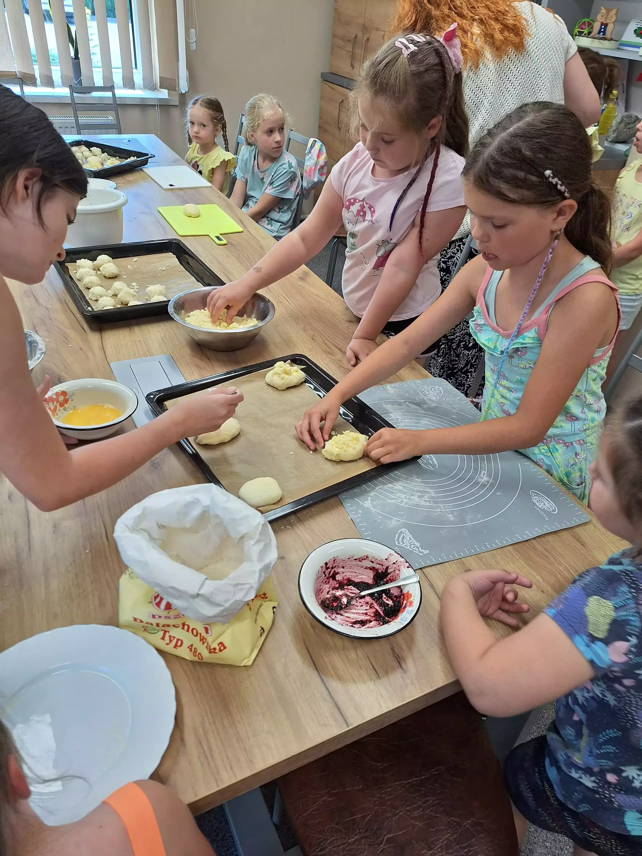 Zaczęliśmy od jagodzianek – dzieciaki w mig zabrały się za robienie ciasta, a dżem jagodowy lądował nie tylko w bułkach, ale i na nosach oraz ubraniach.