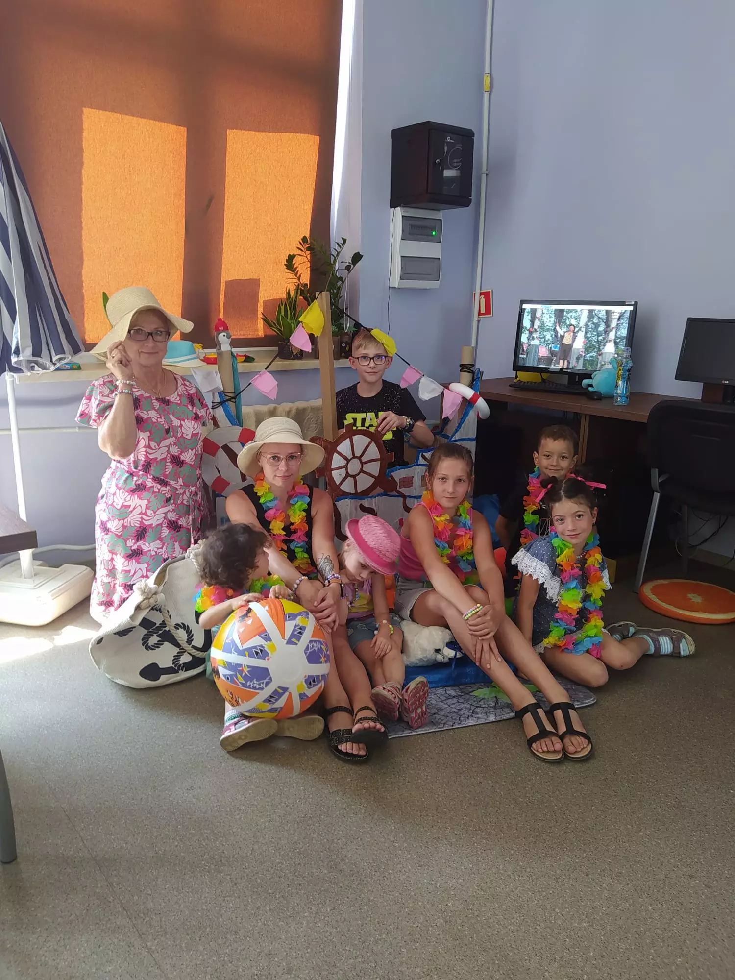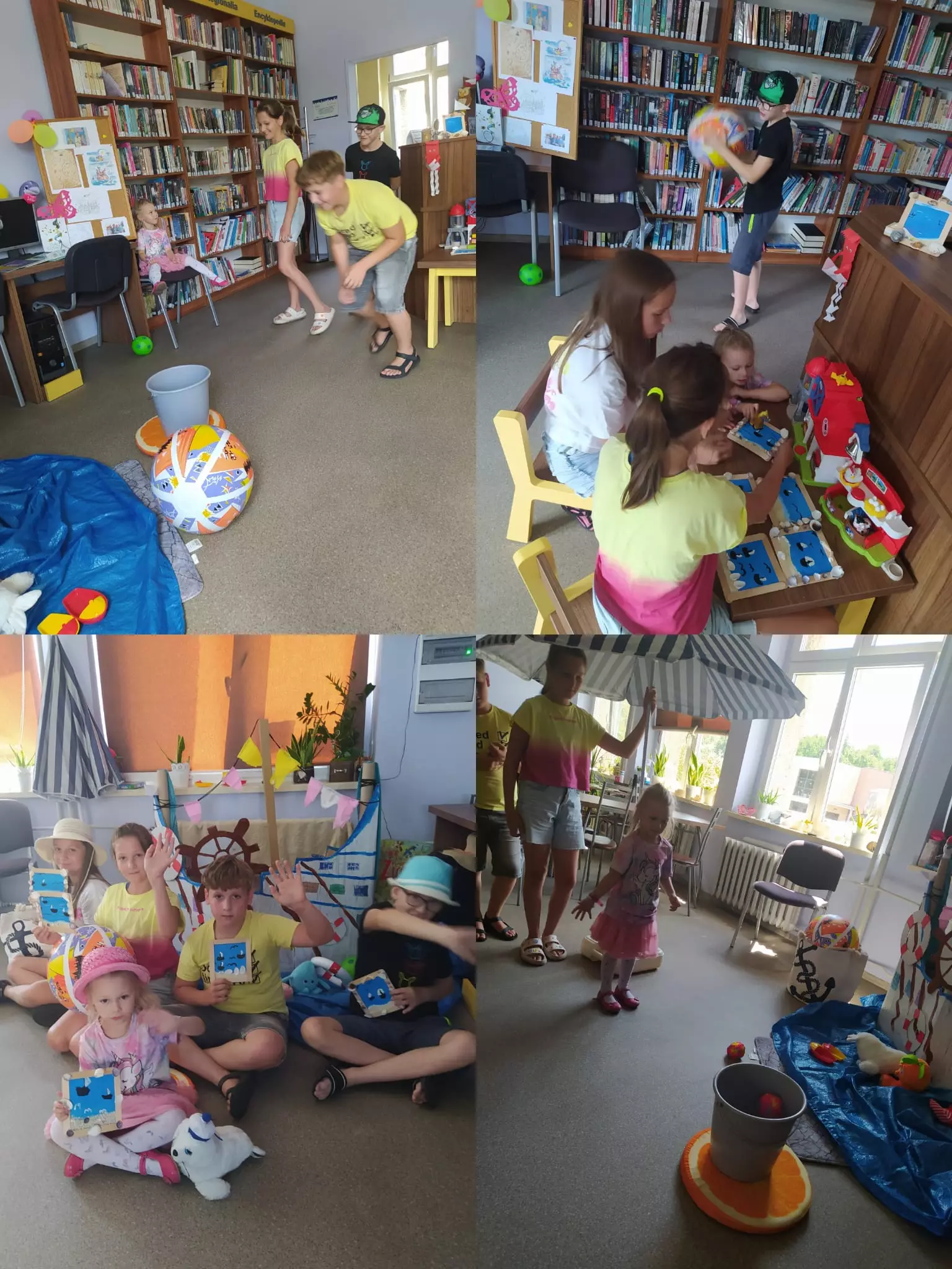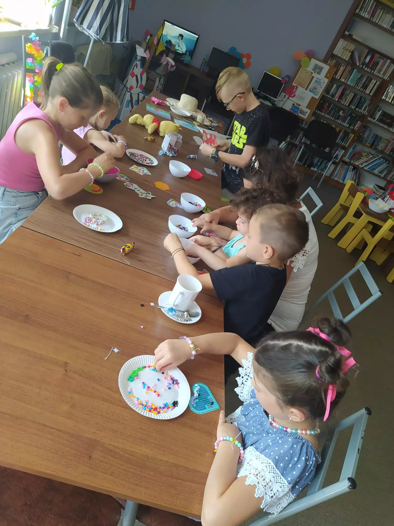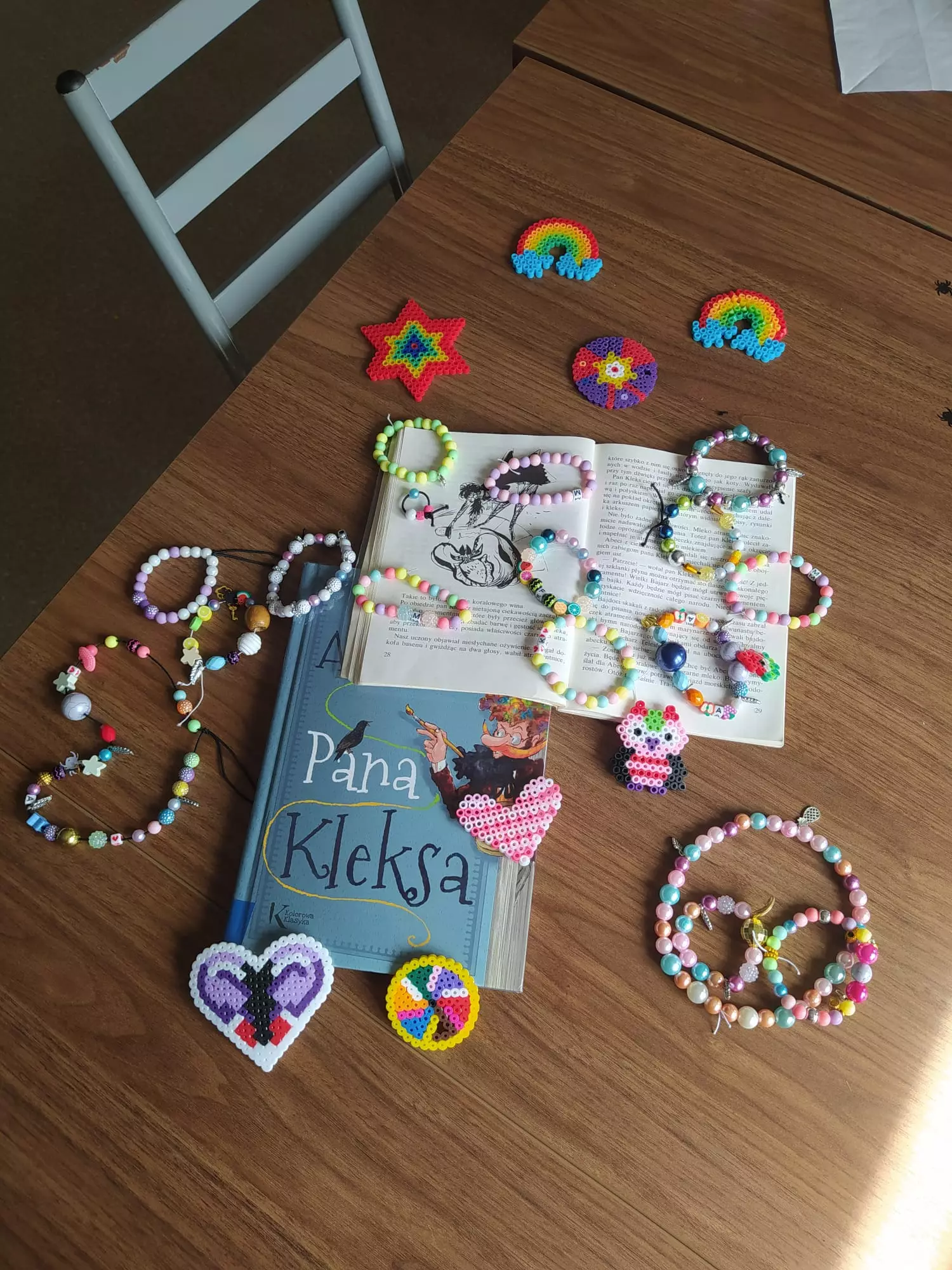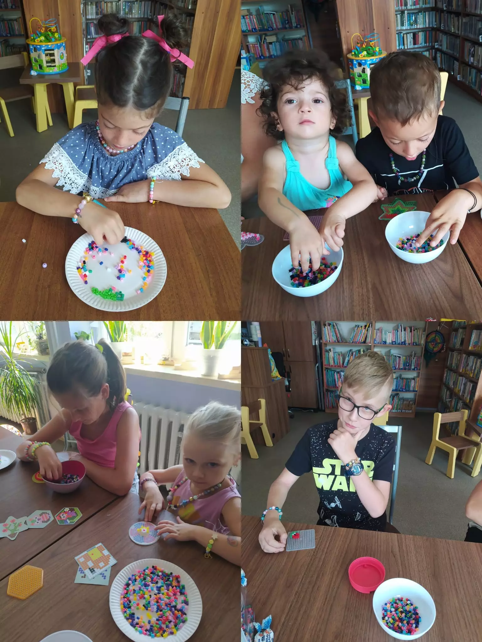 Dzieci z koralików układają różne obrazki.Praca wykonana z koralików.Kolaż zdjęć z zajęć, na których dzieci malują farbami obrazki.Kolaż zdjęć z zajęć, na których dzieci bawią się w gry zręcznościoweKolaż zdjęć z zajęć, na których dzieci układają obrazki z koralikowóKolaż zdjęć z zajęć, na których dzieci układają obrazki z koralików.Uczestnicy zajęć siedzą przy stole i układają obrazki z koralików.Wspólne zdjęcie uczestników zajęć z panią bibliotekarką na tle statku wykonanego z kartonu.Bransoletki z koralików.